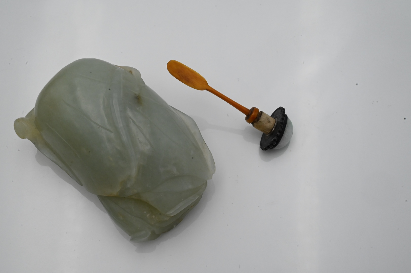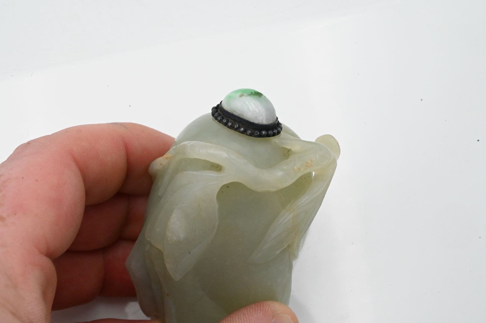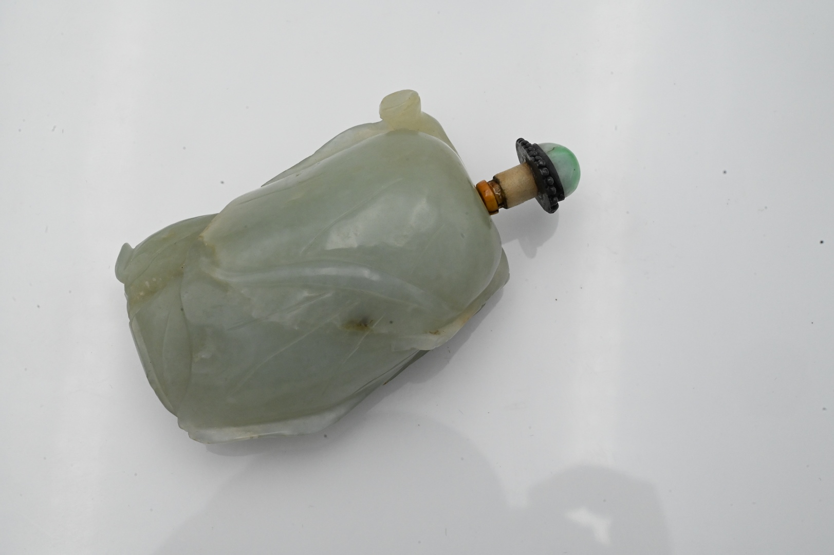 Celadon Jade Lotus Form Snuff Bottle, having jadeite stopper, height 3 inches.