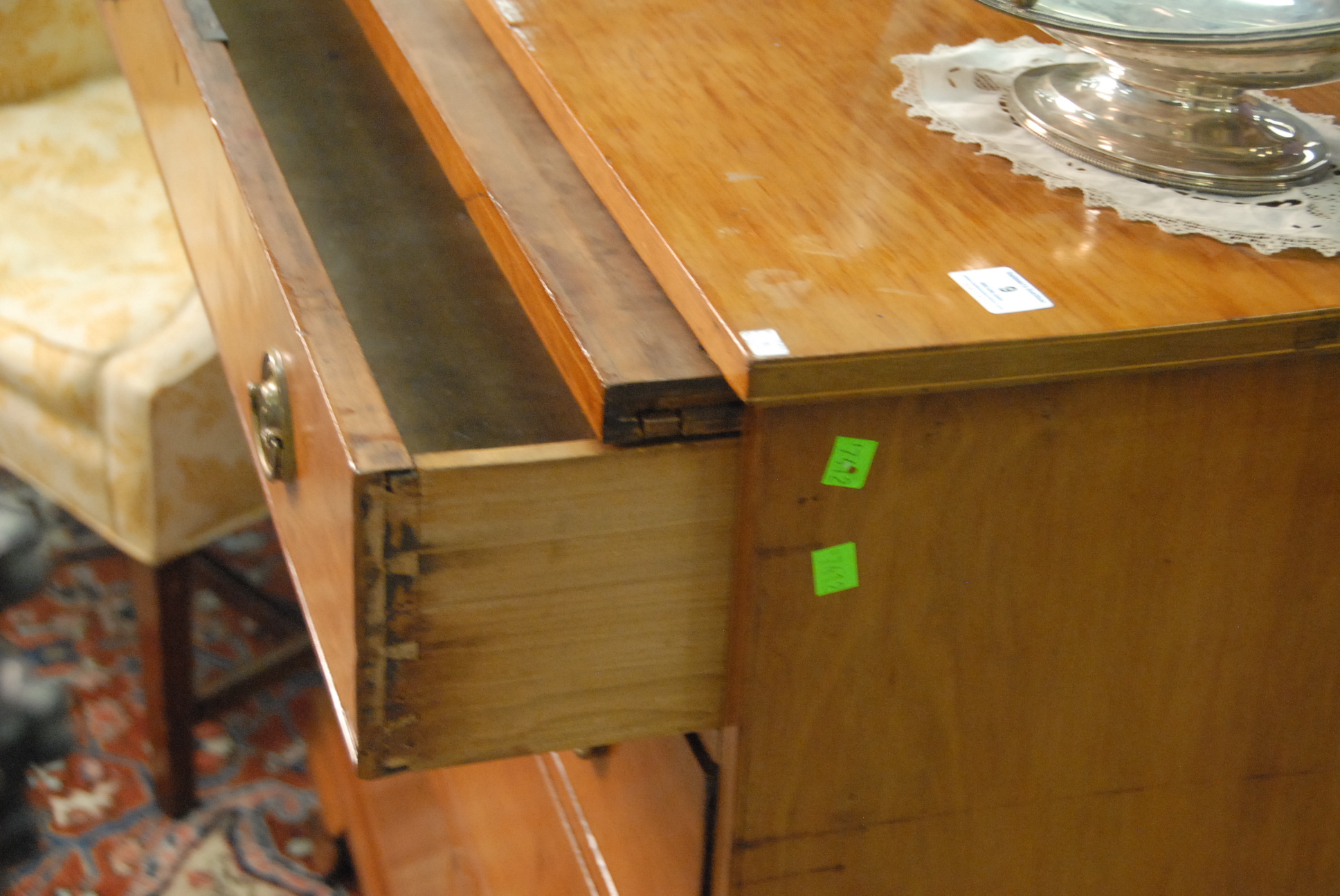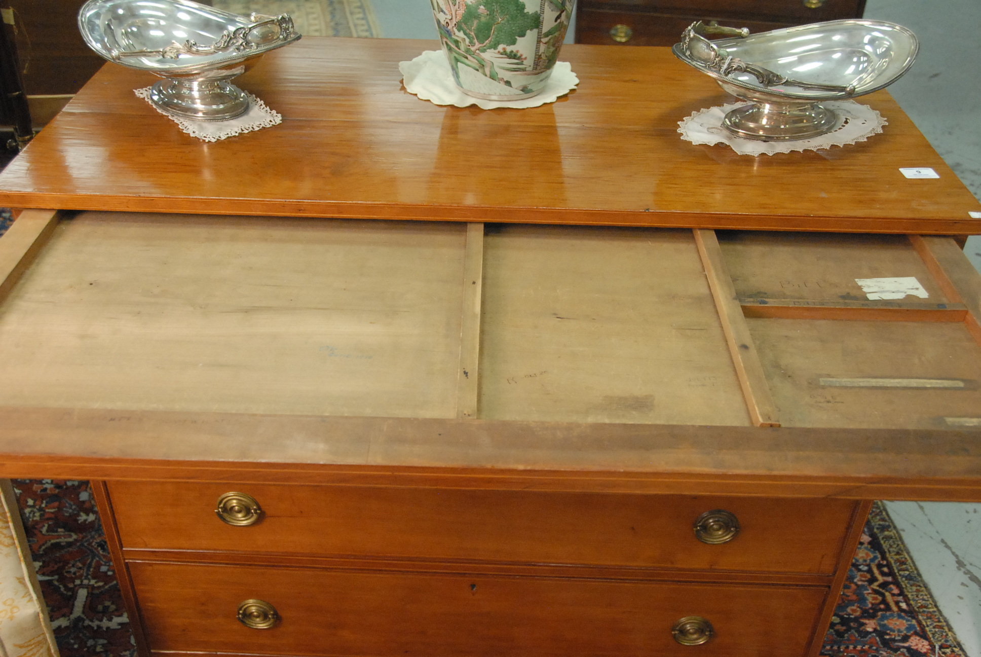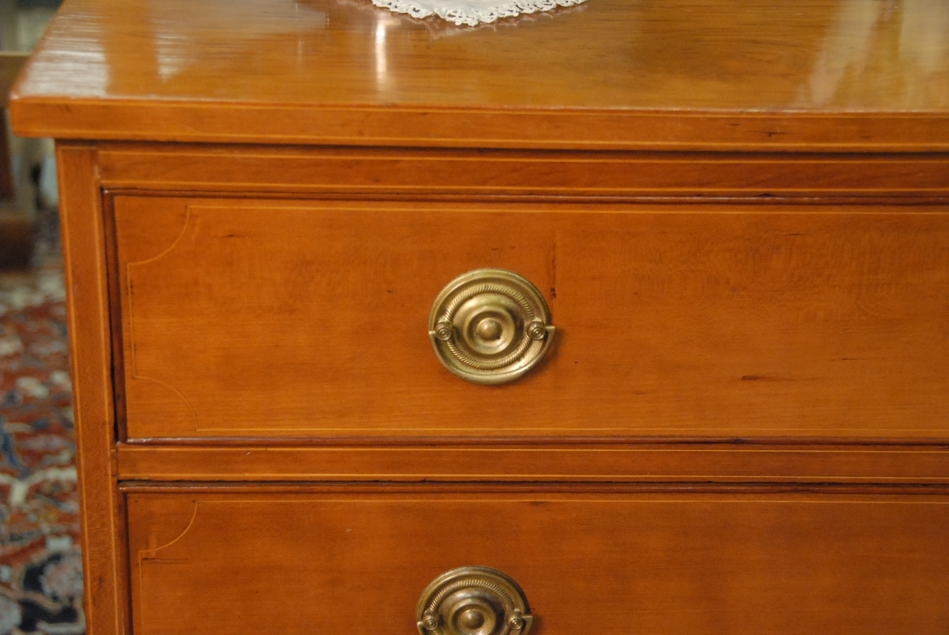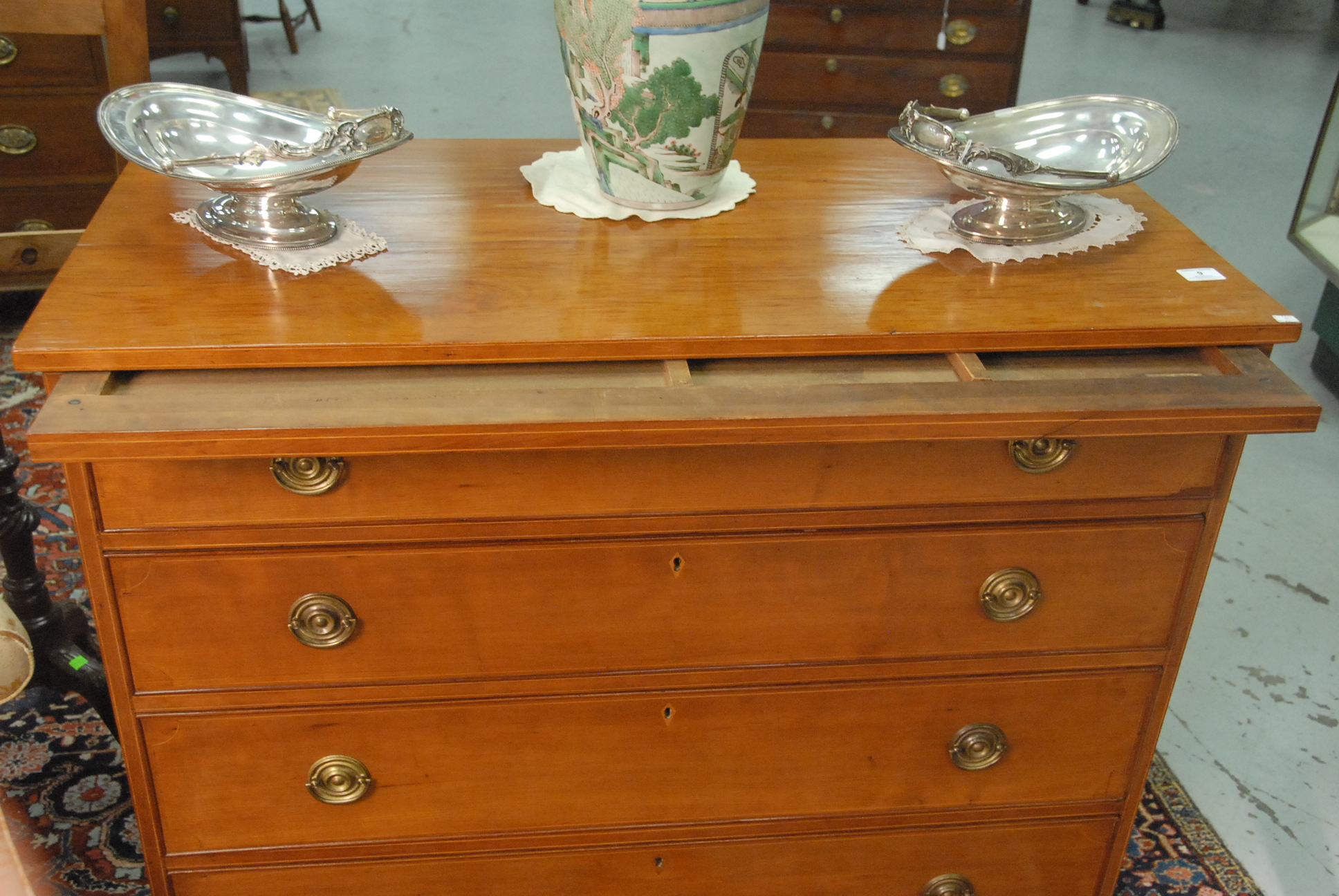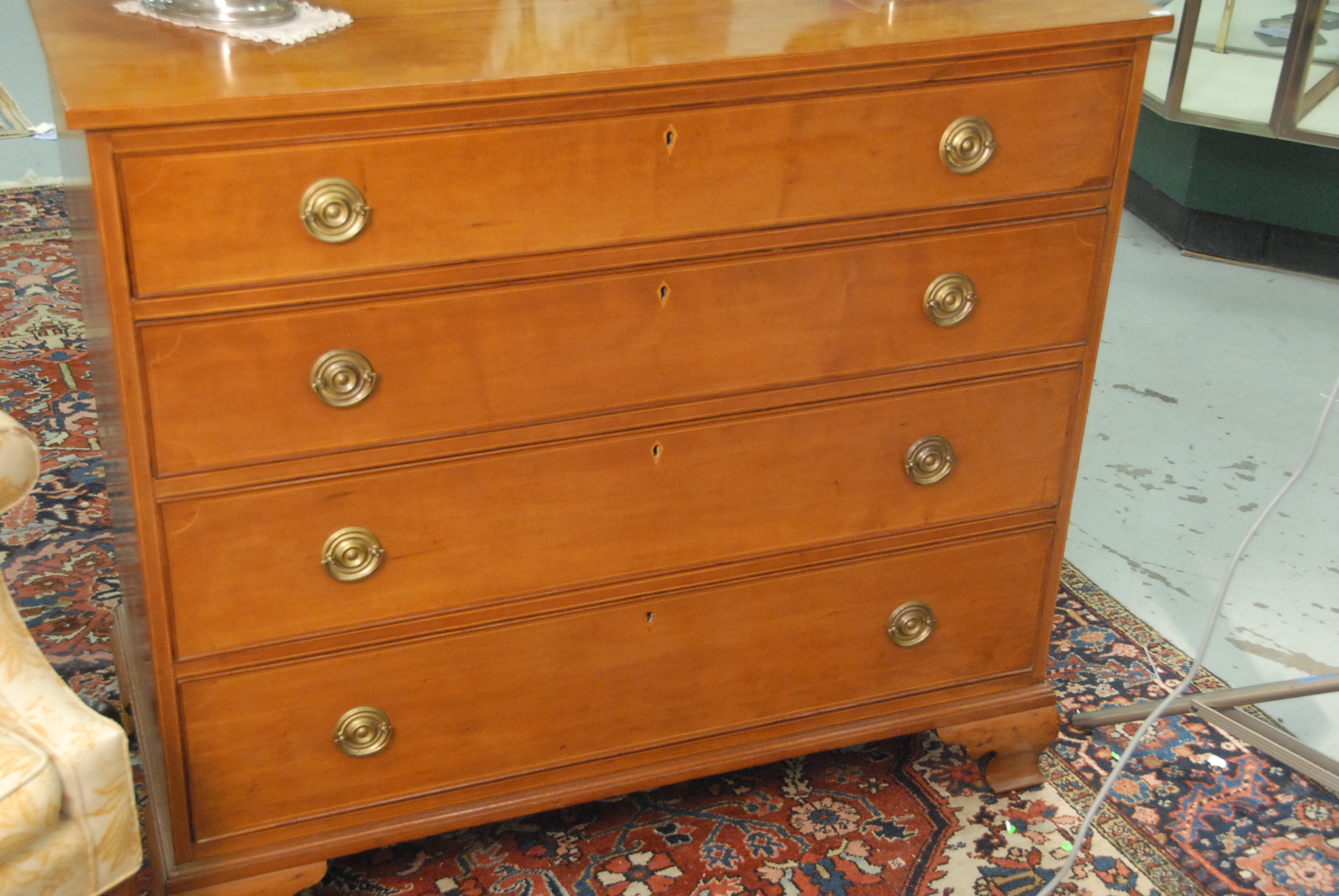 Lot 9: Chippendale cherry chest having rectangular top over pull out slide with compartments over four drawers, all set on ogee bracket feet, drawers with line inlay. ht. 38 1/2 in. wd. 42 in. dp. 21 in.