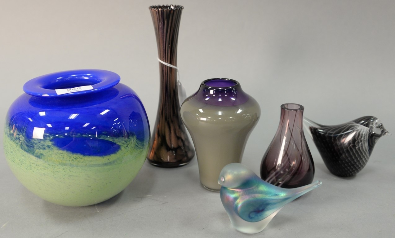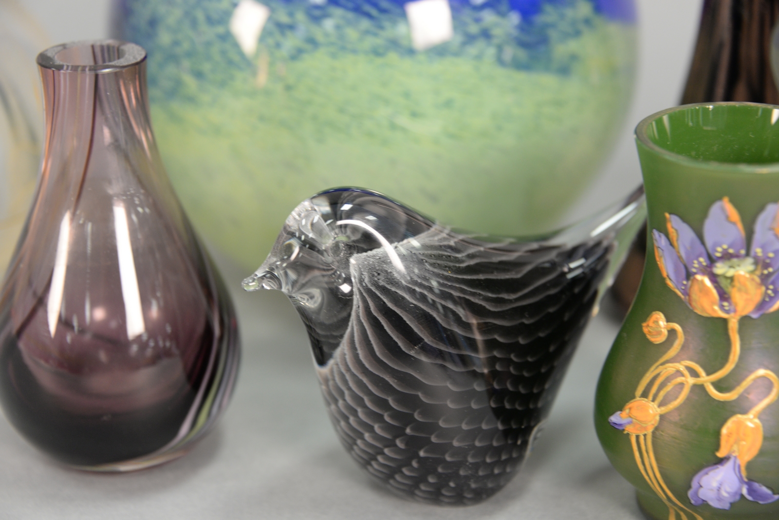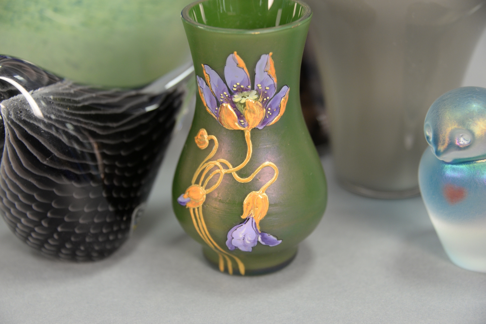 Eight piece lot to include large blue to green art glass bowl vase, Zellique Studio bird, Ronneby art glass bird, Caithness art glass bud vase, and Nonfoux purple to gray vase, an unmarked vase, Mont Joye or Moser enameled glass bud or cabinet vase, green glass with heavy enameled blossoming iris, and large etched glass bud vase having ruffled rim and enameled gilt decoration attributed to Moser. ht. 3 1/2in. to 8 3/4in.