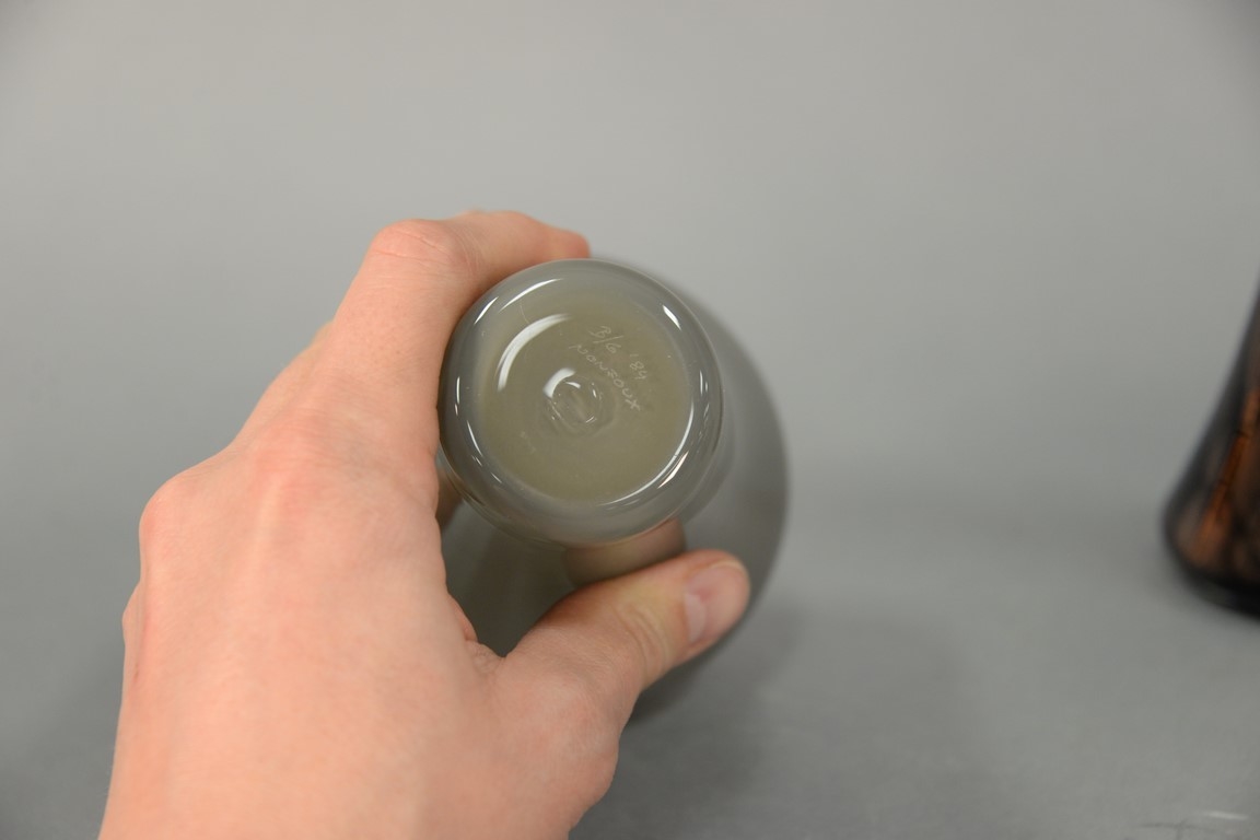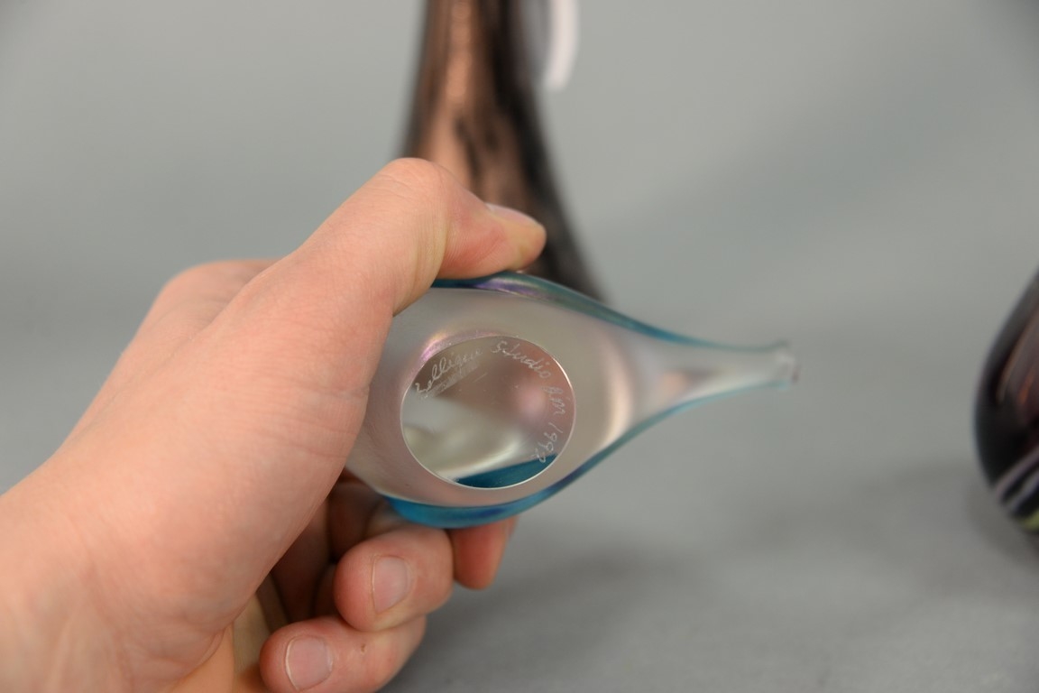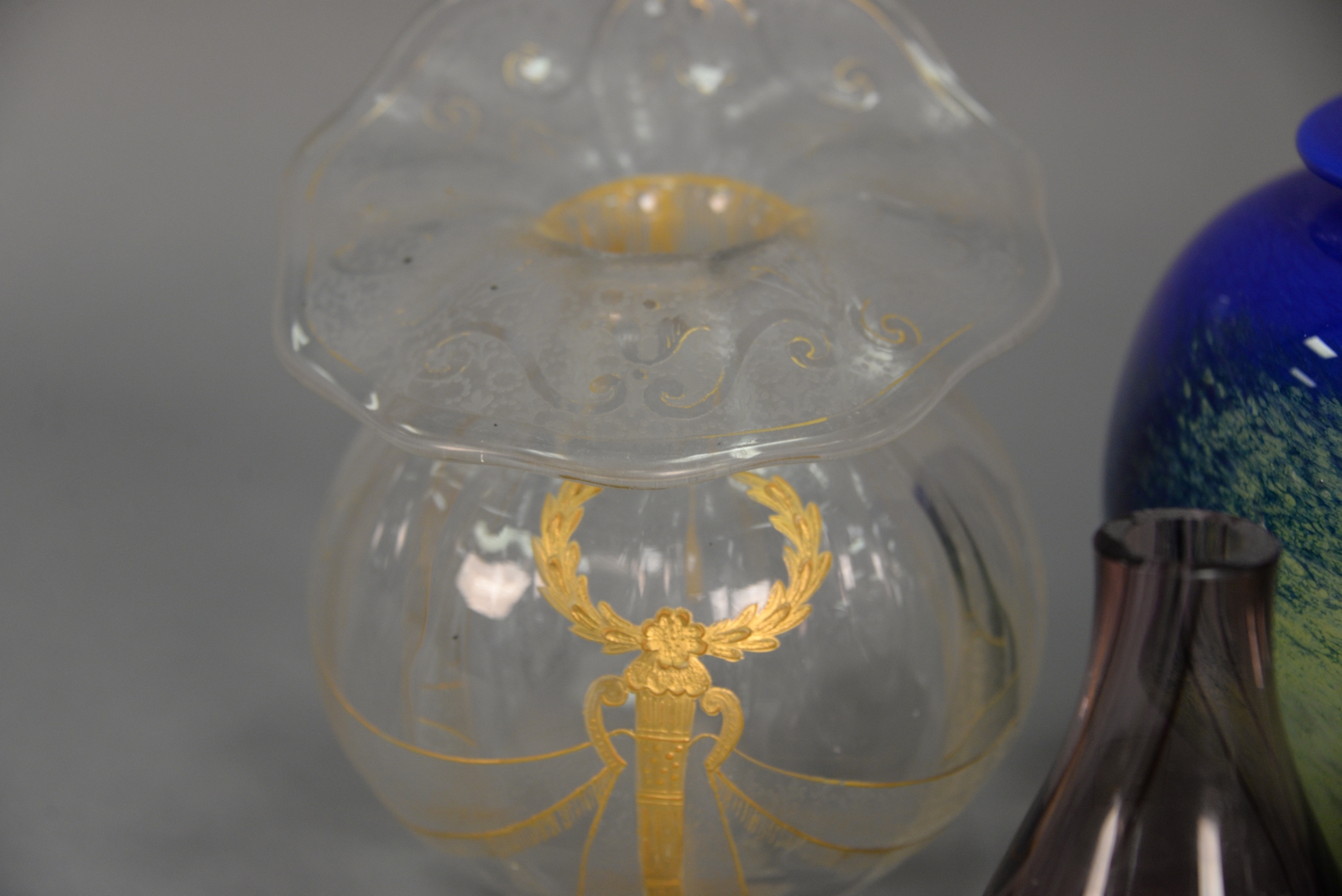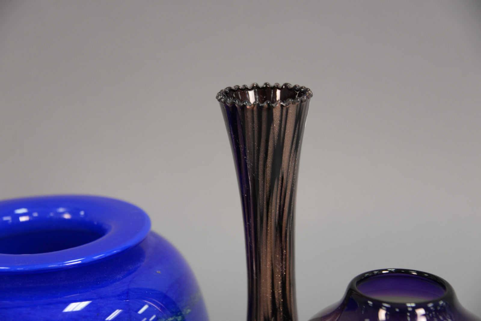 Eight piece lot to include large blue to green art glass bowl vase, Zellique Studio bird, Ronneby art glass bird, Caithness art glass bud vase, and Nonfoux purple to gray vase, an unmarked vase, Mont Joye or Moser enameled glass bud or cabinet vase, green glass with heavy enameled blossoming iris, and large etched glass bud vase having ruffled rim and enameled gilt decoration attributed to Moser. ht. 3 1/2in. to 8 3/4in.
