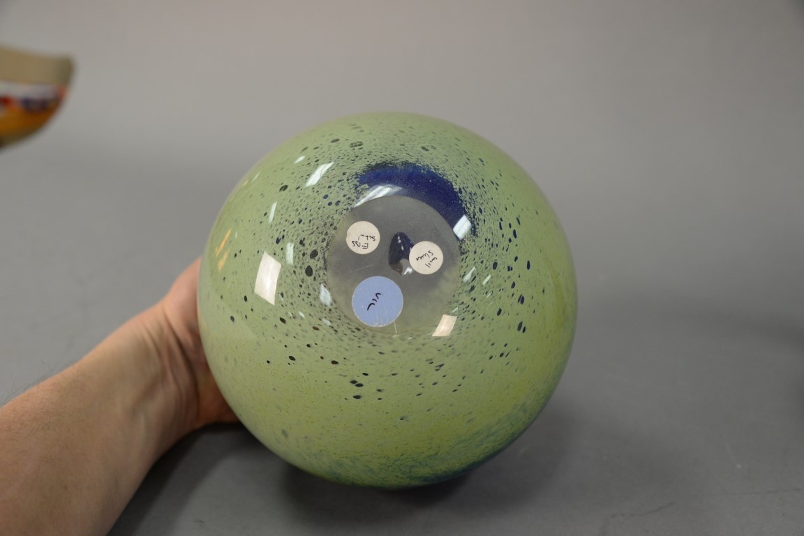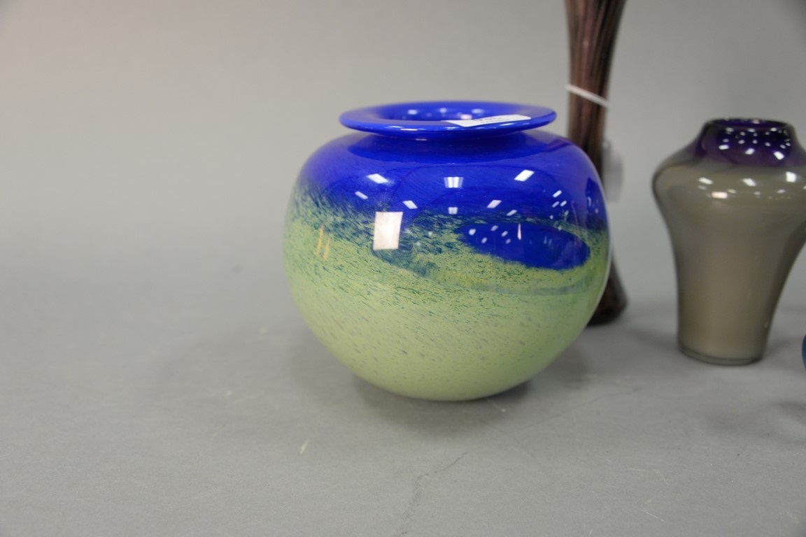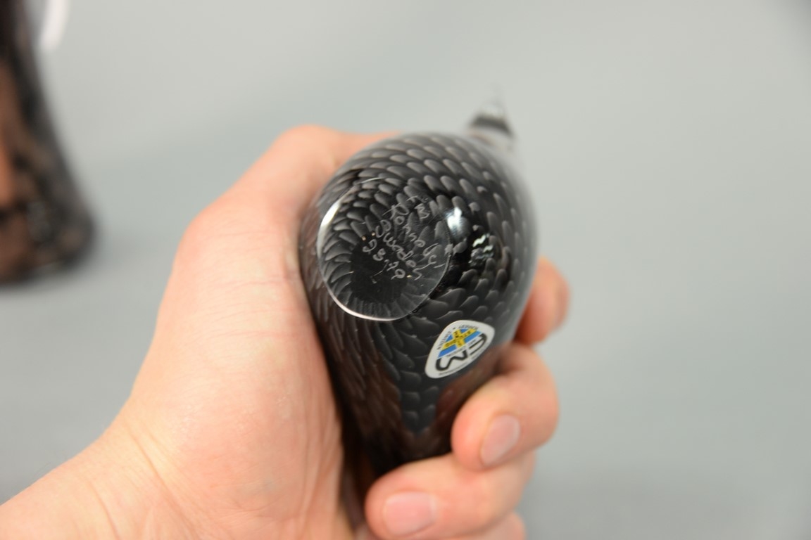 Lot 9: Eight piece lot to include large blue to green art glass bowl vase, Zellique Studio bird, Ronneby art glass bird, Caithness art glas…