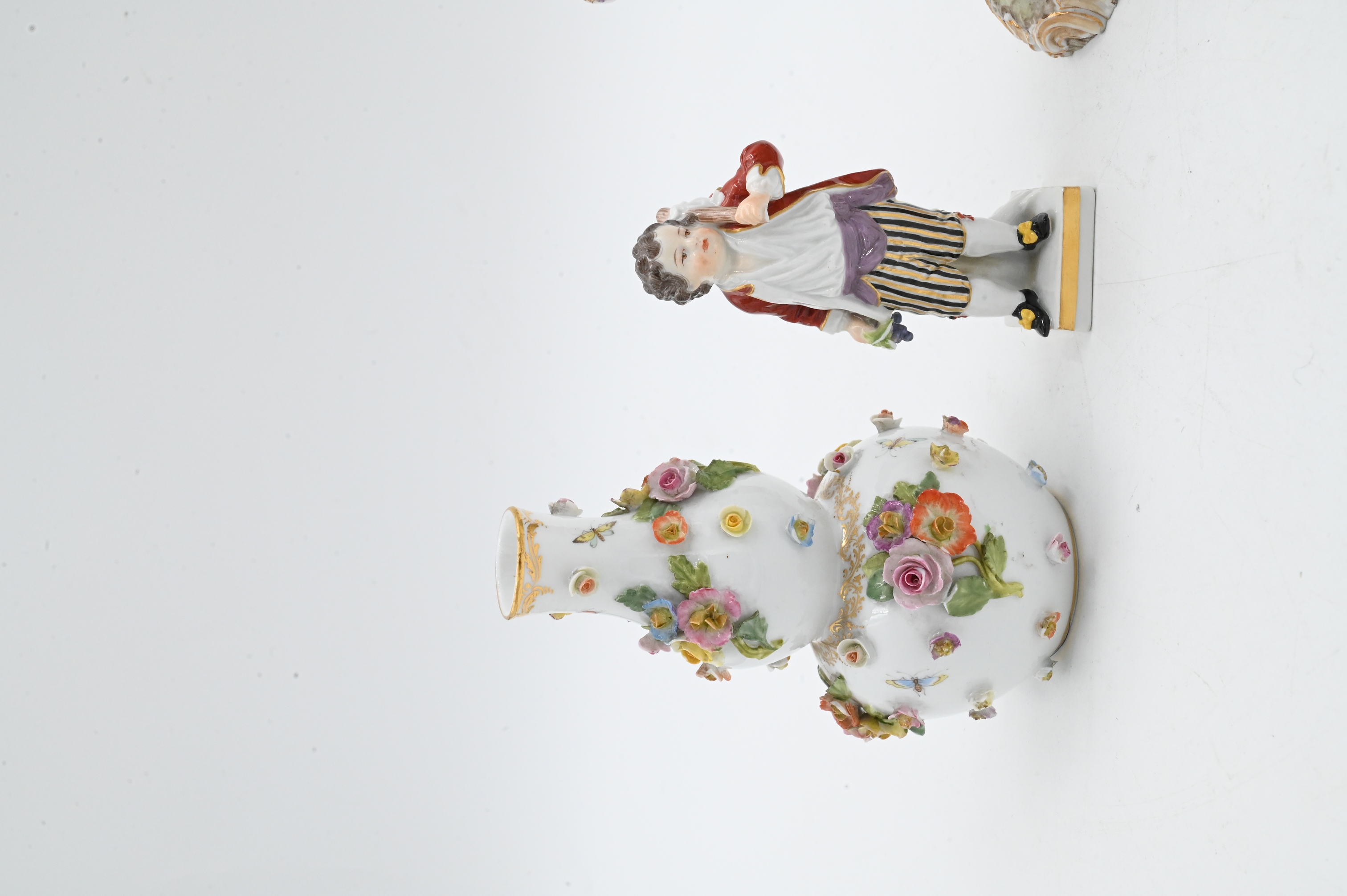 to include three Meissen pieces one boy with grapes, one boy with stick, and a vase, alone with one KPM boy with sheep, and one man with violin