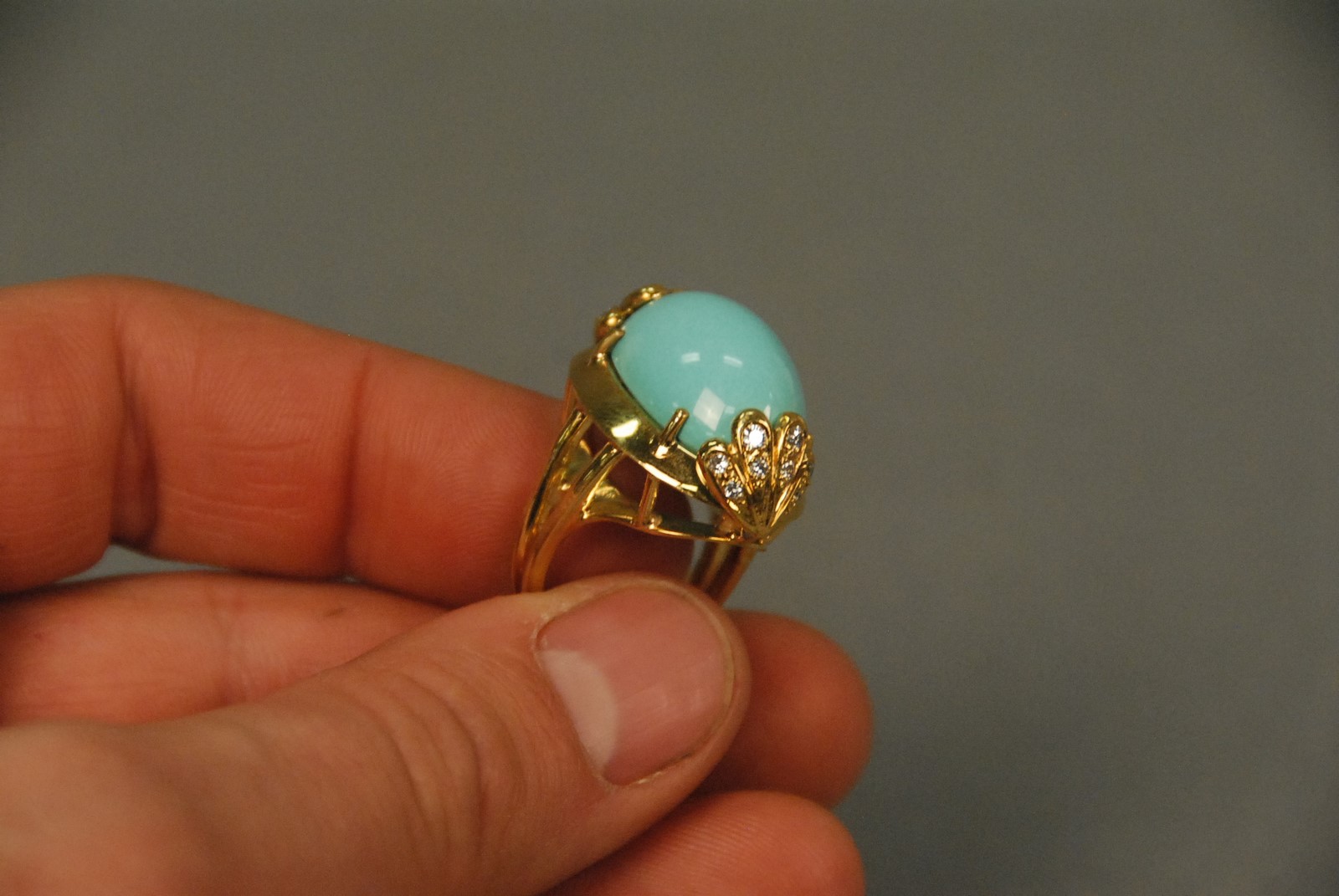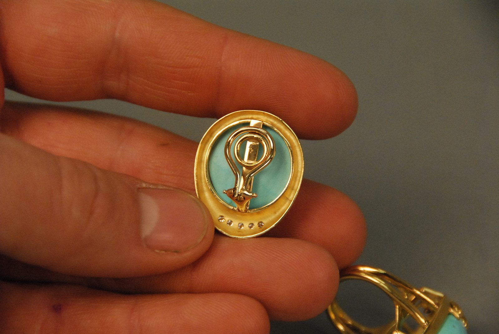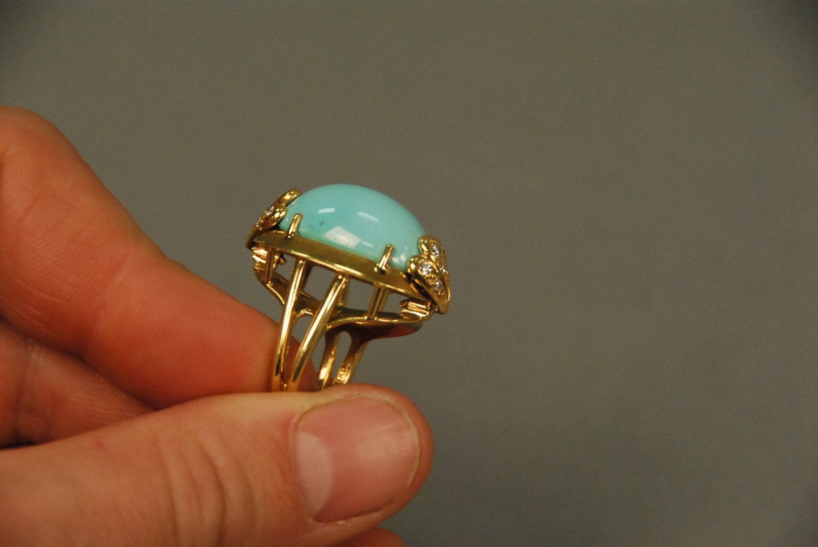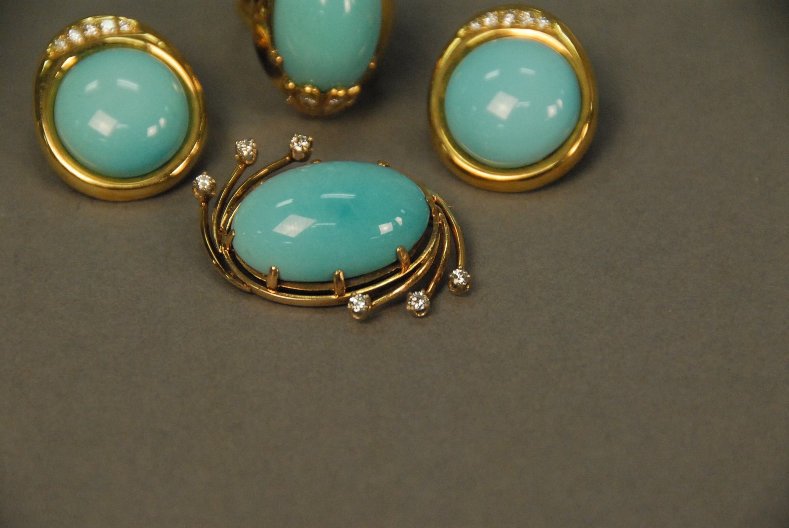 Lot 9: Four piece lot to include 18K gold ring set with large turquoise and sixteen diamonds signed Celline, pair of 18K gold matching earrings each with five diamonds signed Celline, and 14K gold brooch with large turquoise and six diamonds. 48.7 total gra