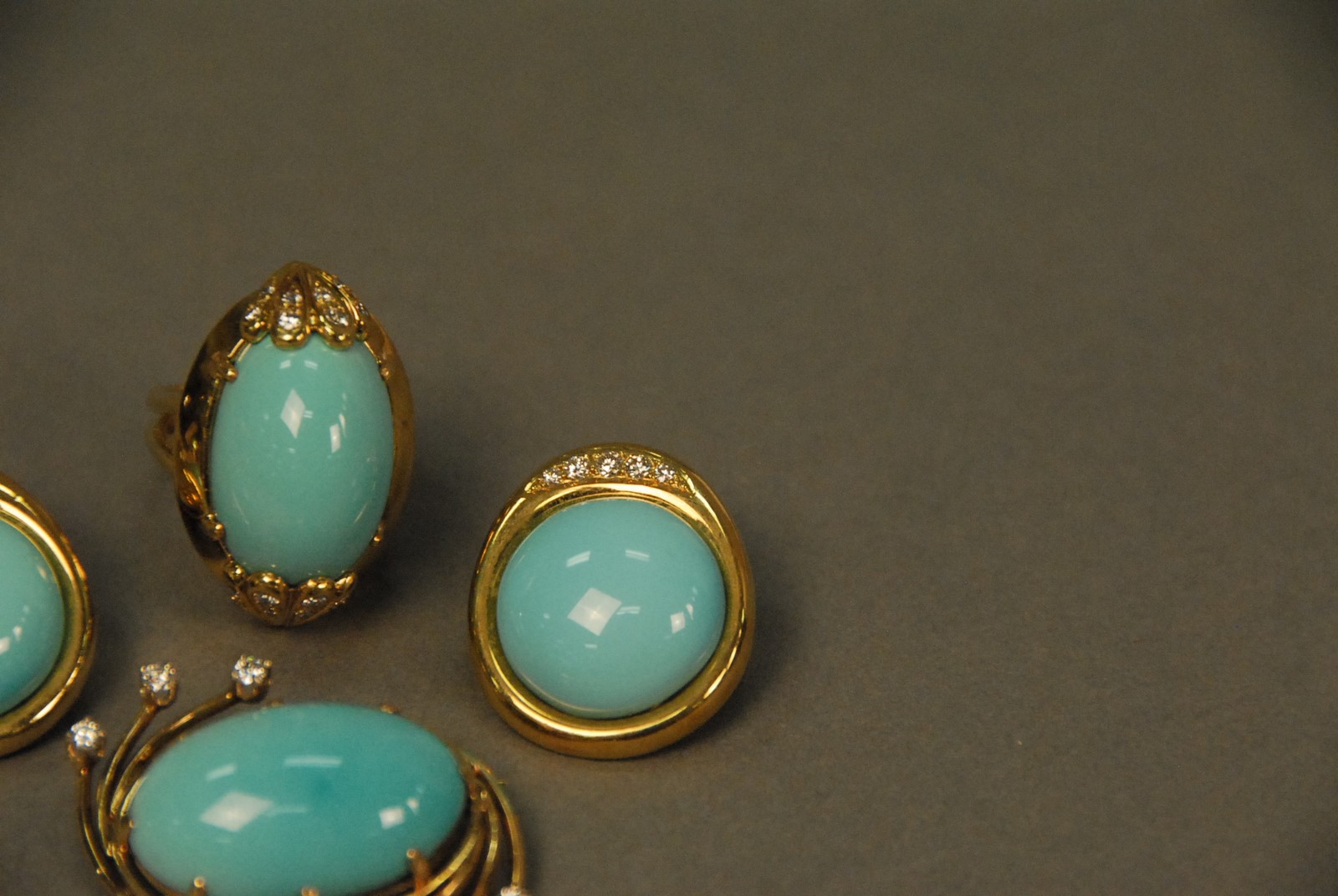 Four piece lot to include 18K gold ring set with large turquoise and sixteen diamonds signed Celline, pair of 18K gold matching earrings each with five diamonds signed Celline, and 14K gold brooch with large turquoise and six diamonds. 48.7 total grams Provenance: Property from a Private Collection Sold for the Benefit of the Virginia Historical Society.