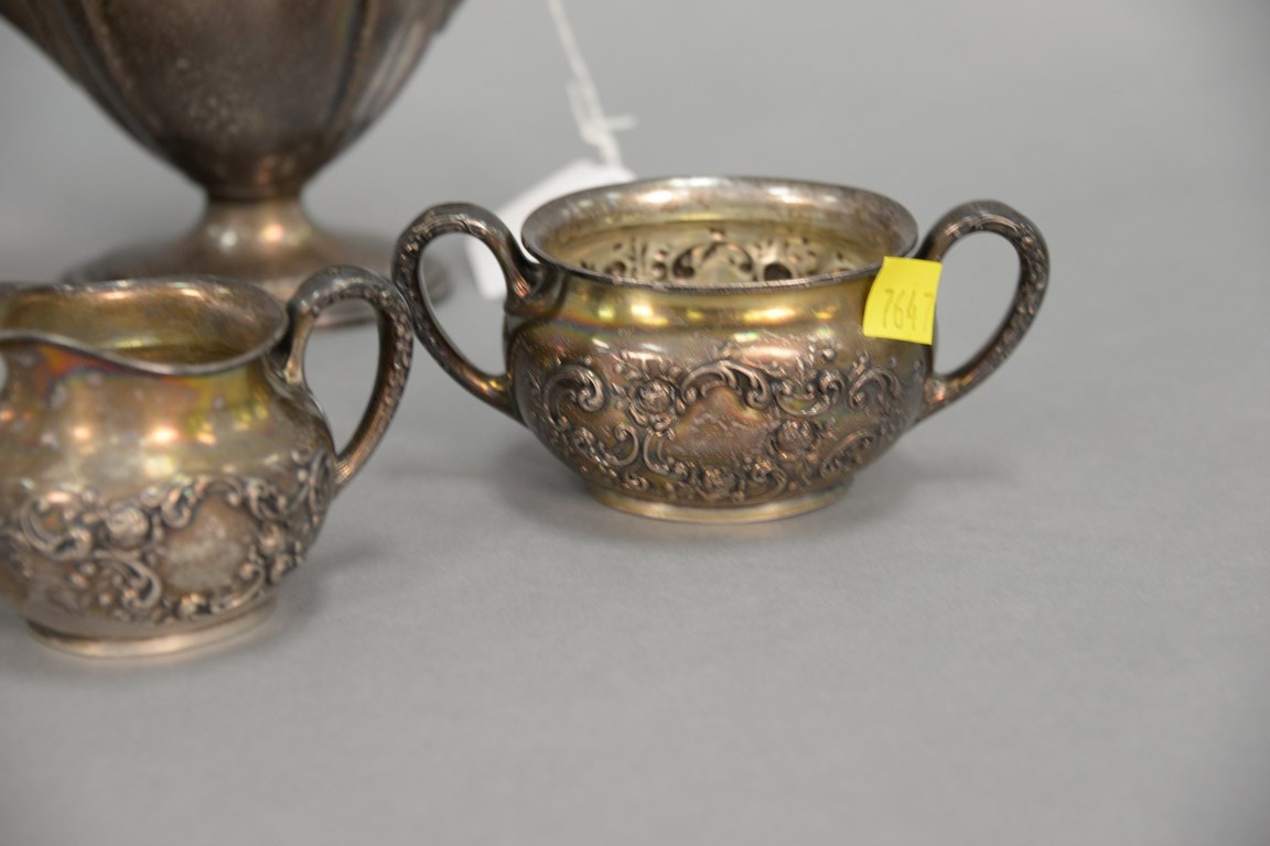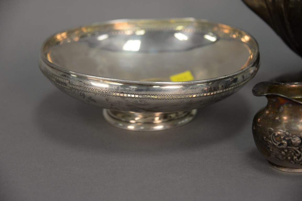 Lot 9: Four Sterling pieces to include creamer, sugar bowl, teapot and a footed bowl, 27.7 t oz. footed bowl: ht. 3 in. lg. 9 in.