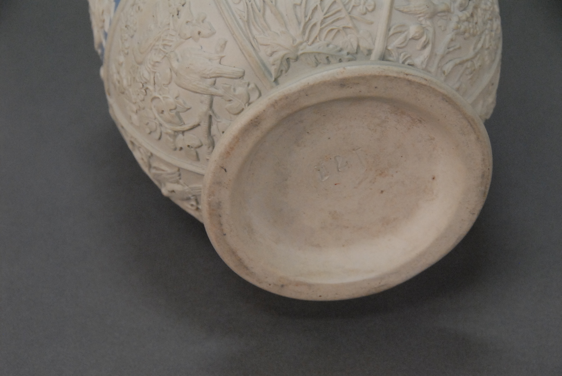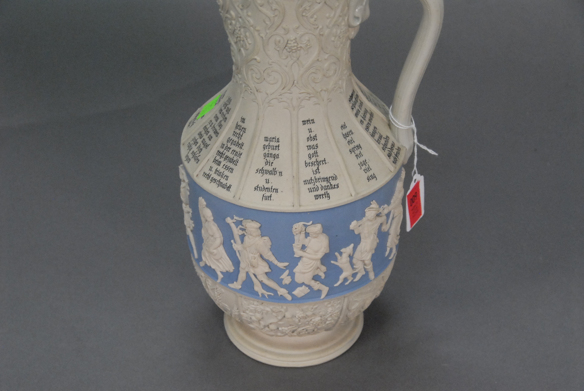 Lot 9: German salt glazed beaker with pewter top and three dimensional classical figures, ht. 15in.