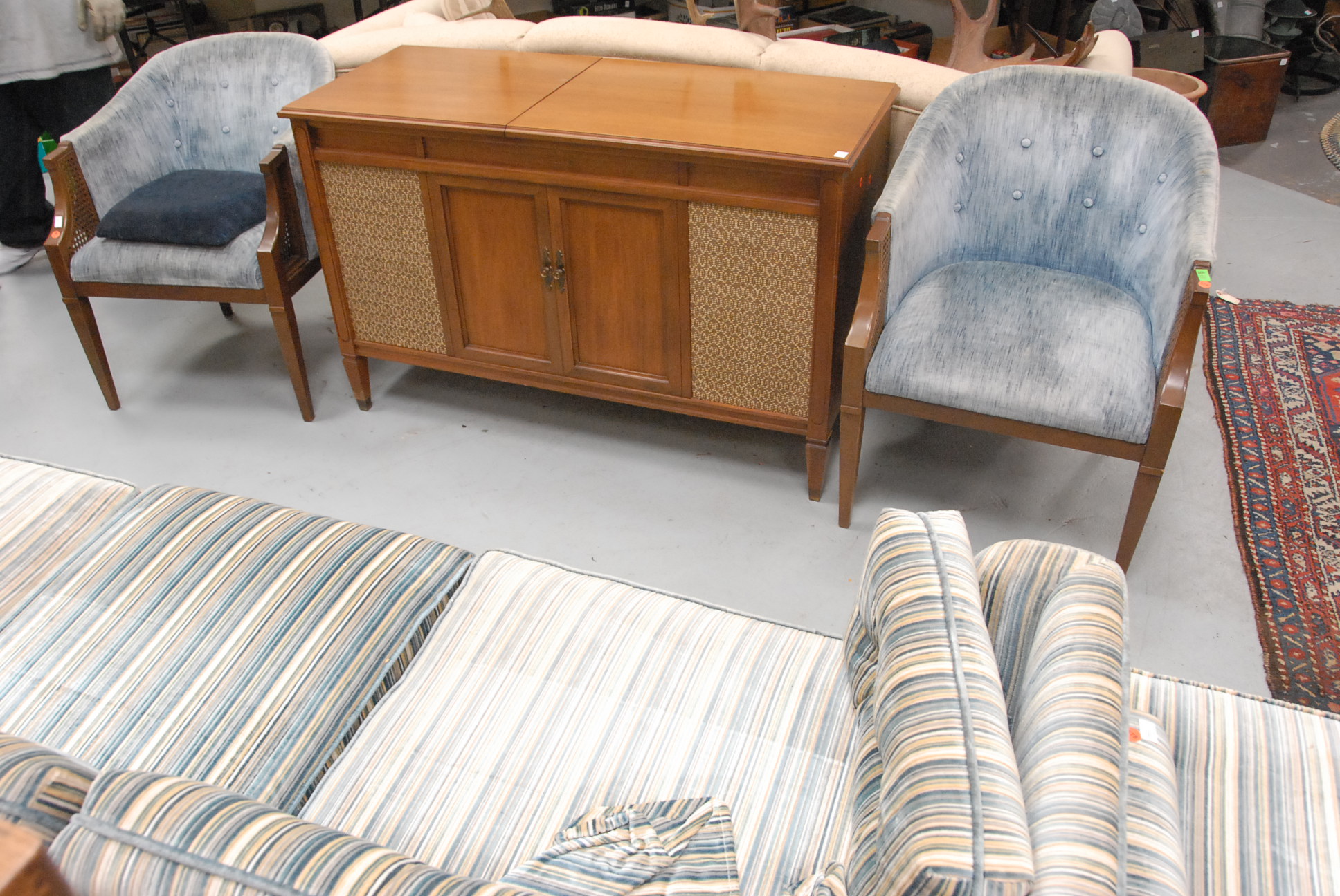 Group lot to include a sofa, matching chair, two armchairs, and a hi fi stereo in a cabinet.