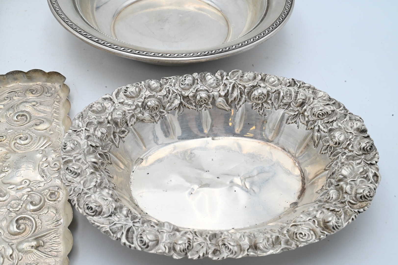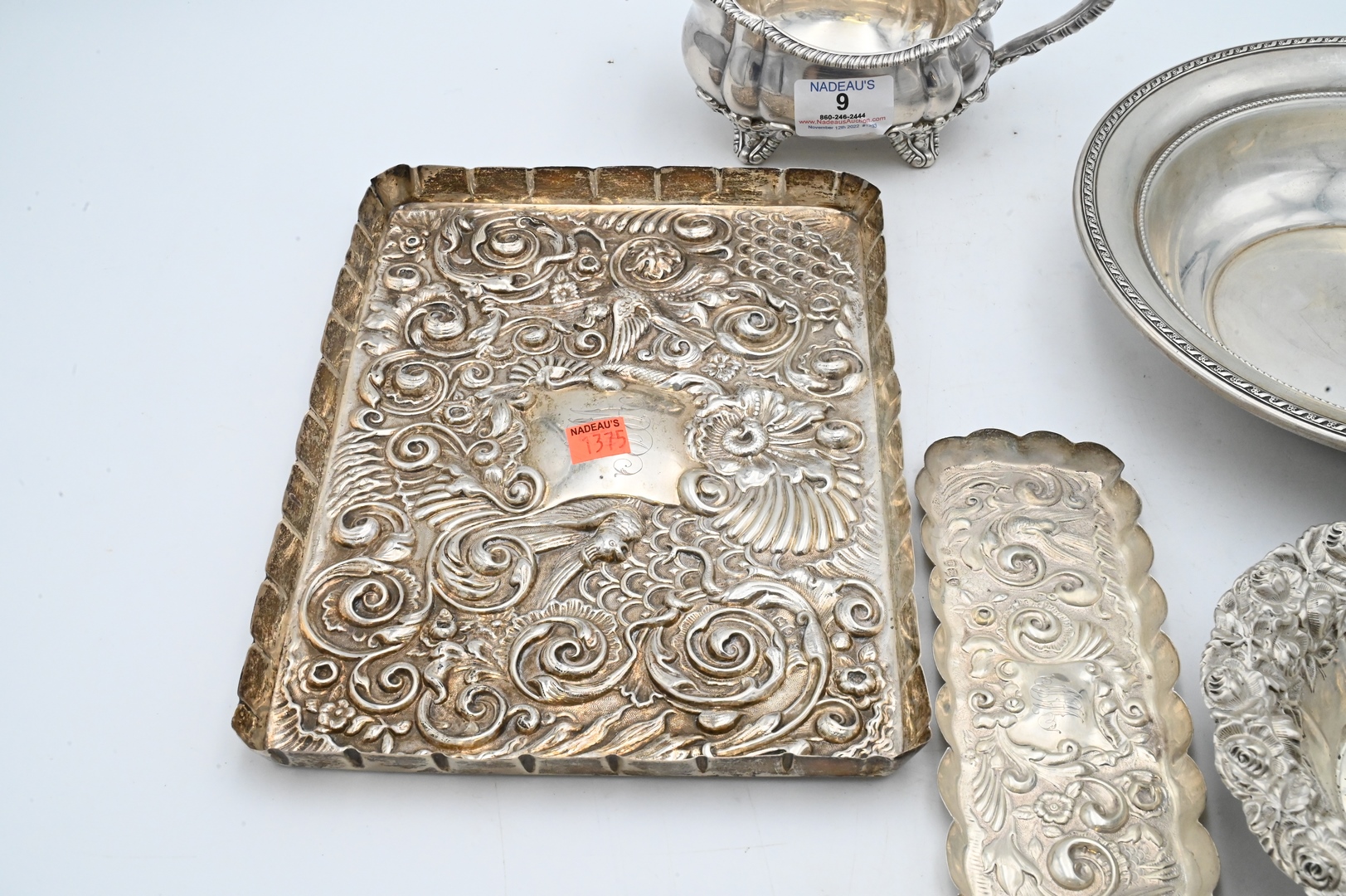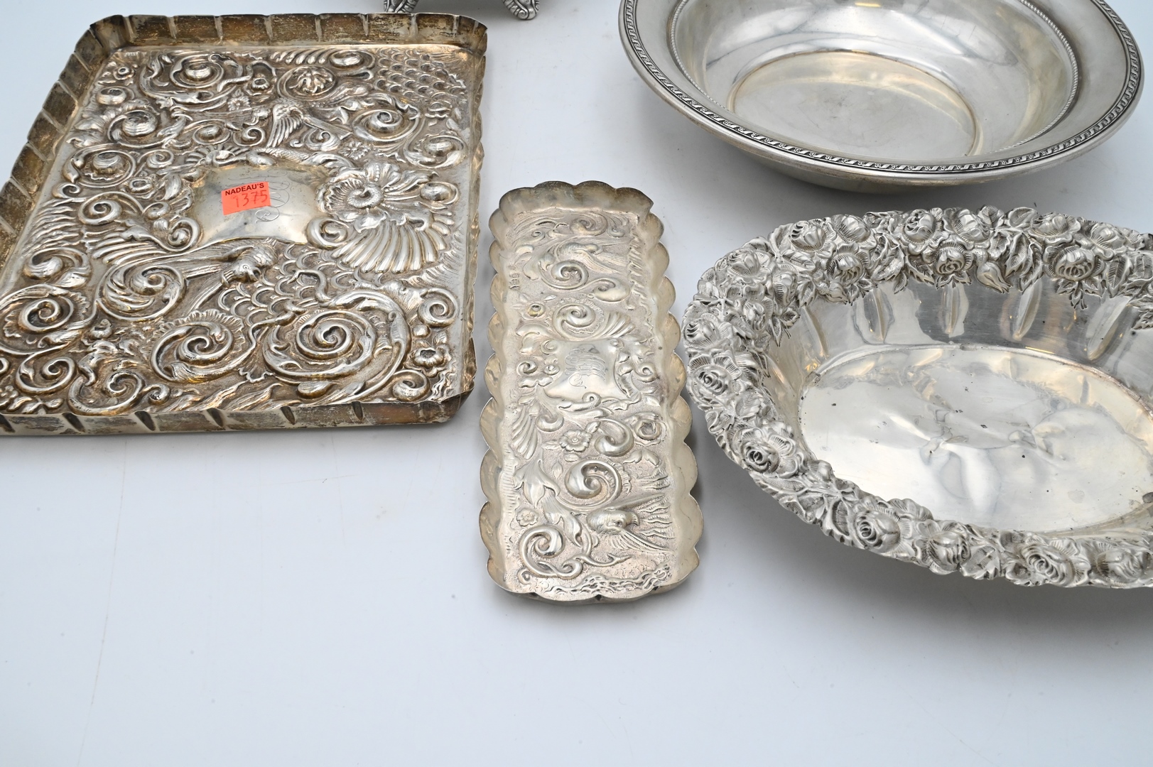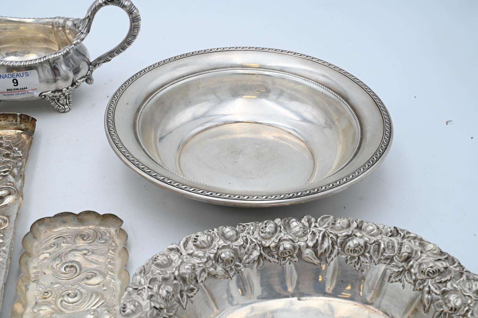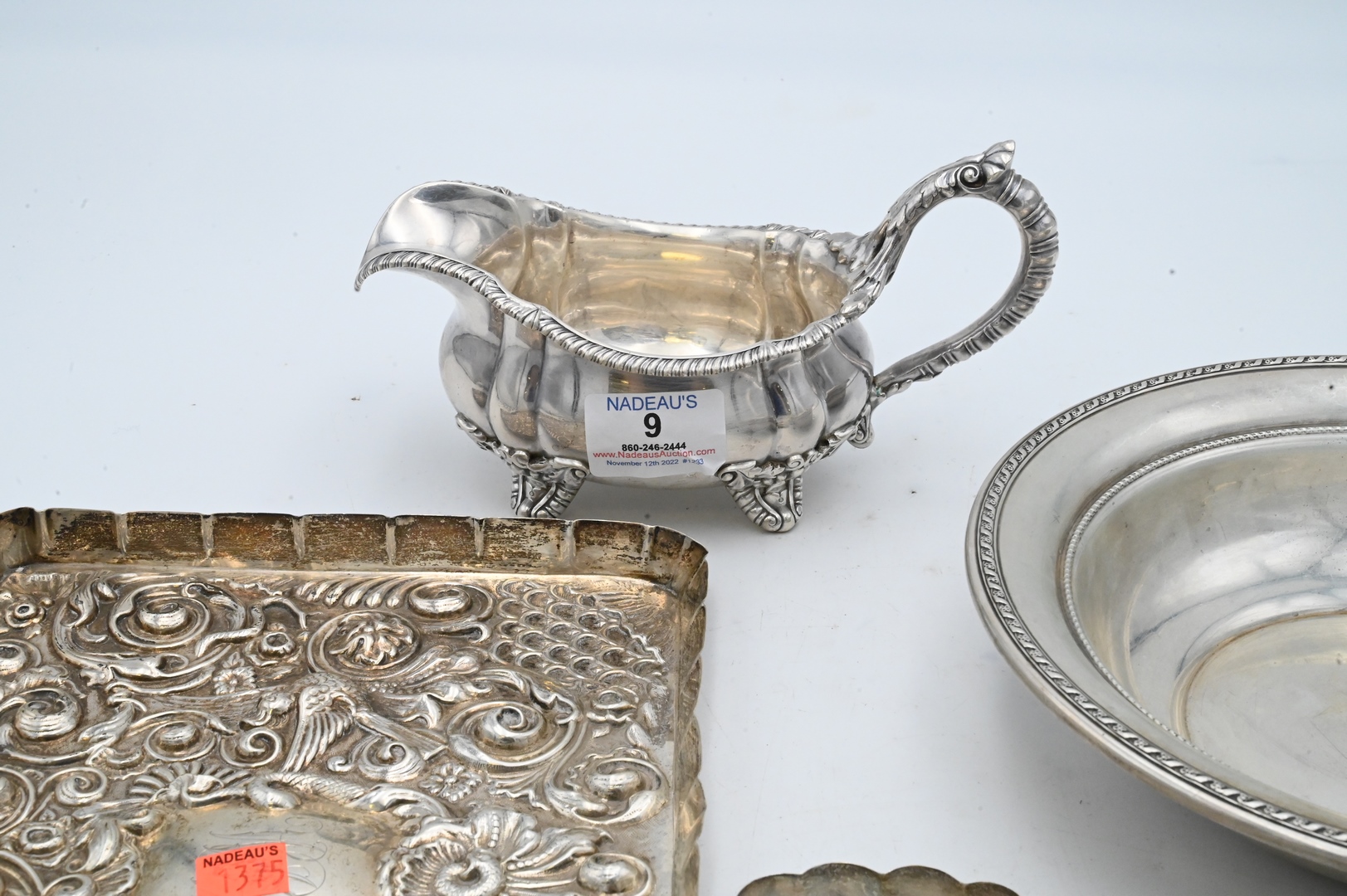 Group of Silver, to include a sterling gravy boat, two rectangular embossed trays, along with two sterling bowls; longest 10 1/2 inches, 38.3 t.oz, Provenance: Estate of Cyril H. Moore Jr, Kent, Connecticut.