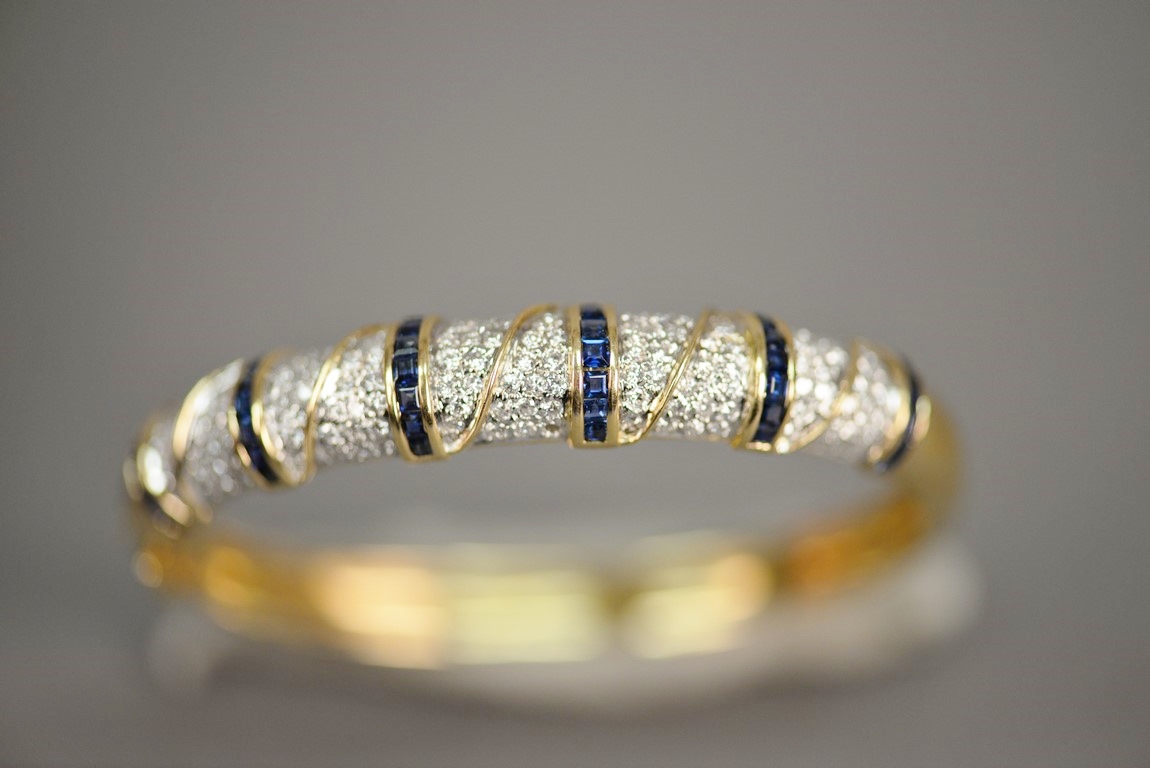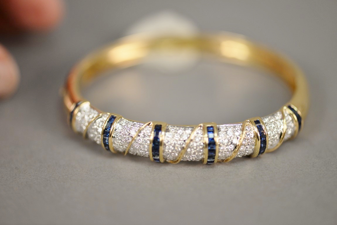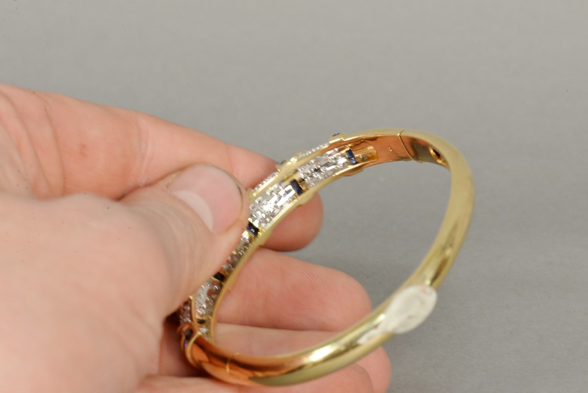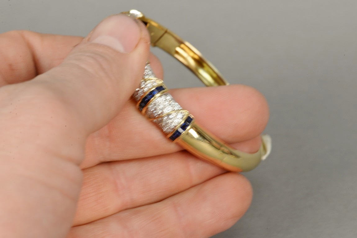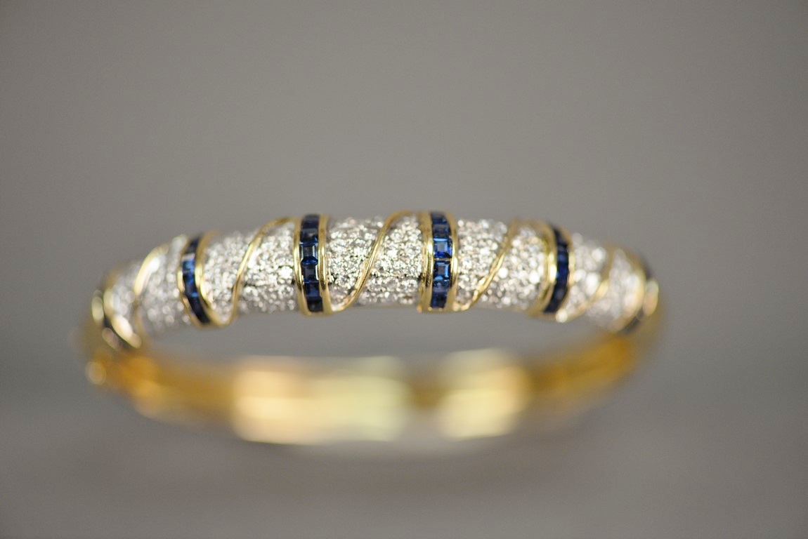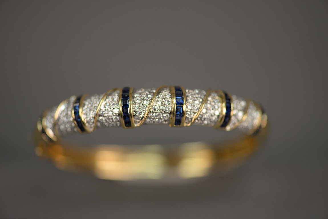Lot 9: Hinged sapphire and diamond bangle bracelet in 18K stamped yellow gold. The bracelet centers two rows of fourteen channel set cali…