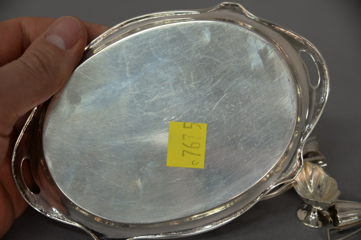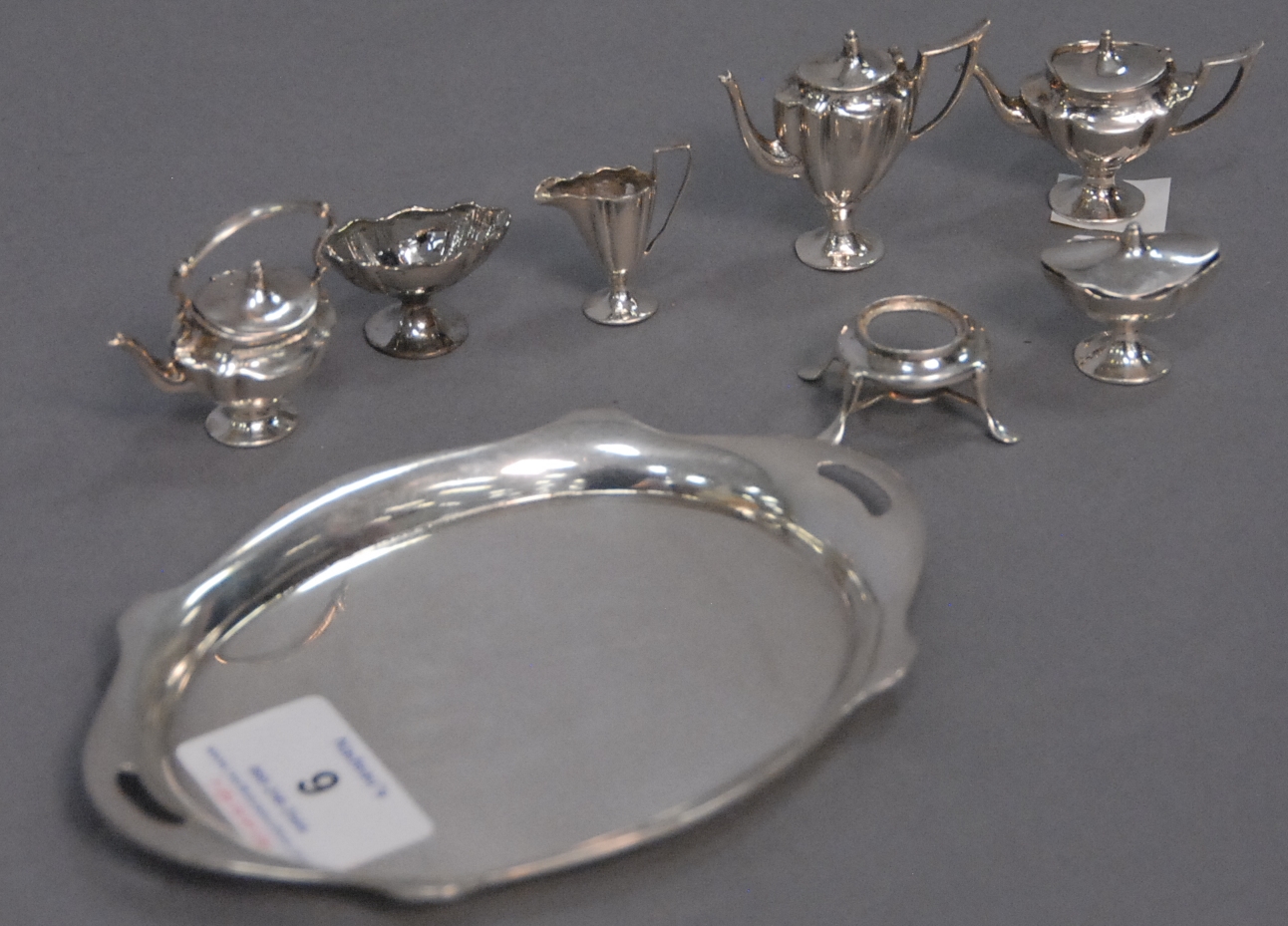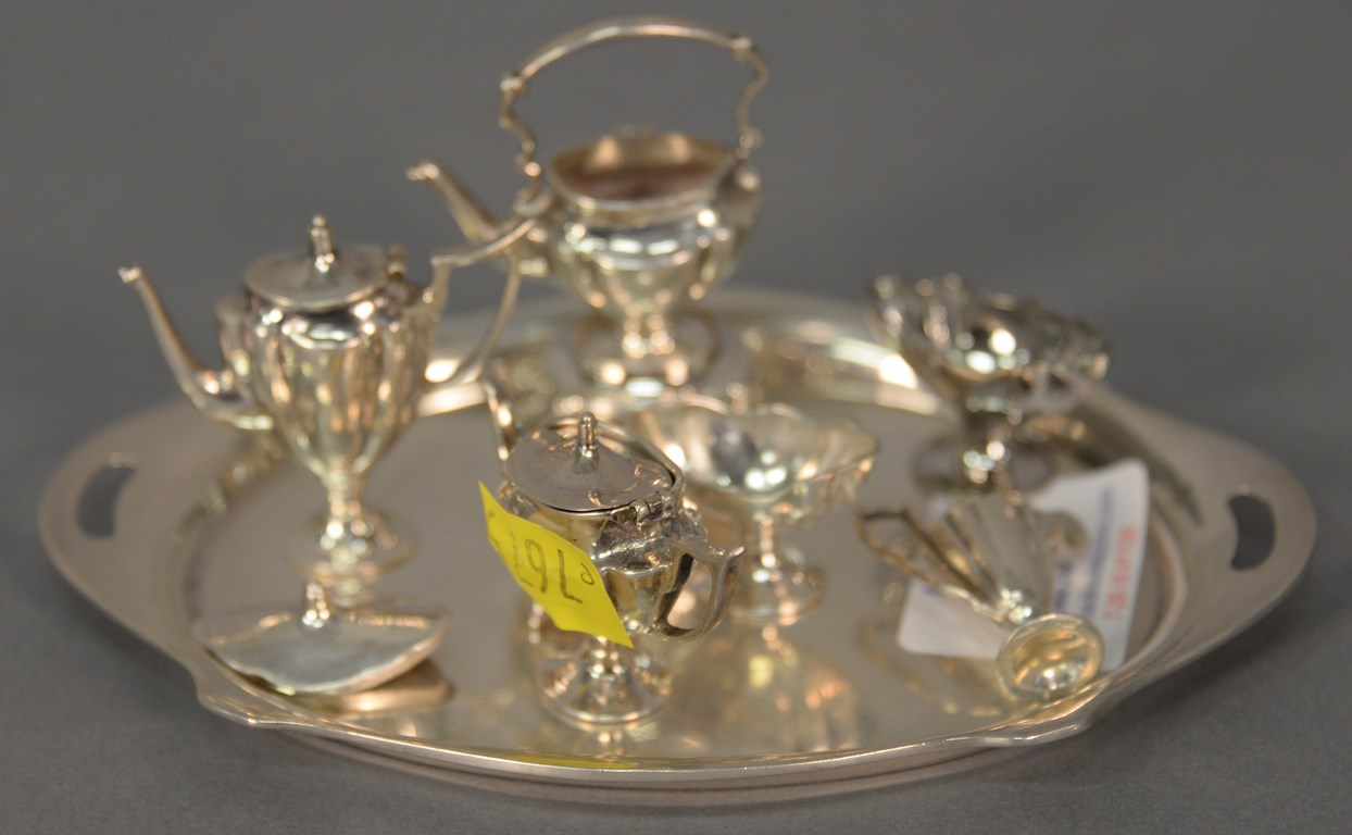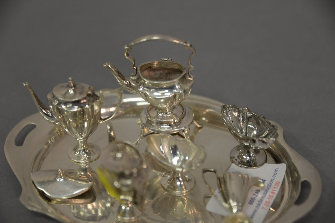 Lot 9: Miniature Cartier sterling tea set with tray one piece is NOT Cartier, lg. 6 in. 5.5 t oz.