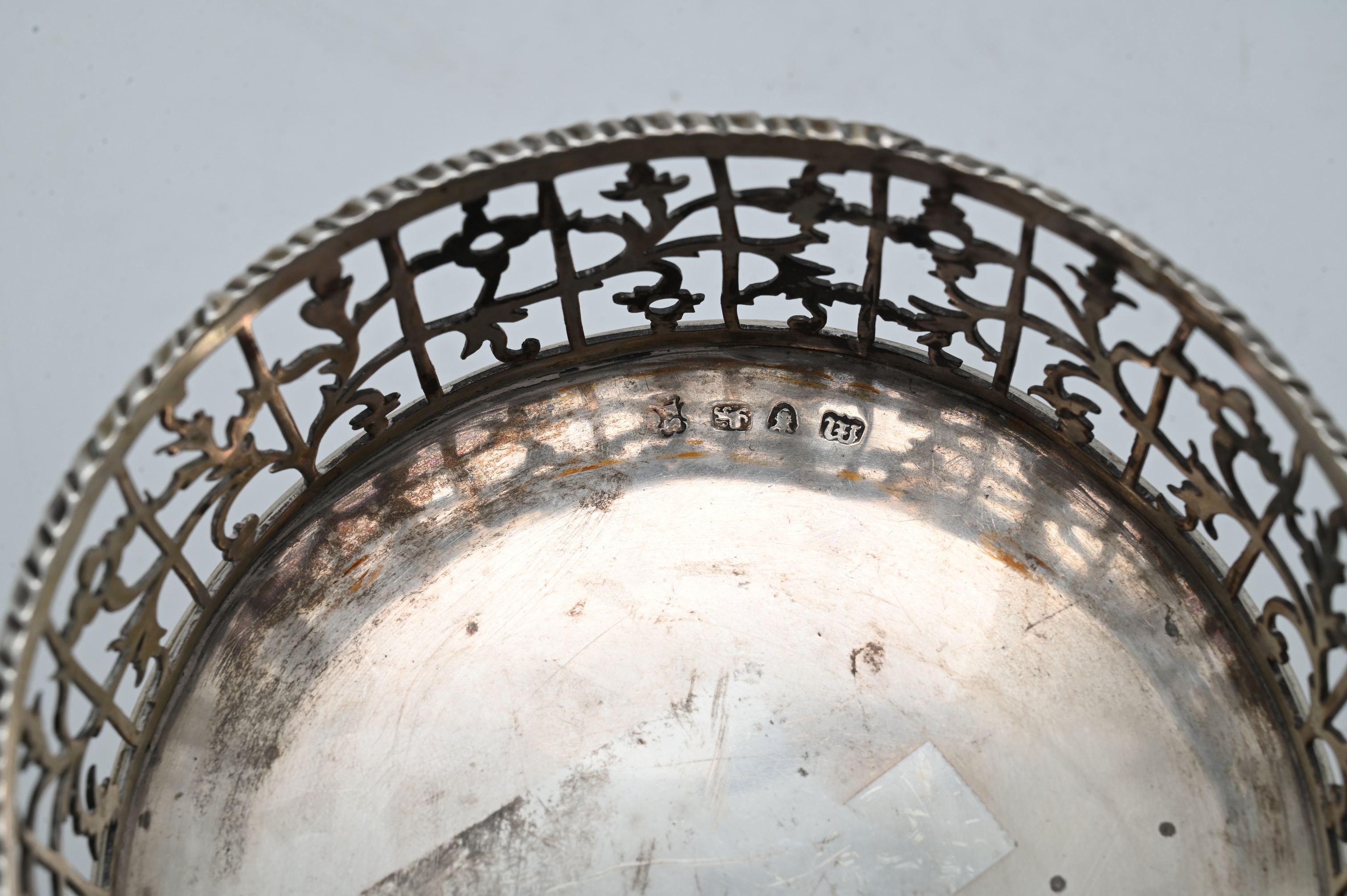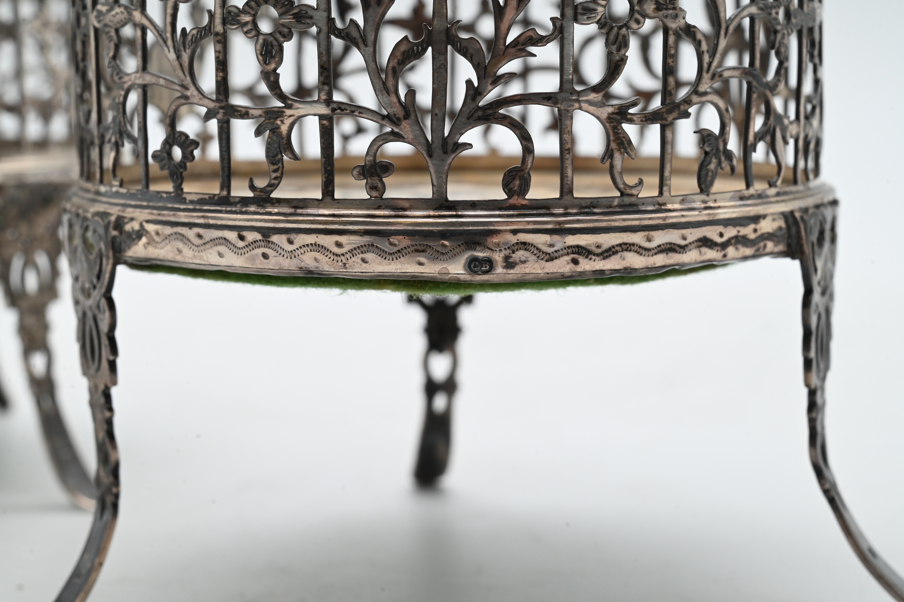 each of circular form with pierced foliate and floral decoration, centered by a cartouche with double-headed eagle motif, raised on three scrolling tripod feet, fitted with wooden bases. Total weight 12.4 troy ounces