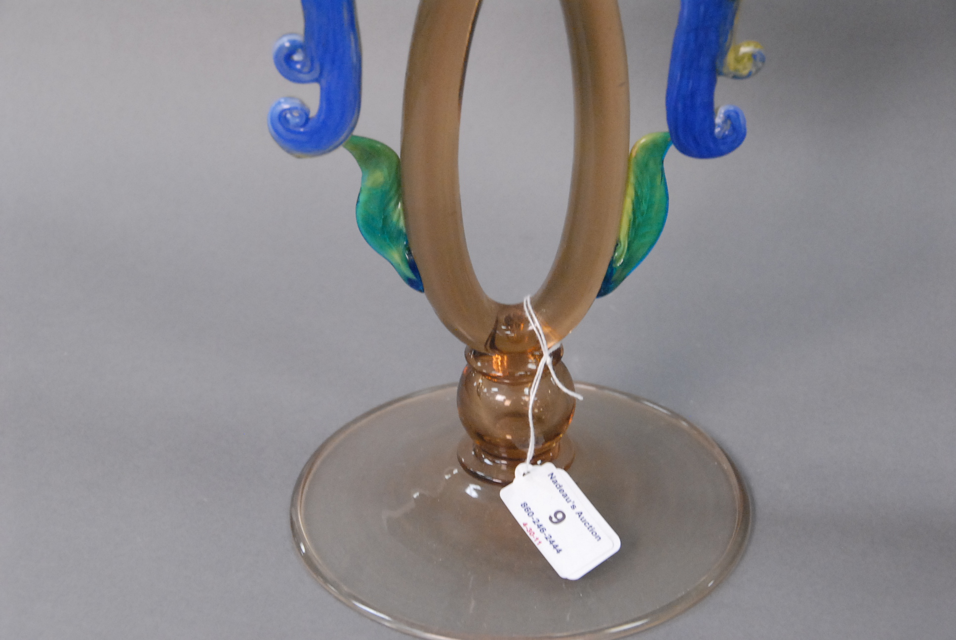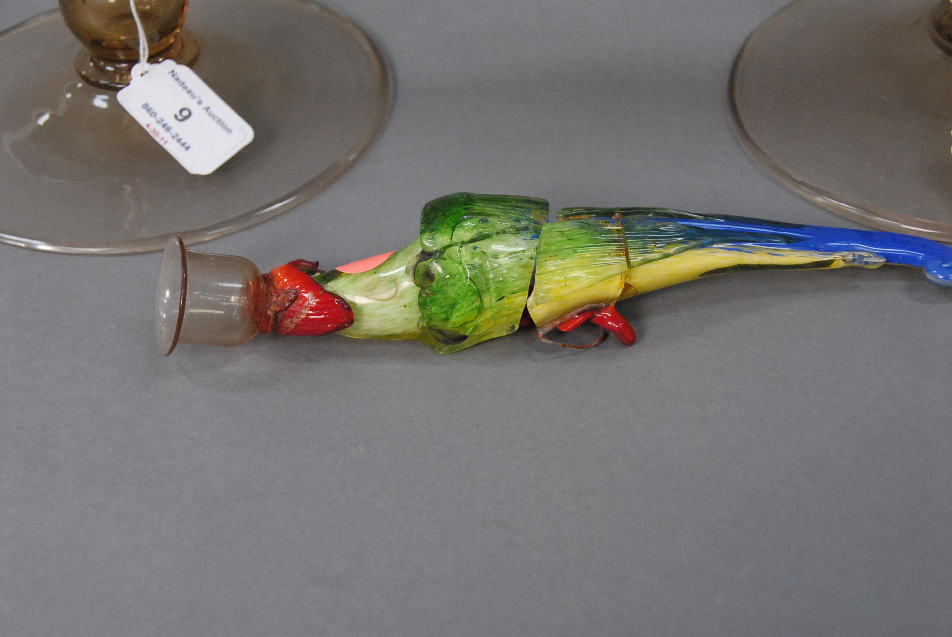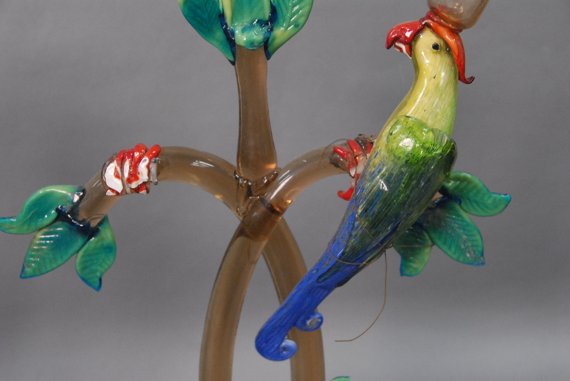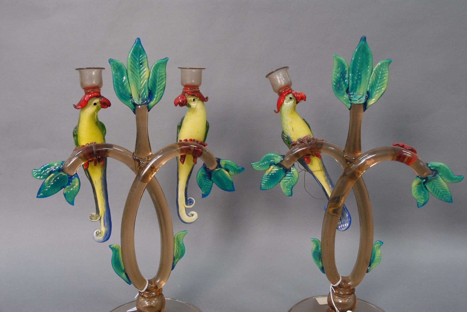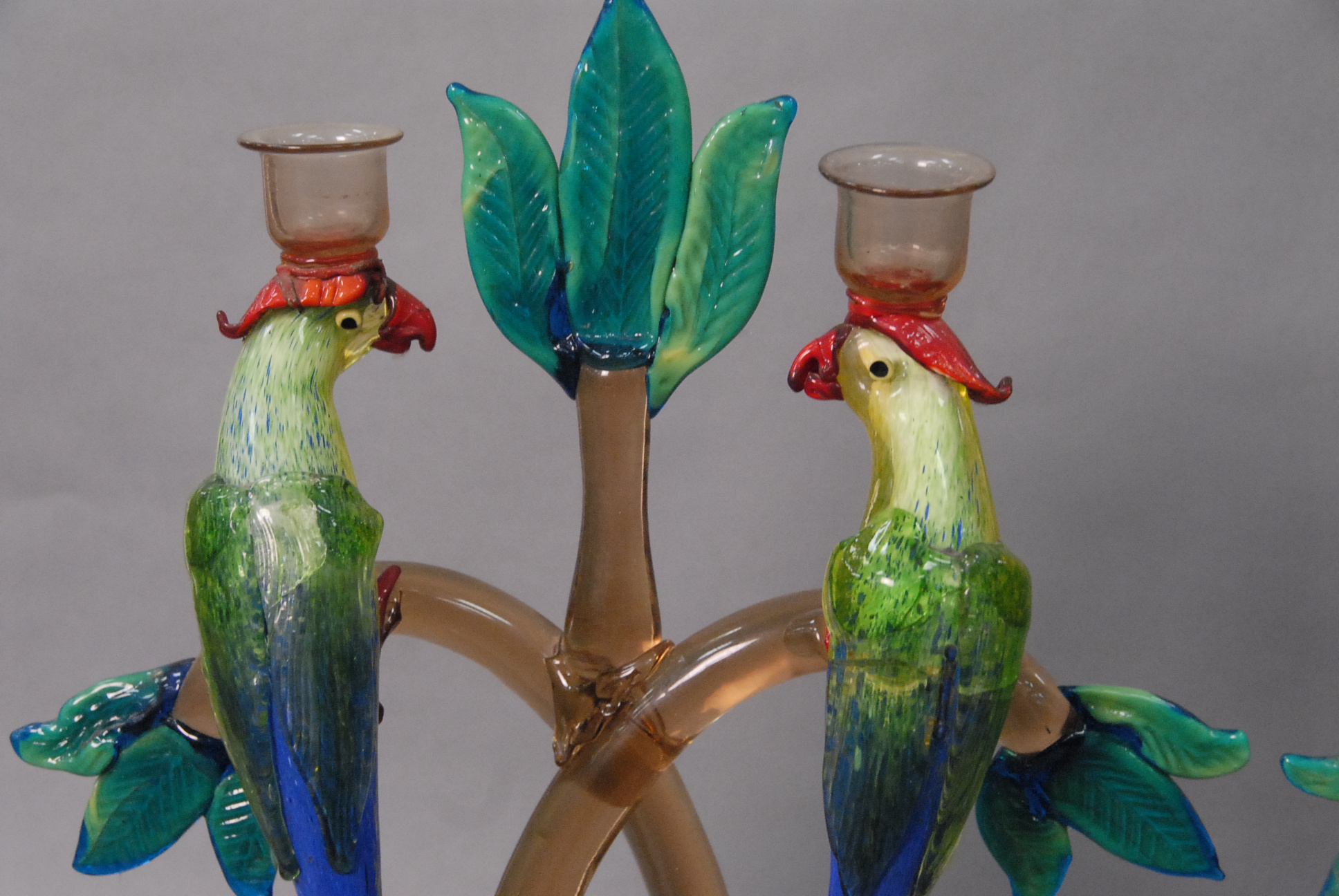 Pair of Venetian glass candelabras mounted with parrots, one with cracked parrot, one with damage to both parrots.