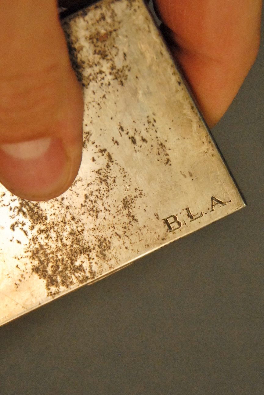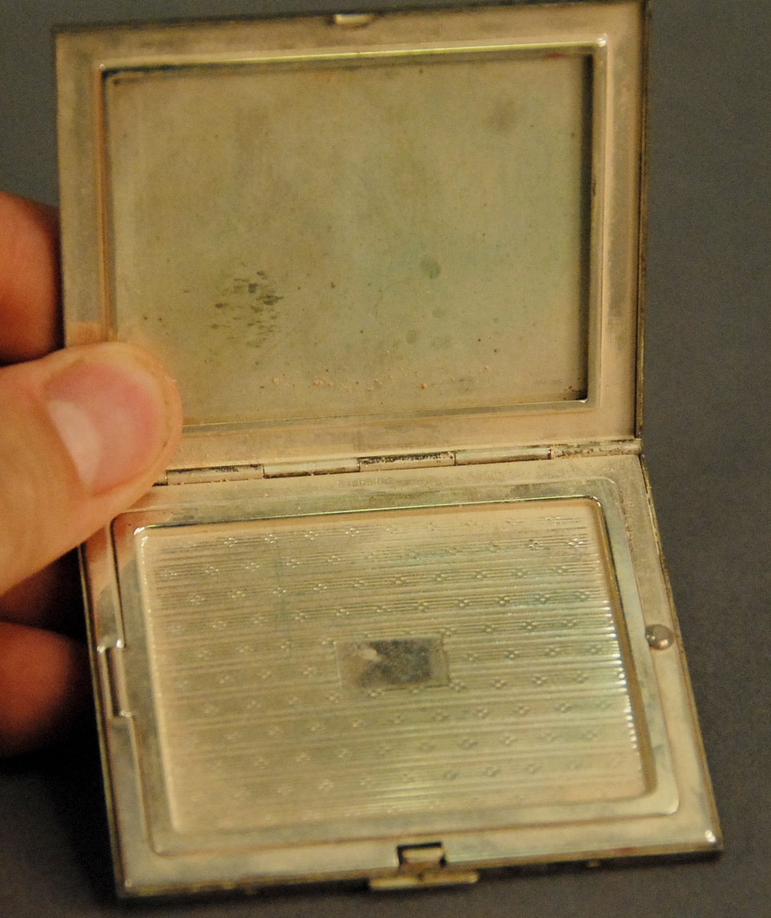 Lot 9: Possibly Georg Jensen, sterling silver compact having leaf with jewel on top, initialed BLA, marked sterling.