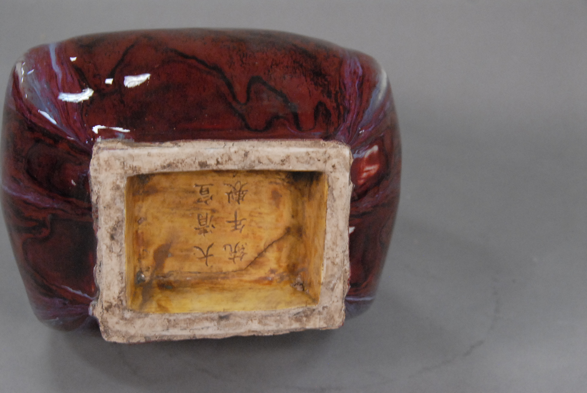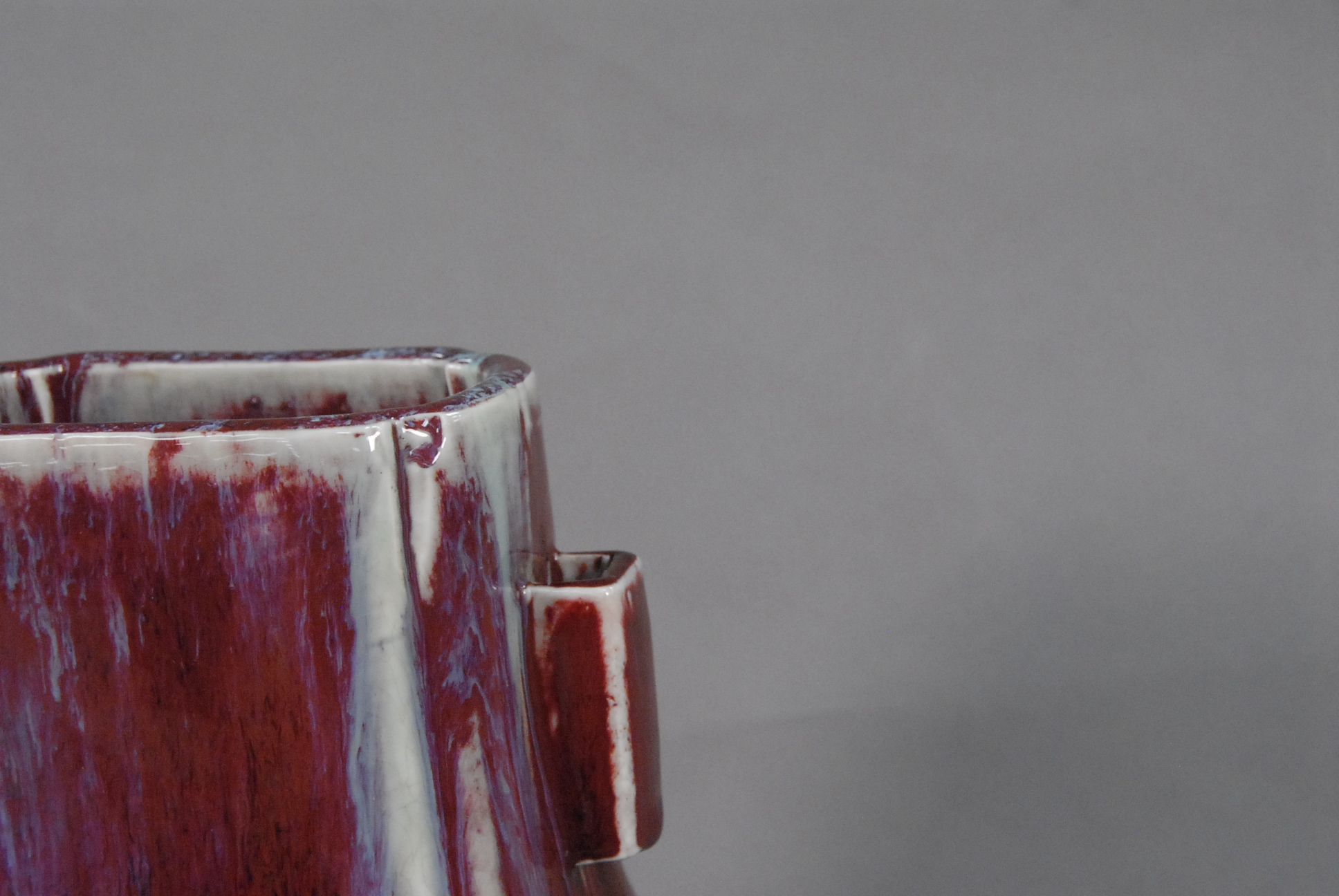 Red flamb glazed pottery vase having molded handles and six character mark on bottom.