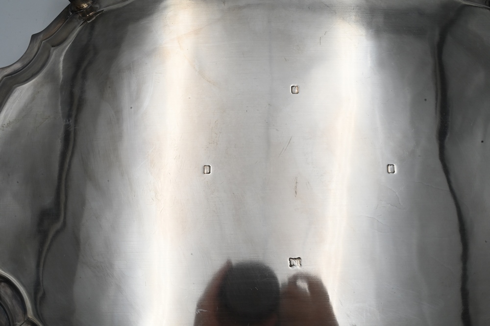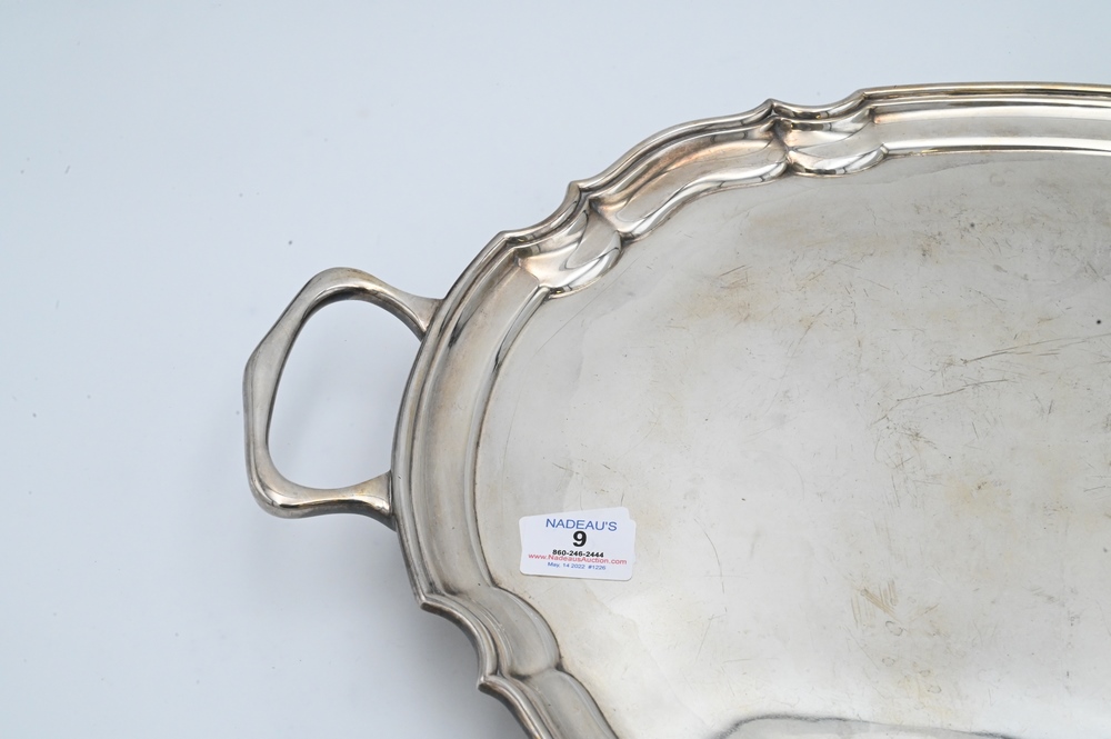 Lot 9: Silver Two Handle Tray, on scrolled feet, total length 24 1/2 inches, 81.4 t.oz. Provenance: Collections of Norma Reilly, New Jersey.