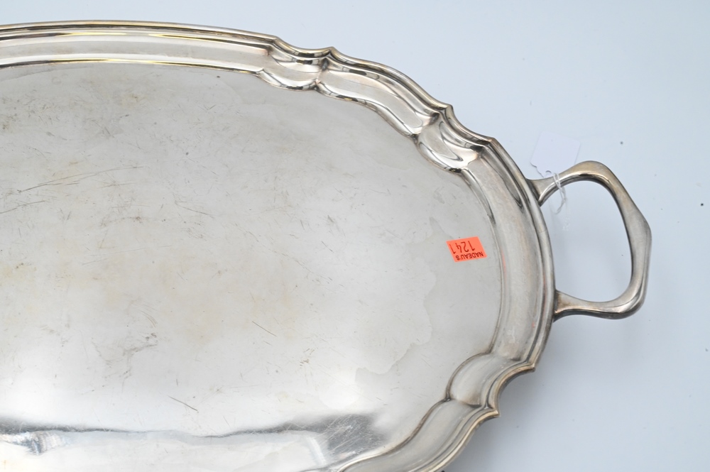 Silver Two Handle Tray, on scrolled feet, total length 24 1/2 inches, 81.4 t.oz. Provenance: Collections of Norma Reilly, New Jersey.
