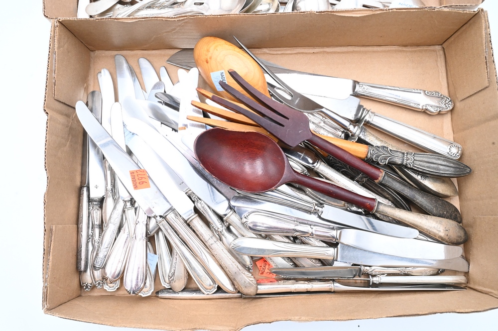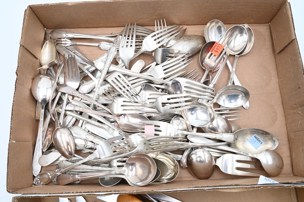 Lot 9: Sterling Silver Flatware, in various patterns, 145 pieces to include 40 forks, 34 spoons, 11 butter knives, 3 ladles, 1 ice shovel, 49 knives, 7 serving pieces, length of largest 12 inches, 107.07 t.oz. plus 57 handles, one piece not sterling.