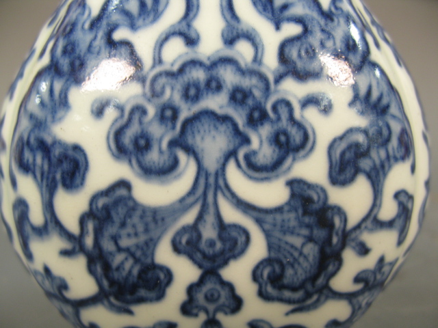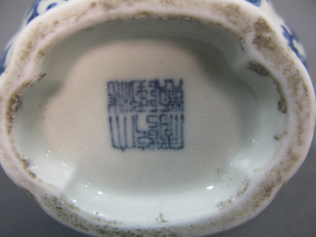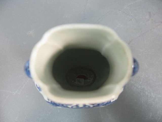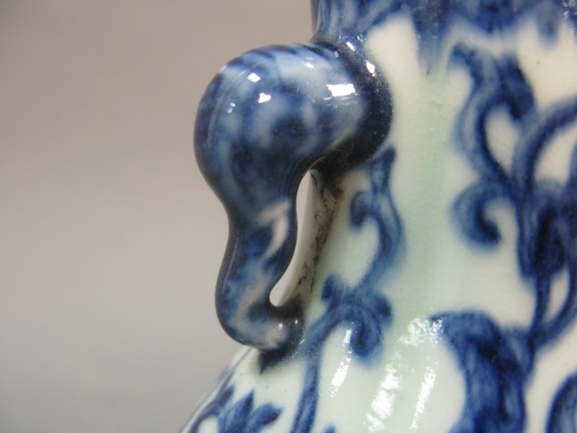 Two blue and white porcelain pieces, three claw dragon brush pot with footed base along with handled vase with painted scrolling vines and flowers.
