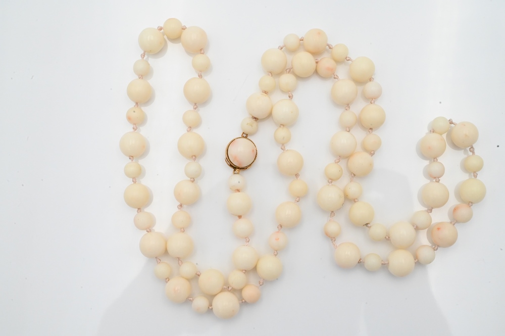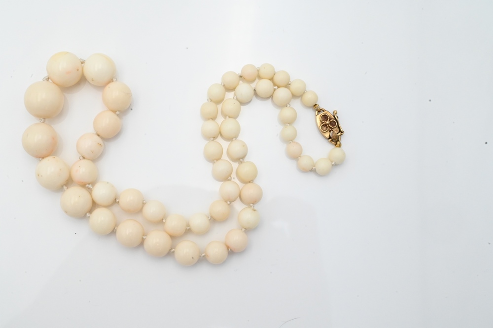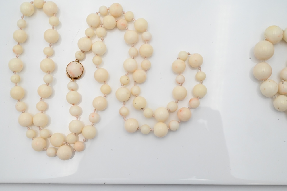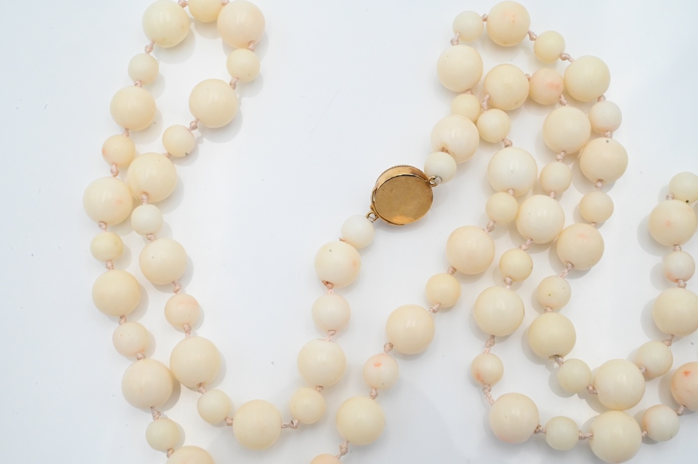Lot 9: Two Carved White Stone Coral Beaded Necklaces, one having 18 karat gold clasp, 32 inches long; along with one having a 14 karat gold…