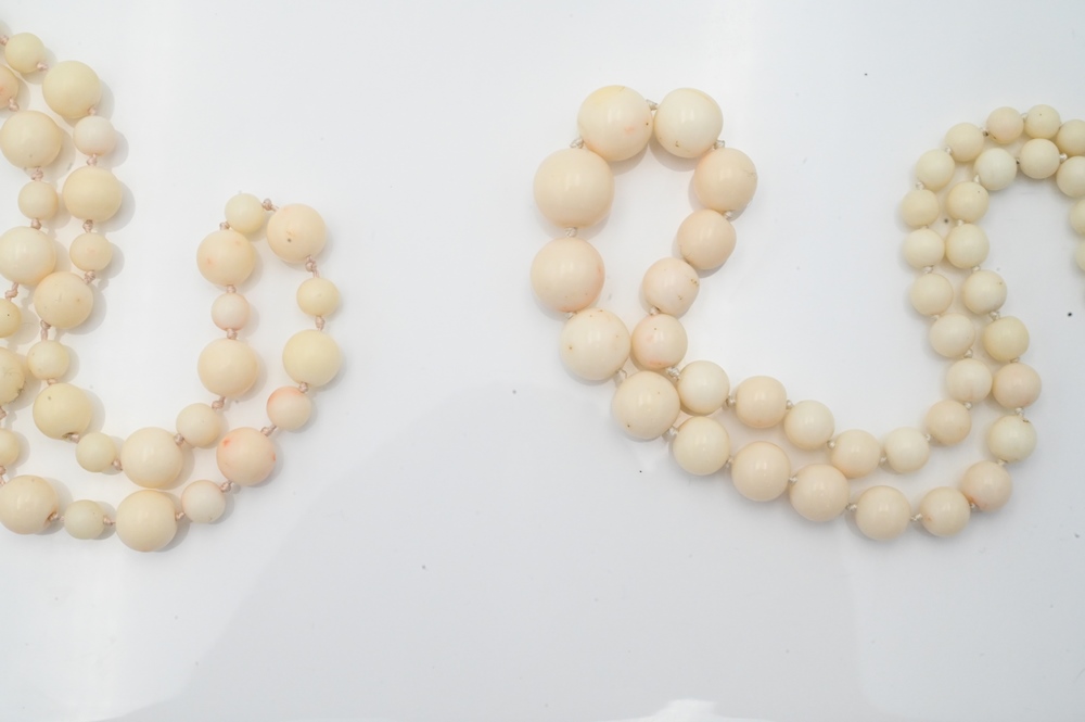 Two Carved White Stone Coral Beaded Necklaces, one having 18 karat gold clasp, 32 inches long; along with one having a 14 karat gold clasp, 18 3/4 inches.