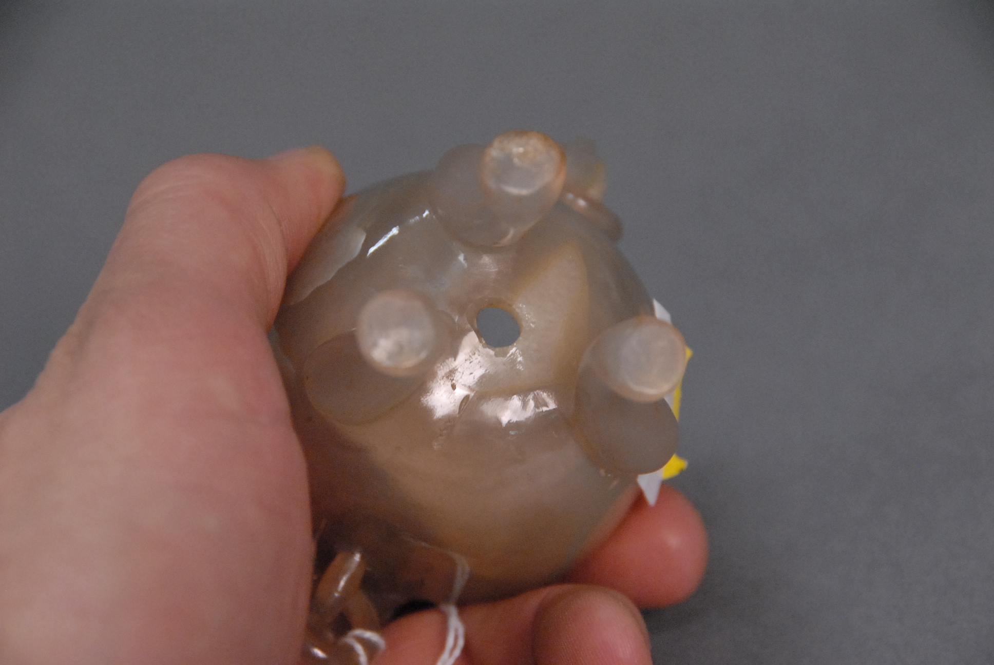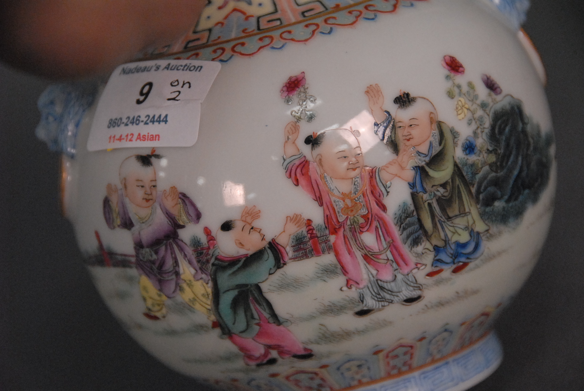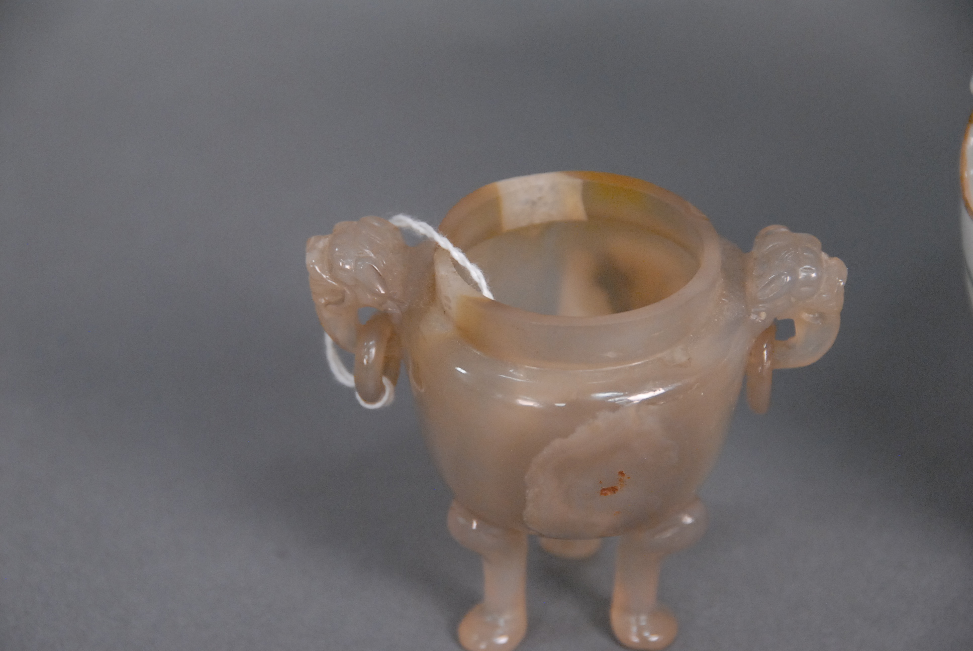 Lot 9: Two Oriental pieces small agate urn with foo dog head handles and rings ht. 3in. and porcelain boys vase with six character mark on…