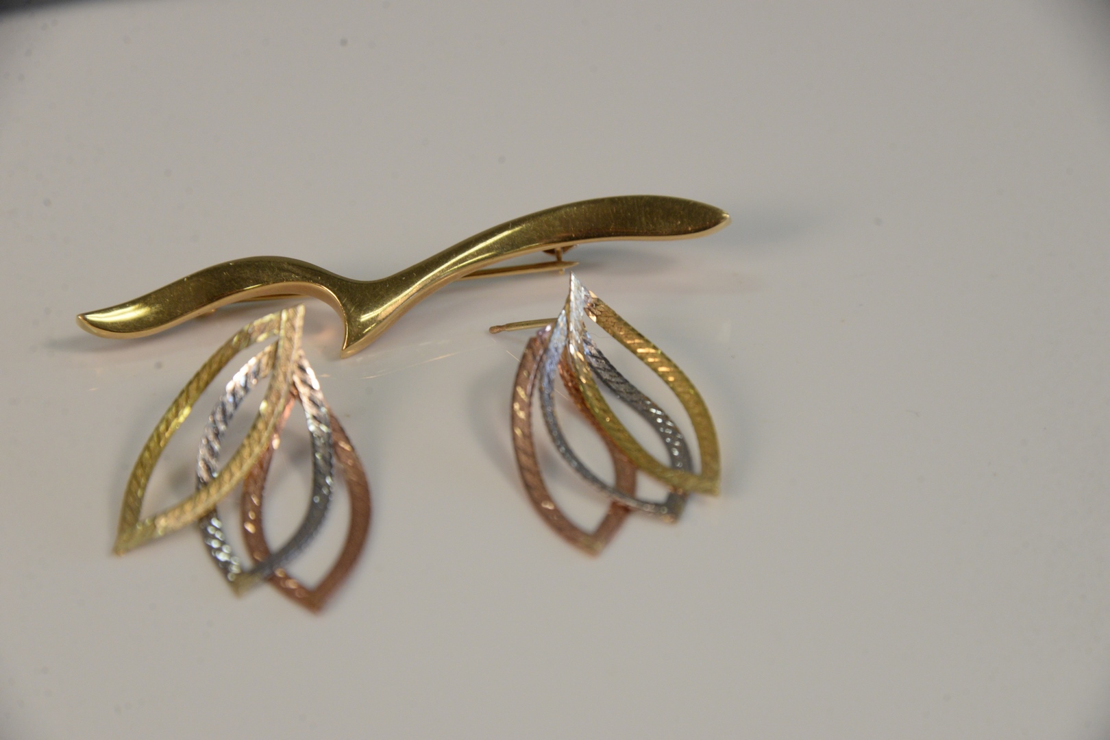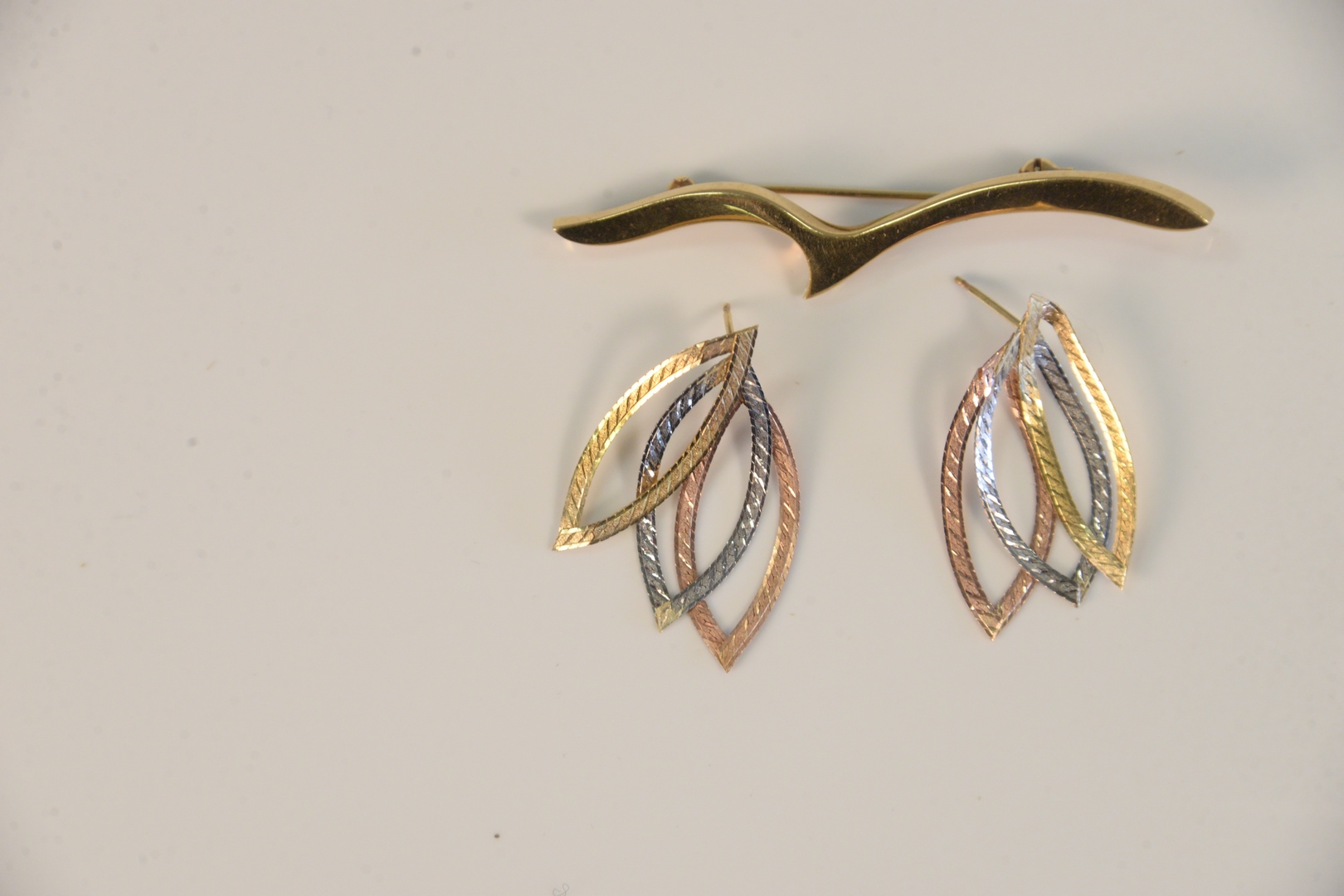 Lot 9: Two Piece Lot to include 18 karat brooch and pair 18 karat gold earrings brooch 3.7 grams, earrings 2.2 grams