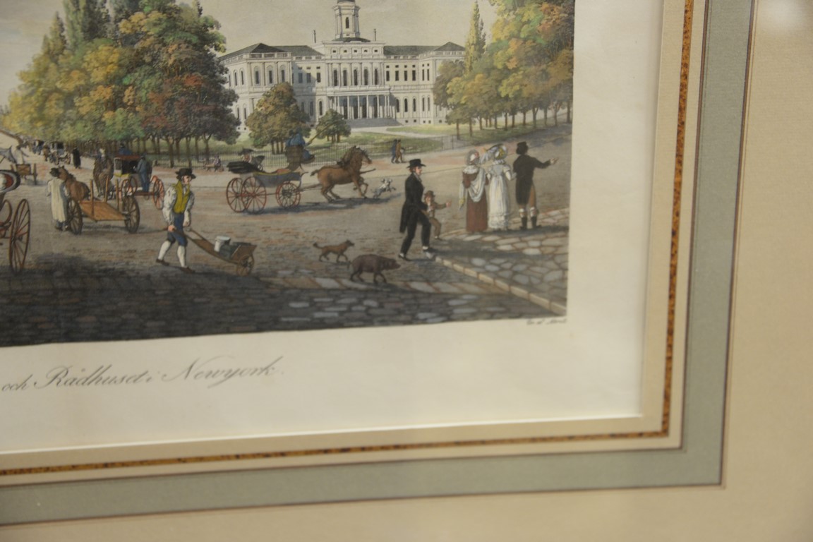 Lot 90: After Baron Axel Leonard Klinckowstrom colored aquatint engraved by Carl Frederik Akrell Broadway Gatan Och Radhuset New York, sigh…