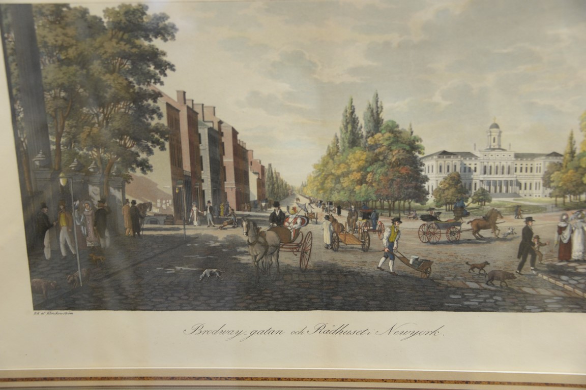 After Baron Axel Leonard Klinckowstrom colored aquatint engraved by Carl Frederik Akrell Broadway Gatan Och Radhuset New York, sight size 11 x 17 1/2. Provenance: Property from Credit Suisse’s Americana Collection