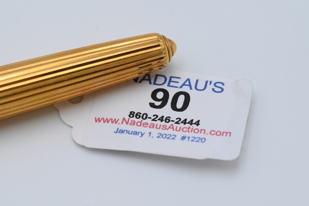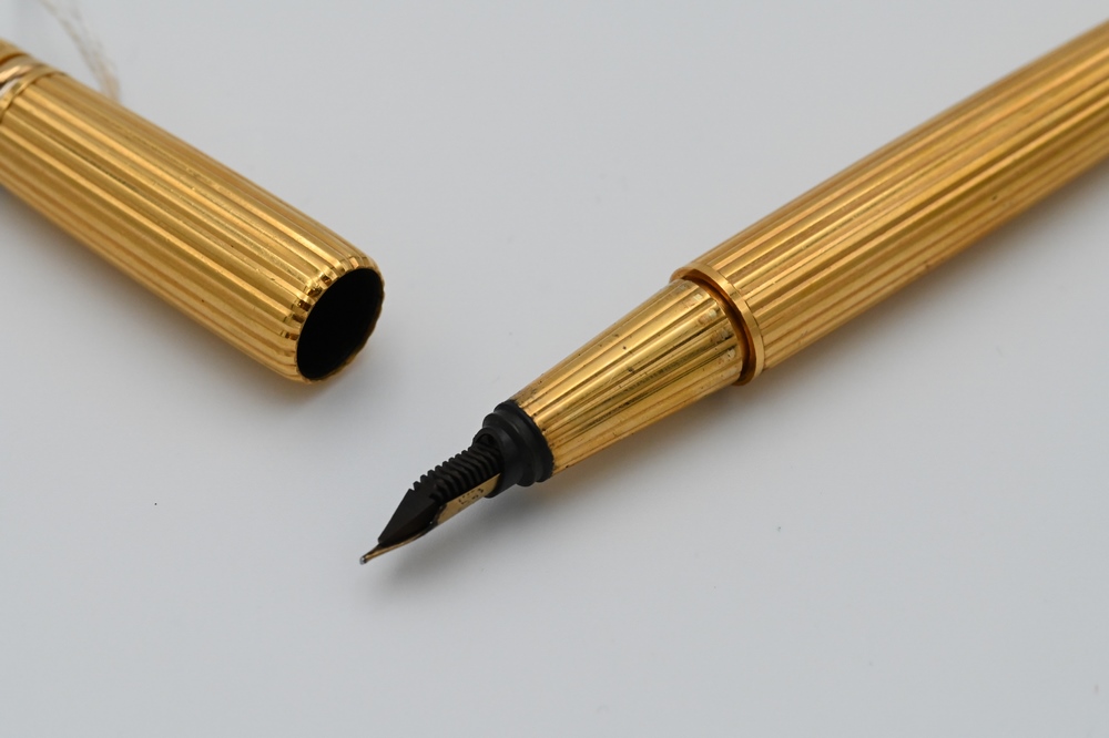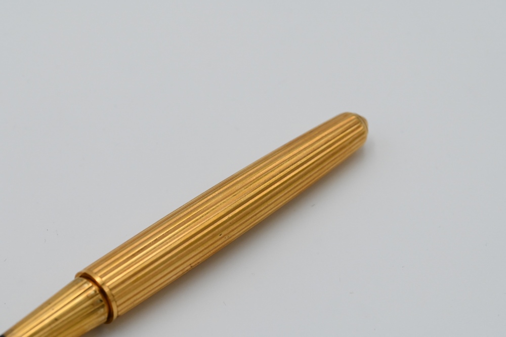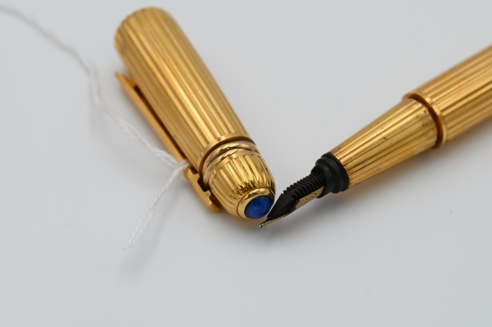 Lot 90: Cartier Pasha Fountain Pen, having ribbed finish, topped with Cartier trinity rings, sapphire top, in a Cartier box, 1990, #3394.