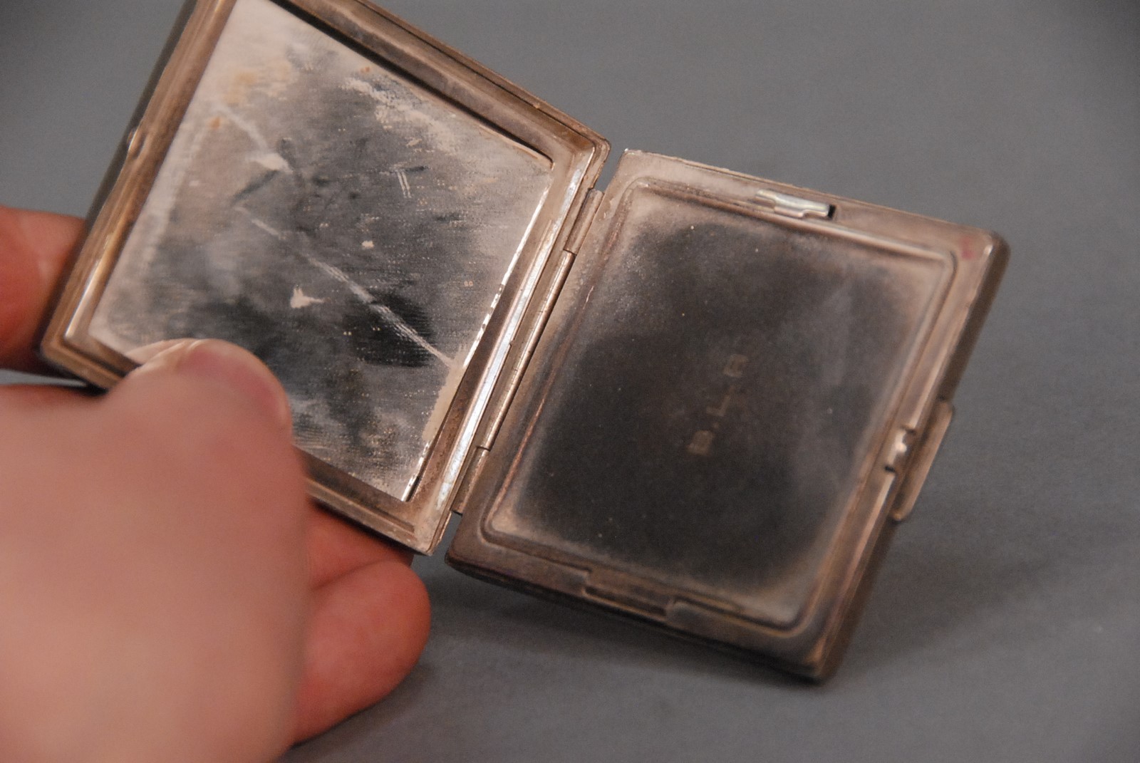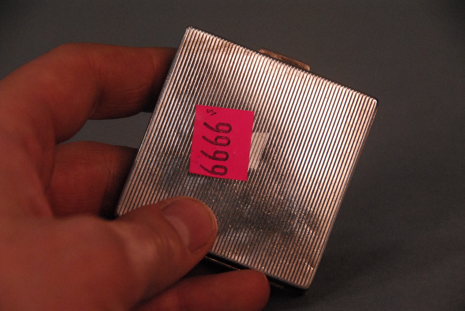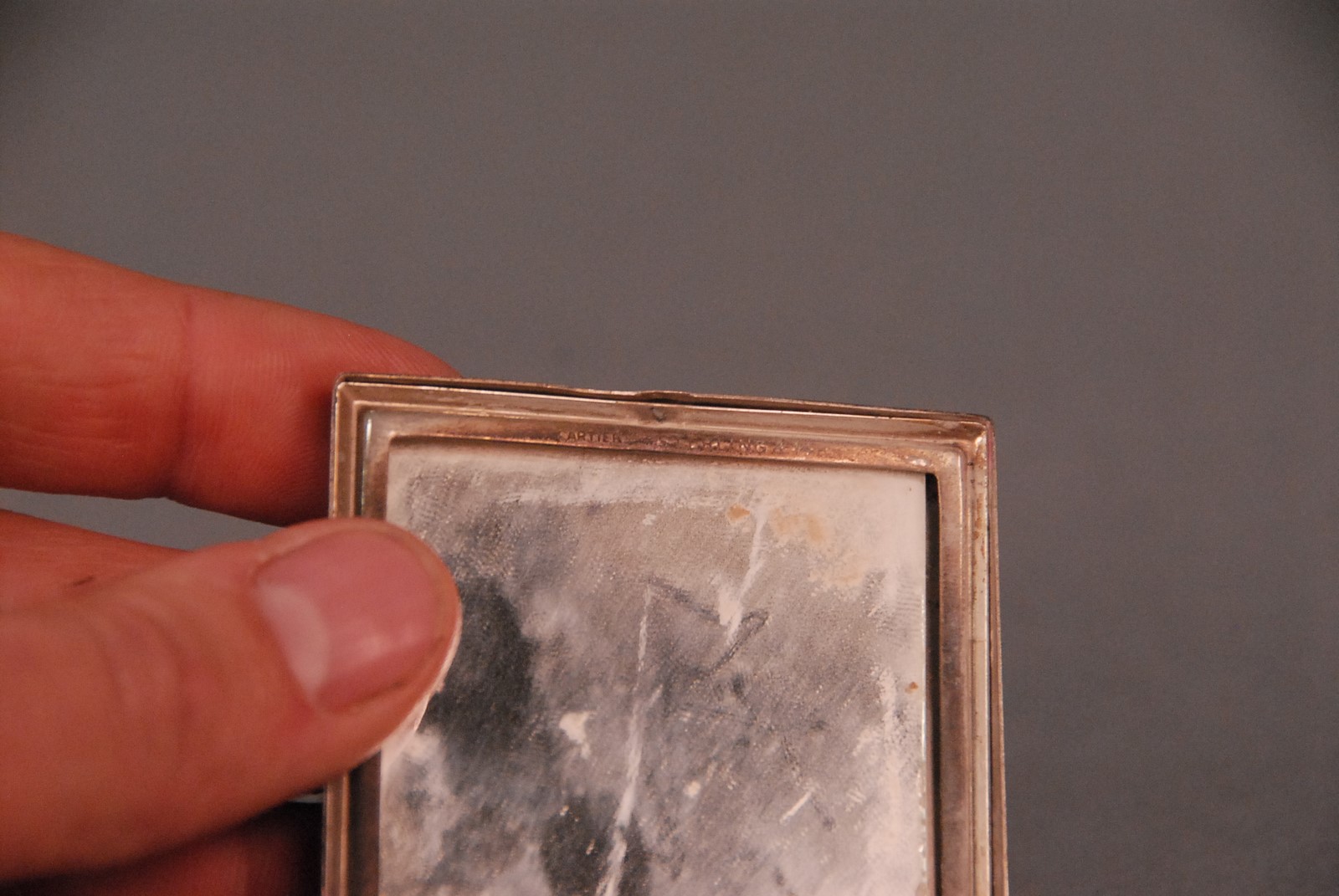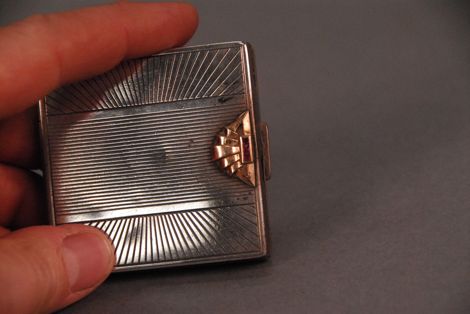 Lot 90: Cartier sterling silver and 14K gold compact with rubies in an Art Deco design having closed case on inside and mirror marked Cartier Sterling 14K.