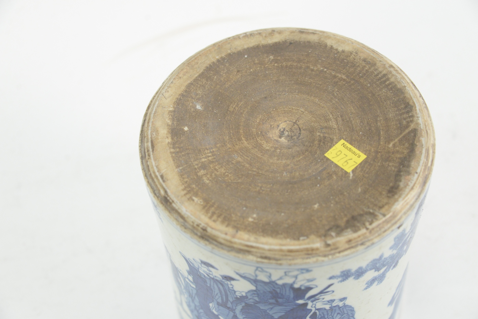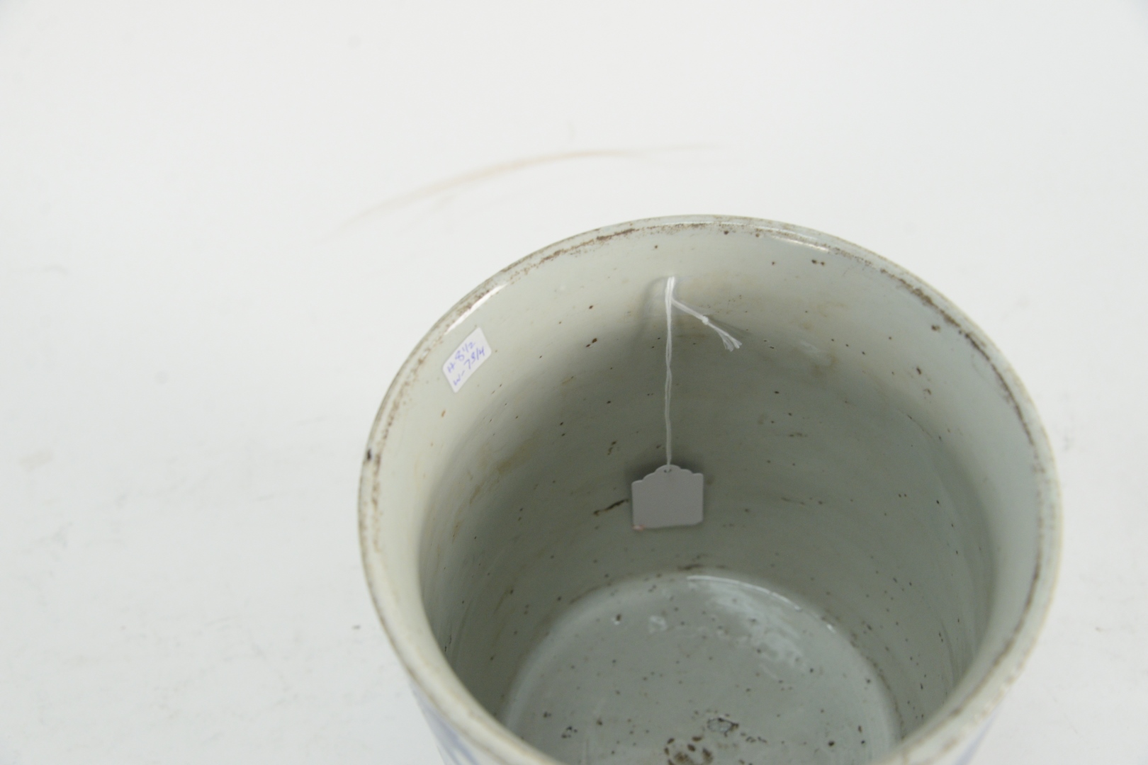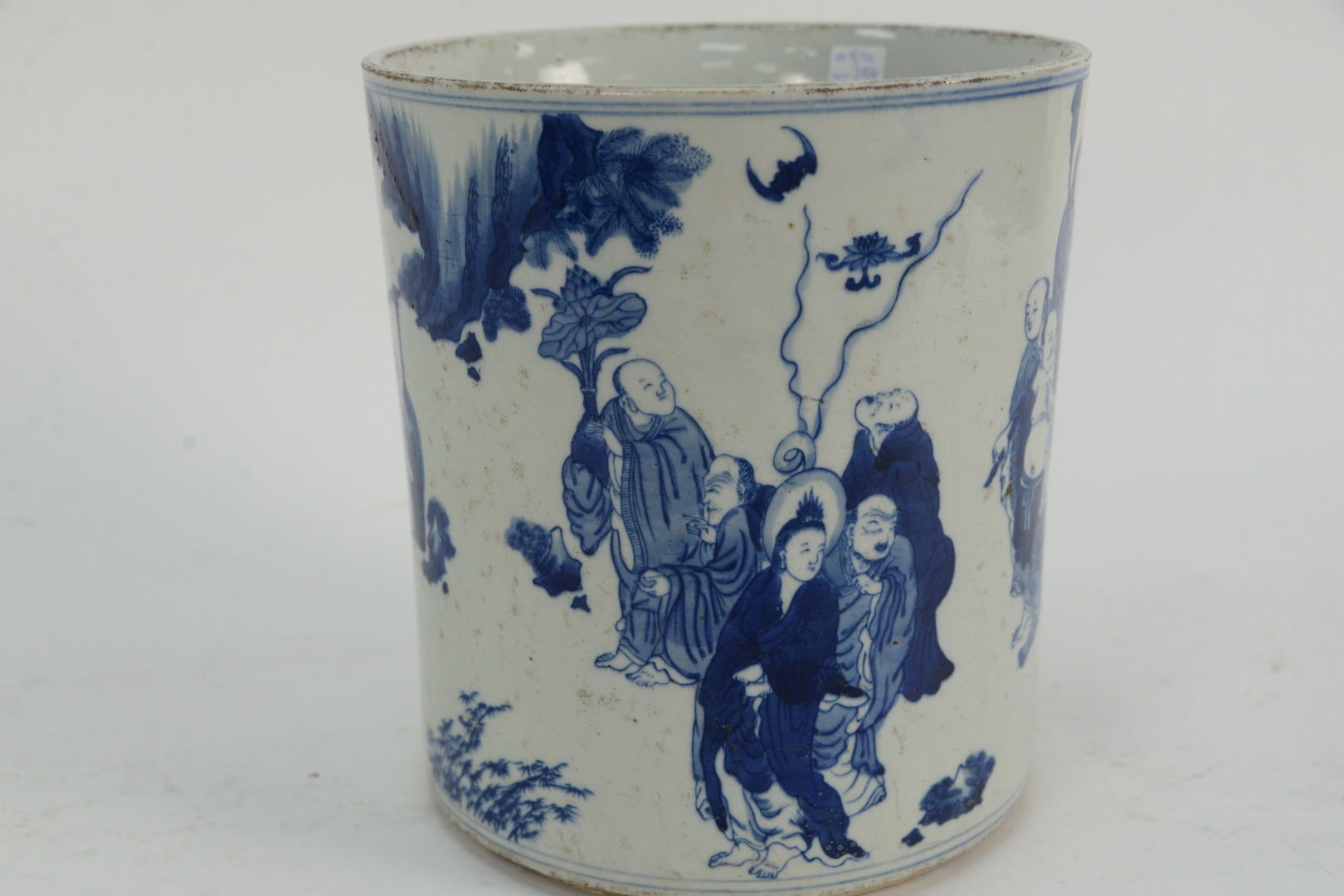 Lot 90: Chinese Blue and White Brush Pot having painted figures and scholars, height 8 3/4 inches, diameter 7 3/4 inches.