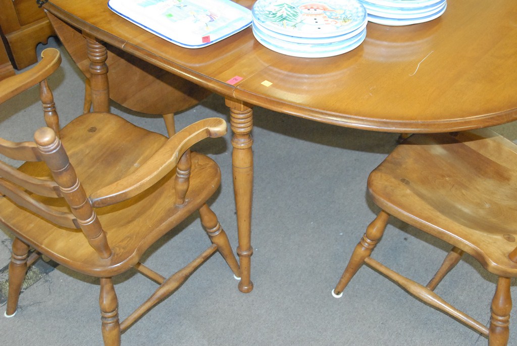 Cushman maple 6 piece dining set with 4 chairs, drop leaf table, and open top hutch plus one leaf.