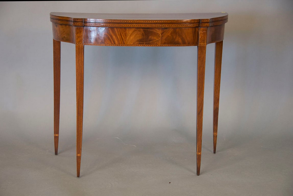 Lot 90: Federal mahogany inlaid game table having D form top over conforming frieze all set on square tapered legs with double tapered ends, circa 1790-1810. ht. 30 1/4 in. wd. 35 3/4 in. dp. 16 1/4 in.