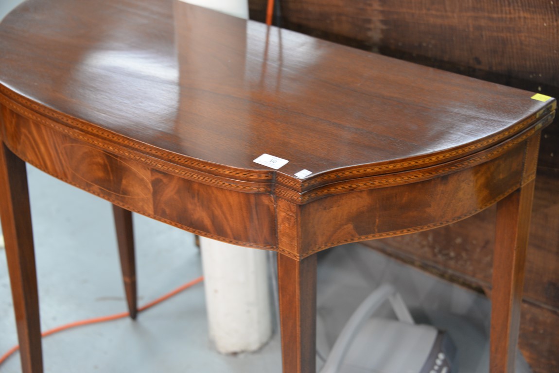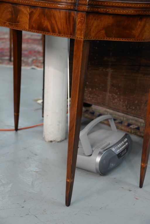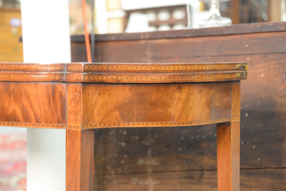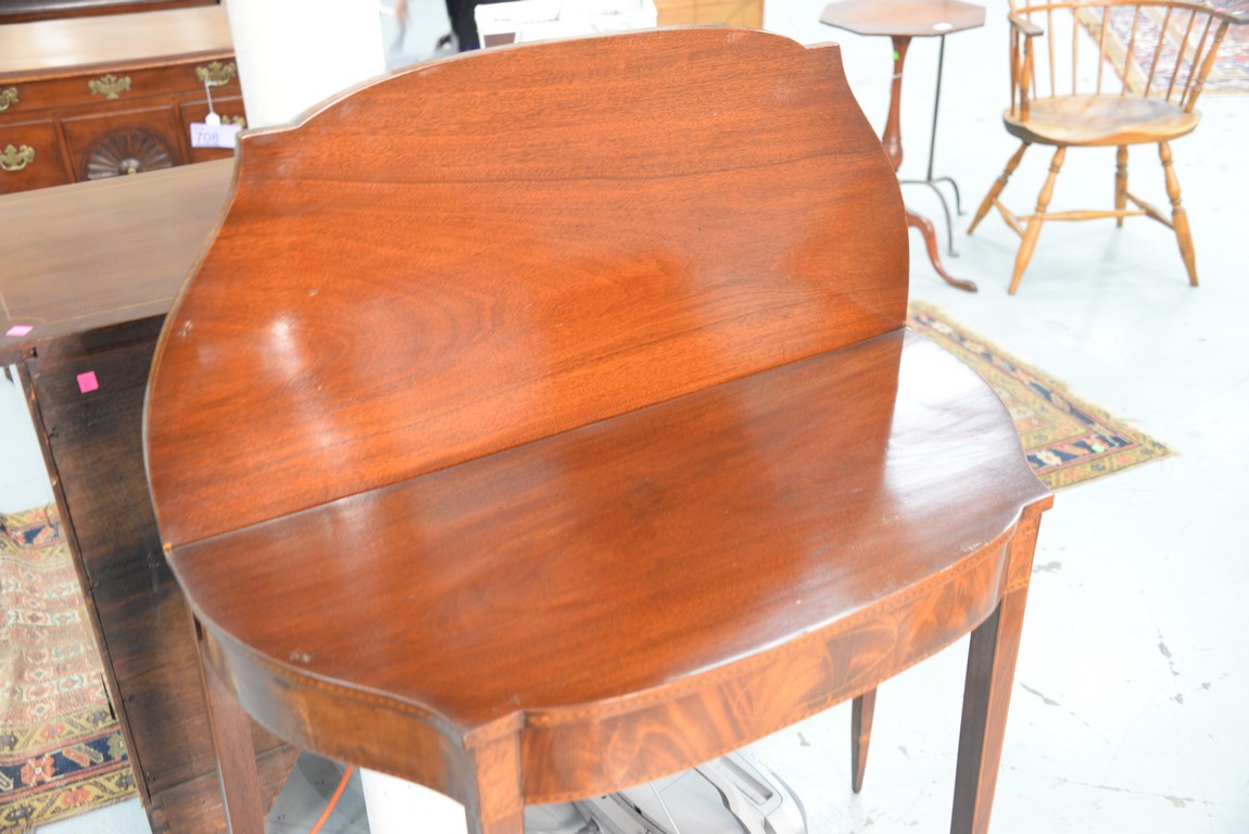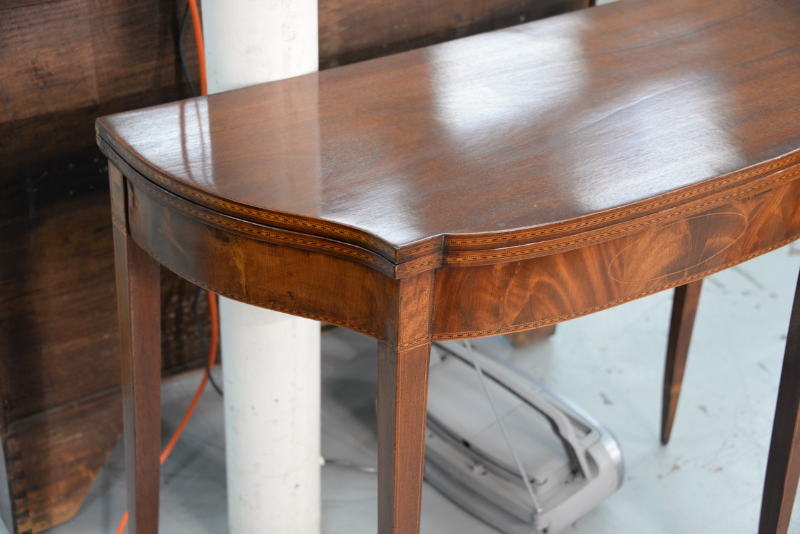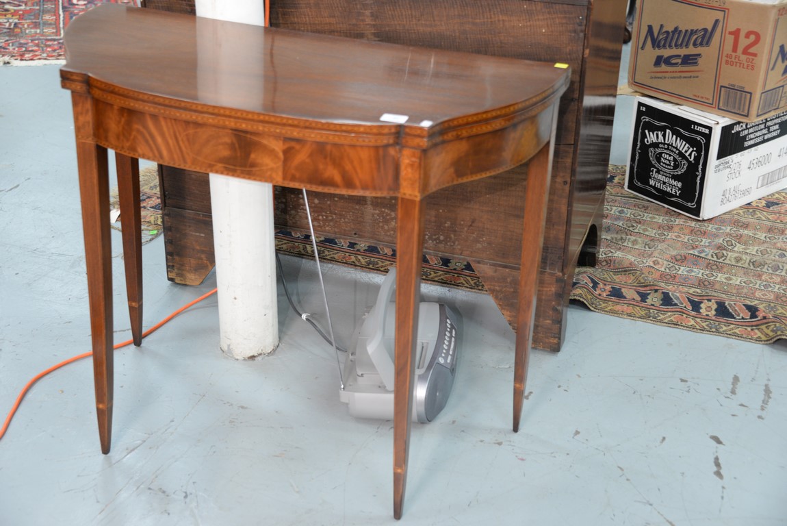 Lot 90: Federal mahogany inlaid game table having D form top over conforming frieze all set on square tapered legs with double tapered ends, circa 1790-1810. ht. 30 1/4 in. wd. 35 3/4 in. dp. 16 1/4 in.