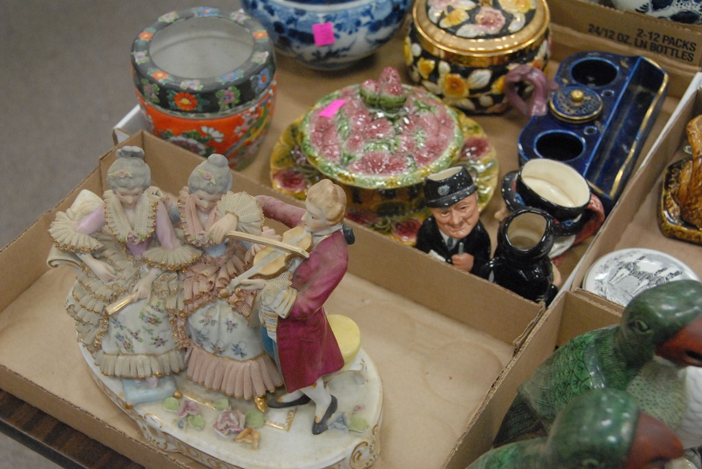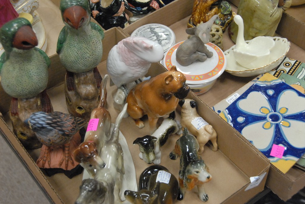 Lot 90: Four box lots bird and dog figures, triple porcelain figure, vases, tiles, three Royal Doulton small mugs.