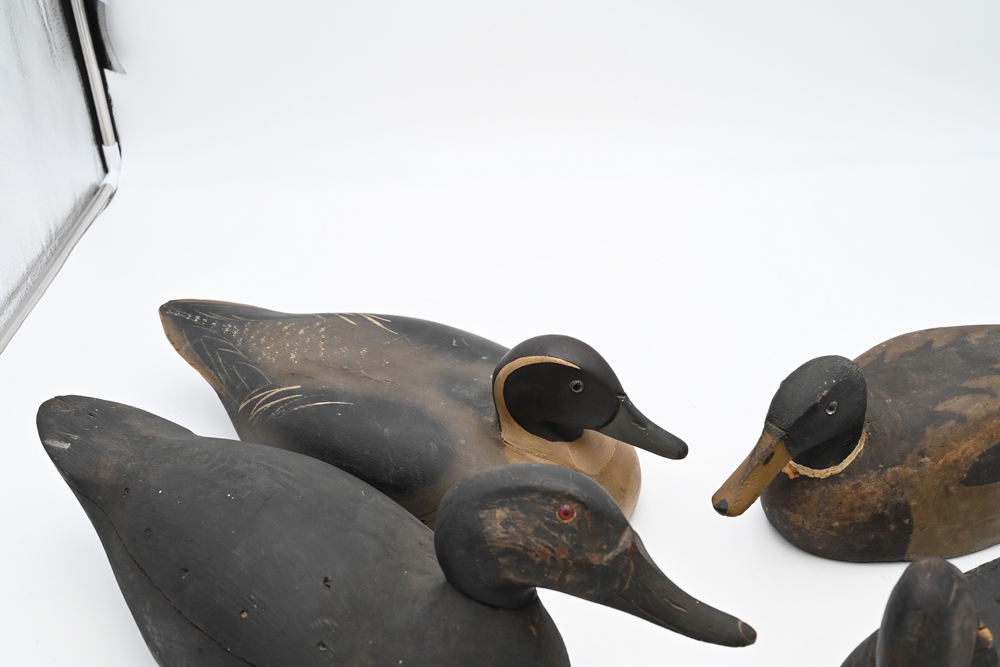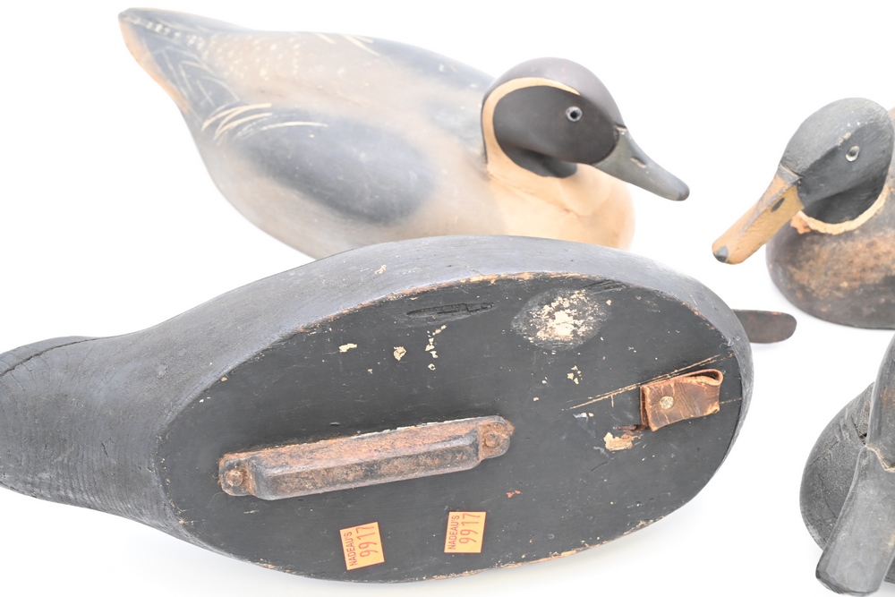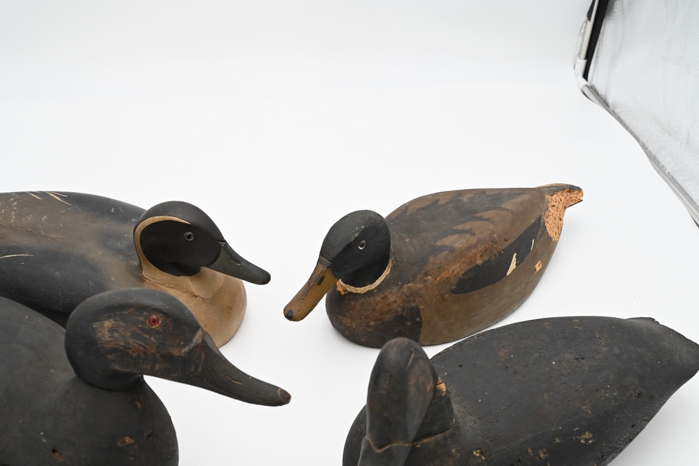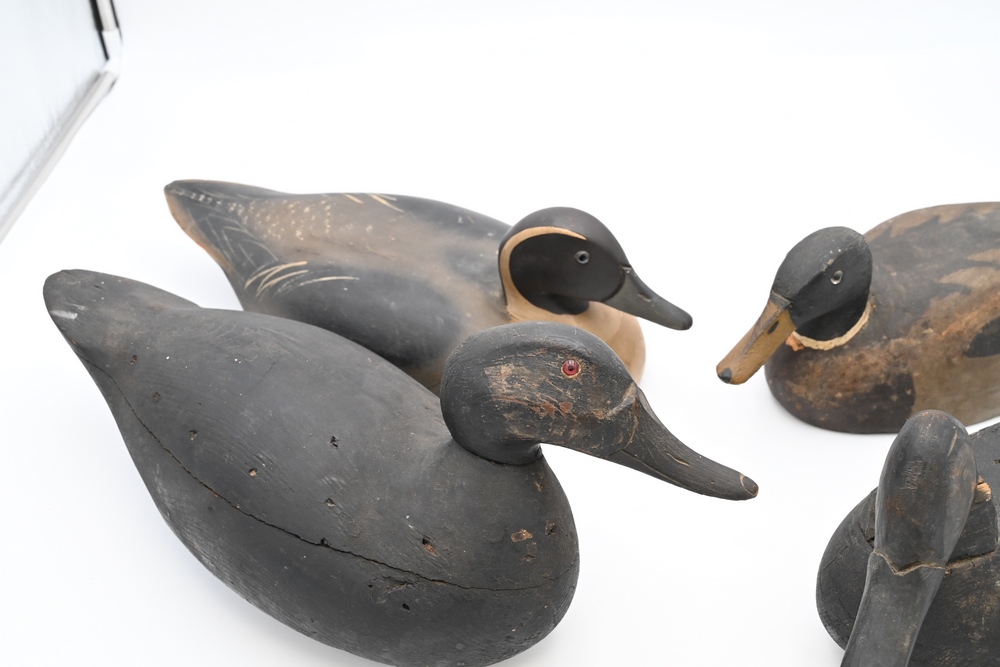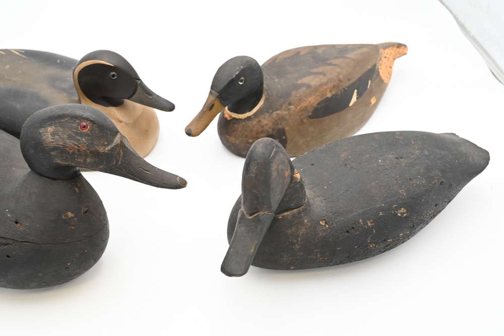 Lot 90: Four Duck Decoys to include early black duck probably New Jersey; Wildfowler Pintail Drake Old Saybrook Factory nicely mellowed with original paint; Mallard Drake having cork body wear to left tail area with original paint; Early Mason Black Duck missing eye, repainted, rare form, original rigging largest in length 17 1/2 inches.