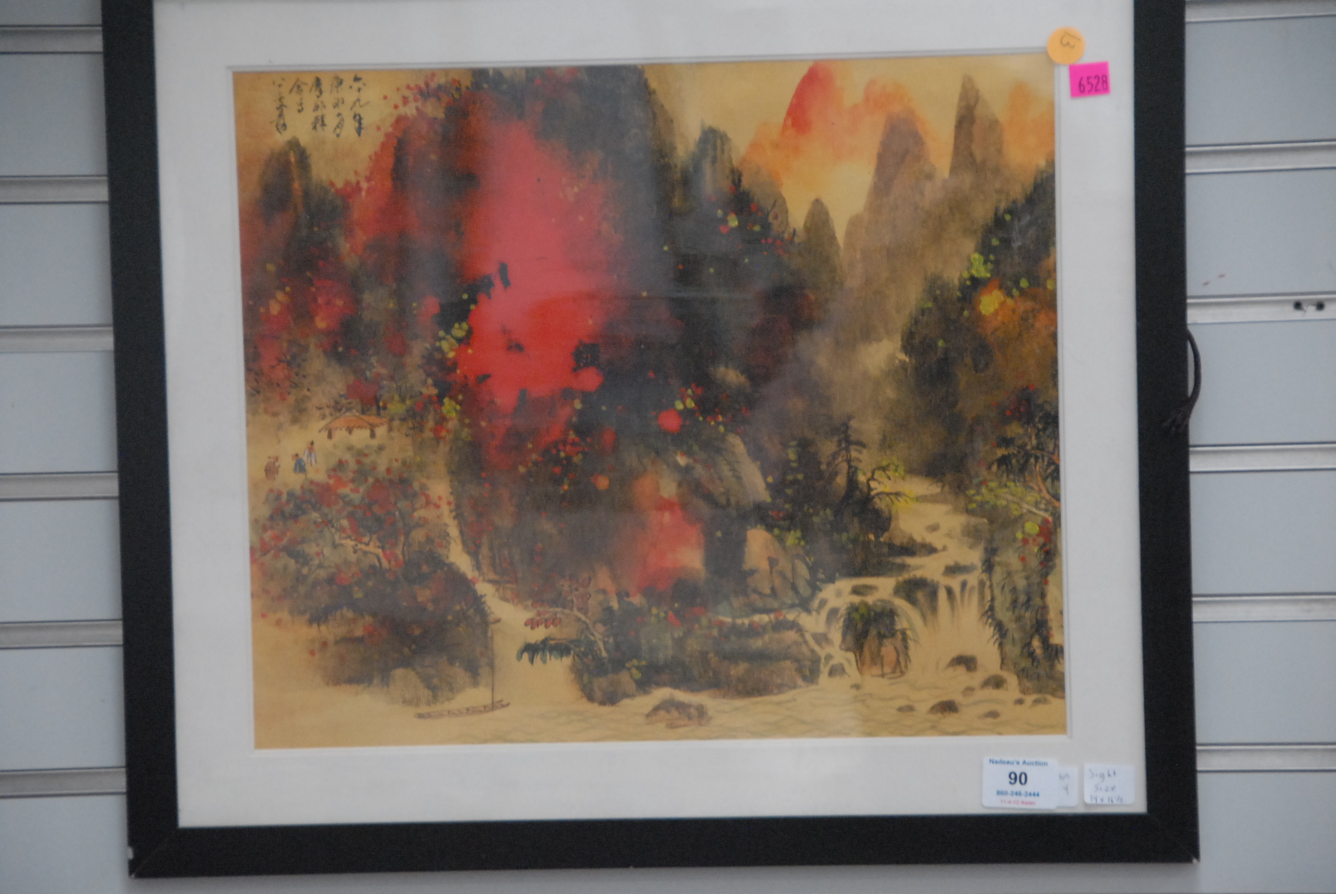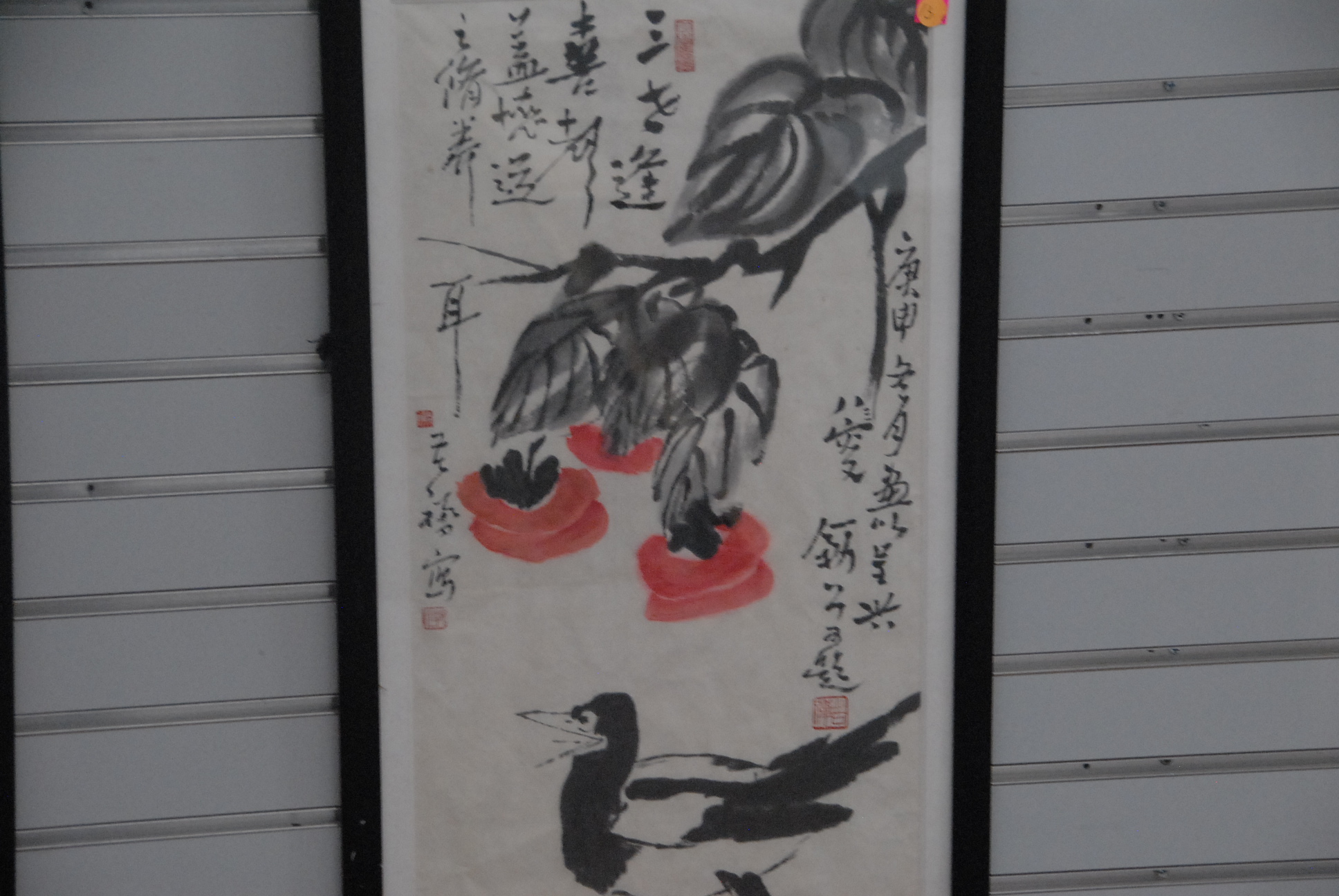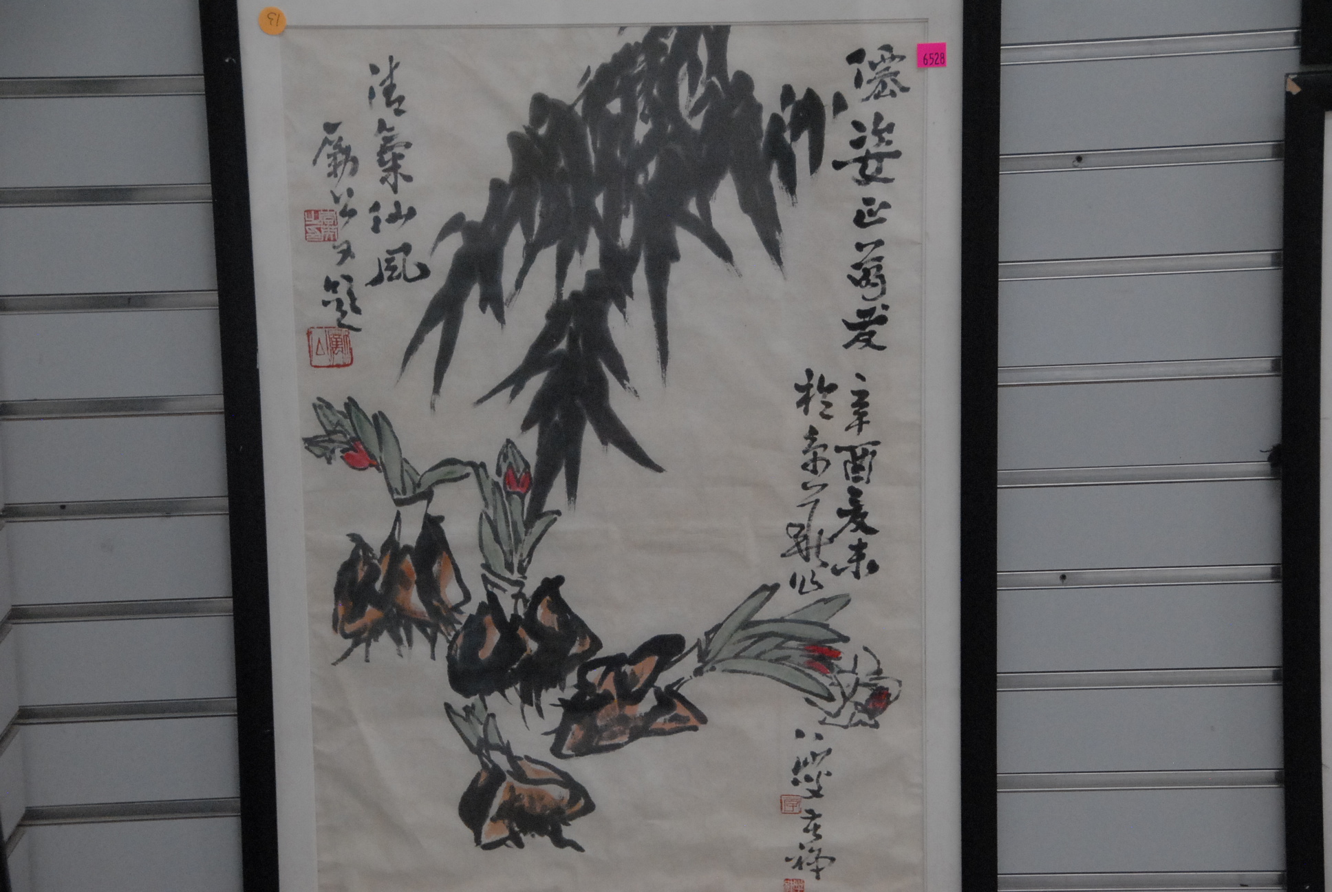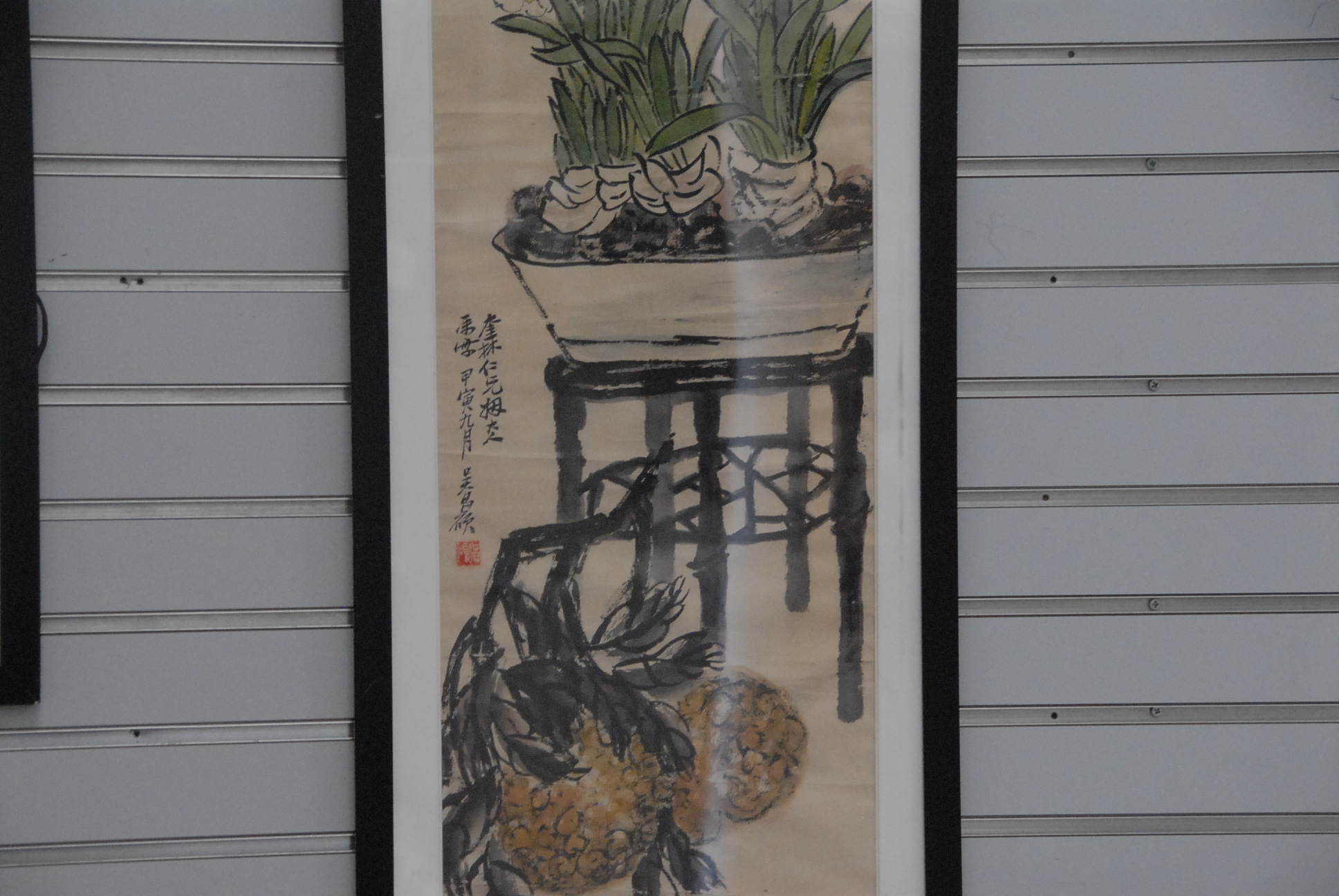 Lot 90: Group of four framed watercolors three still life 31 x 12, 26 x 13 & 26 x 27 and one landscape with red 14 x 16 1/2.