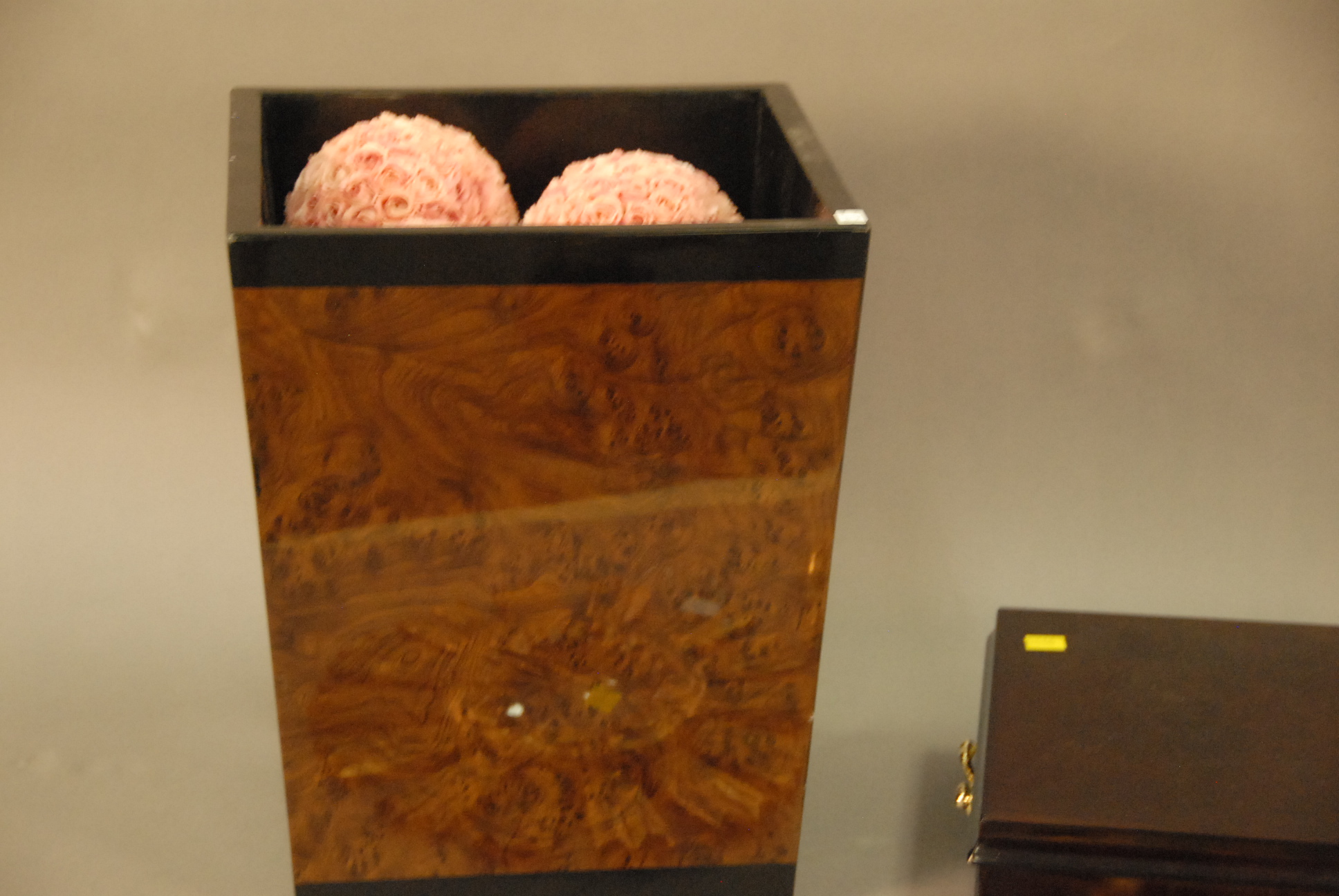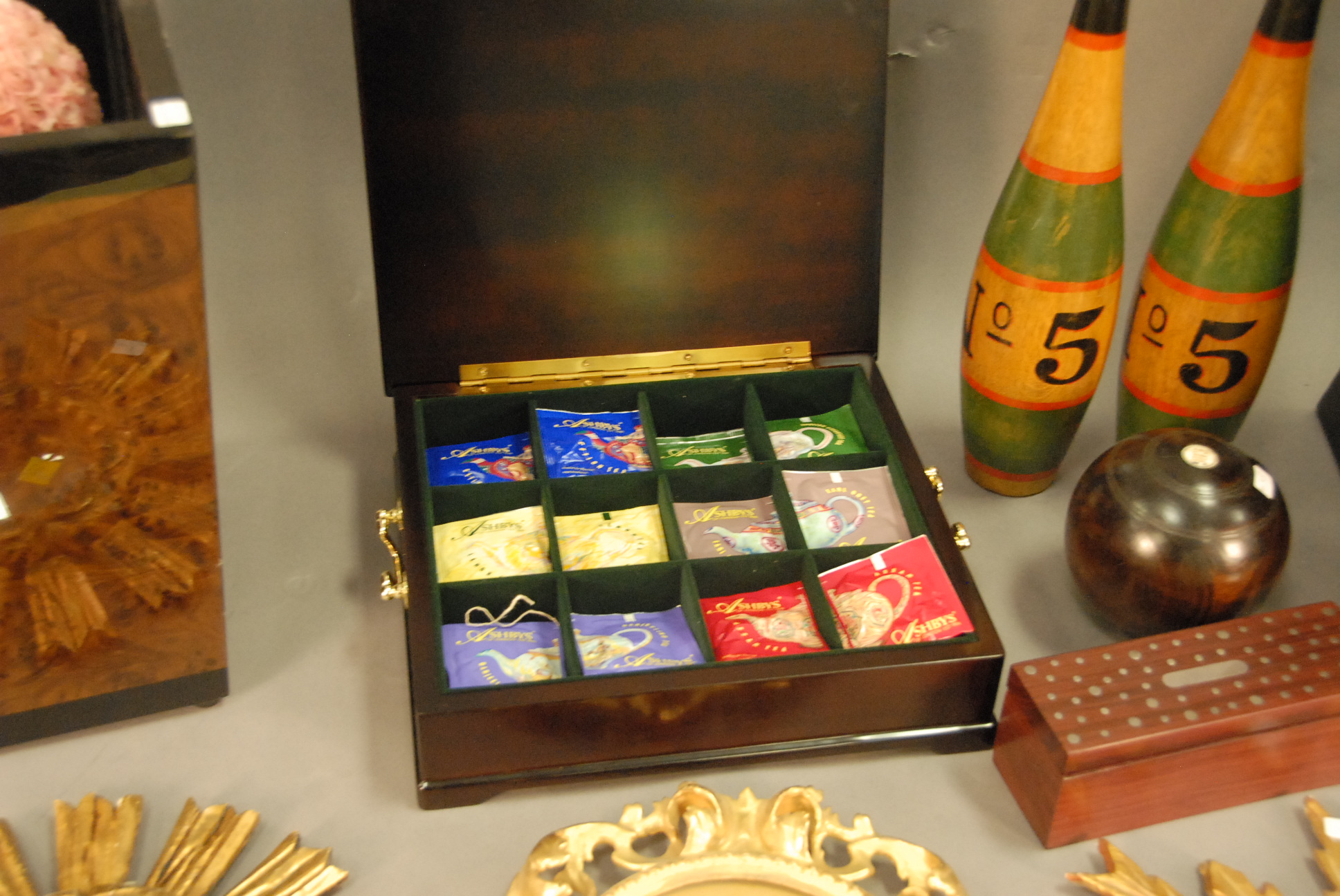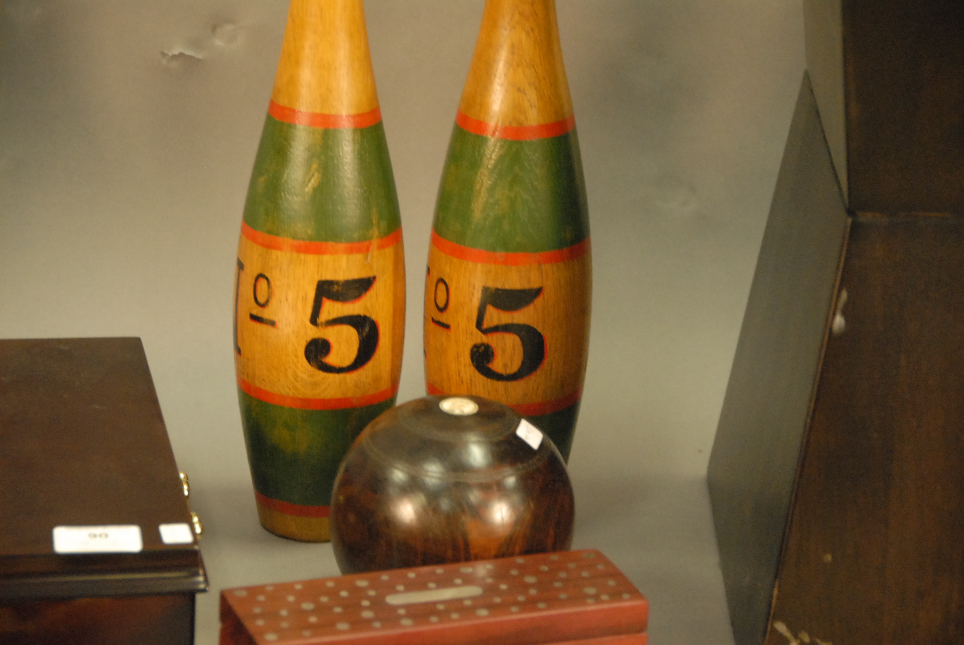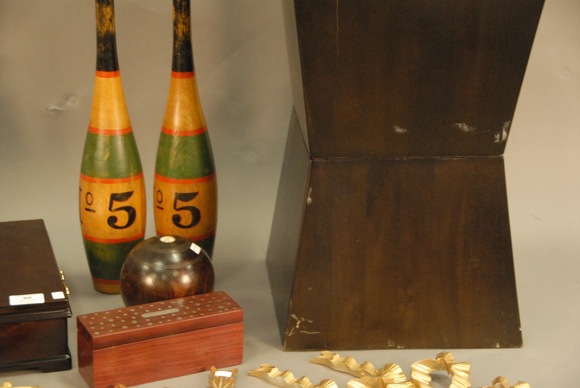 Lot 90: Group to include waste paper wood basket, small stand, tea box, bowling ball and pins, and five small gilt pieces.