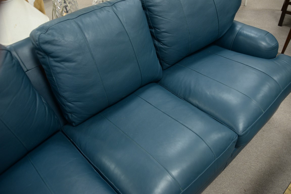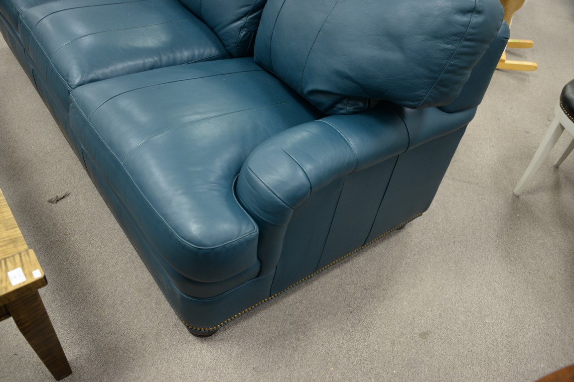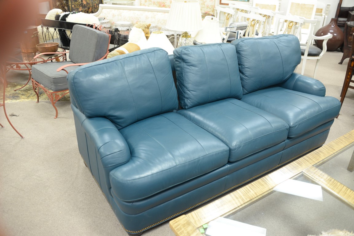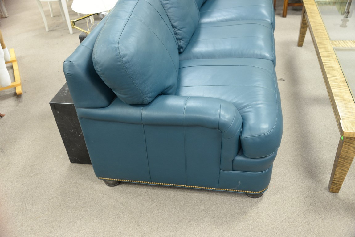 Hancock & Moore green leather upholstered sleeper sofa, excellent condition, lg. 80in.