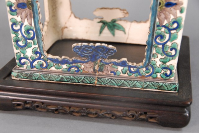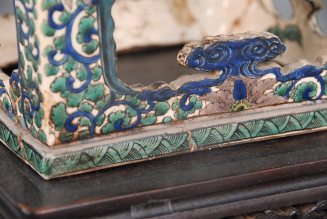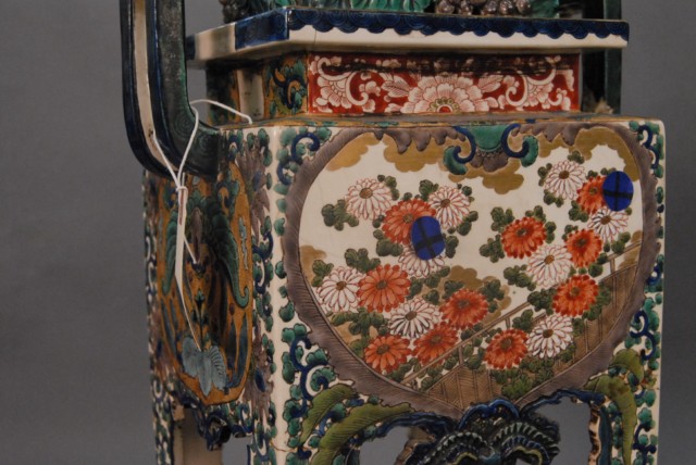 Large porcelain Famille-verte footed censor having winged horse finial on the cover, 2 looped handles mounted onto square body. As is