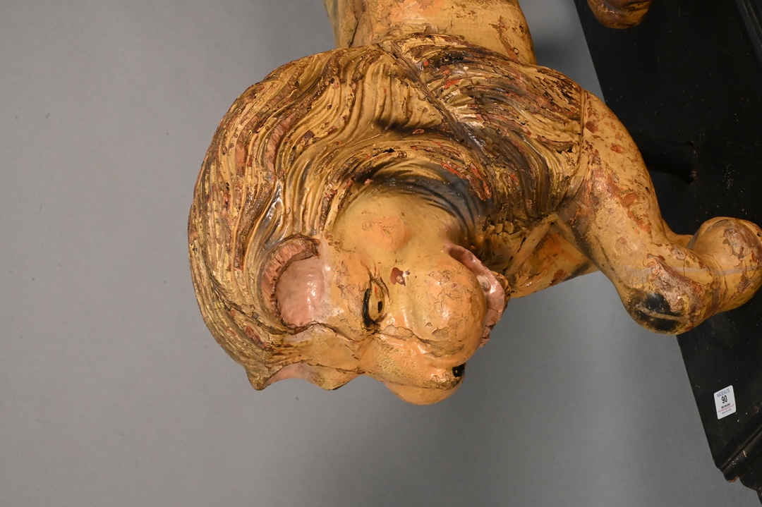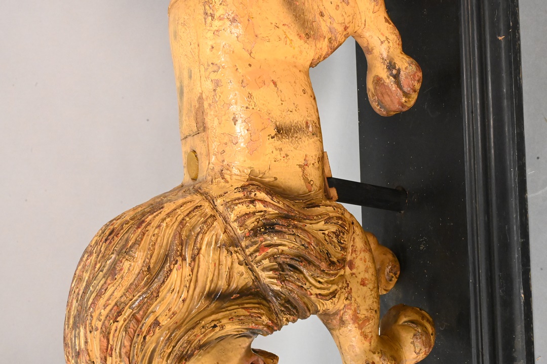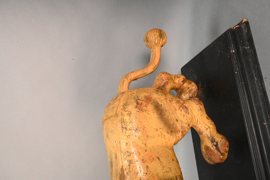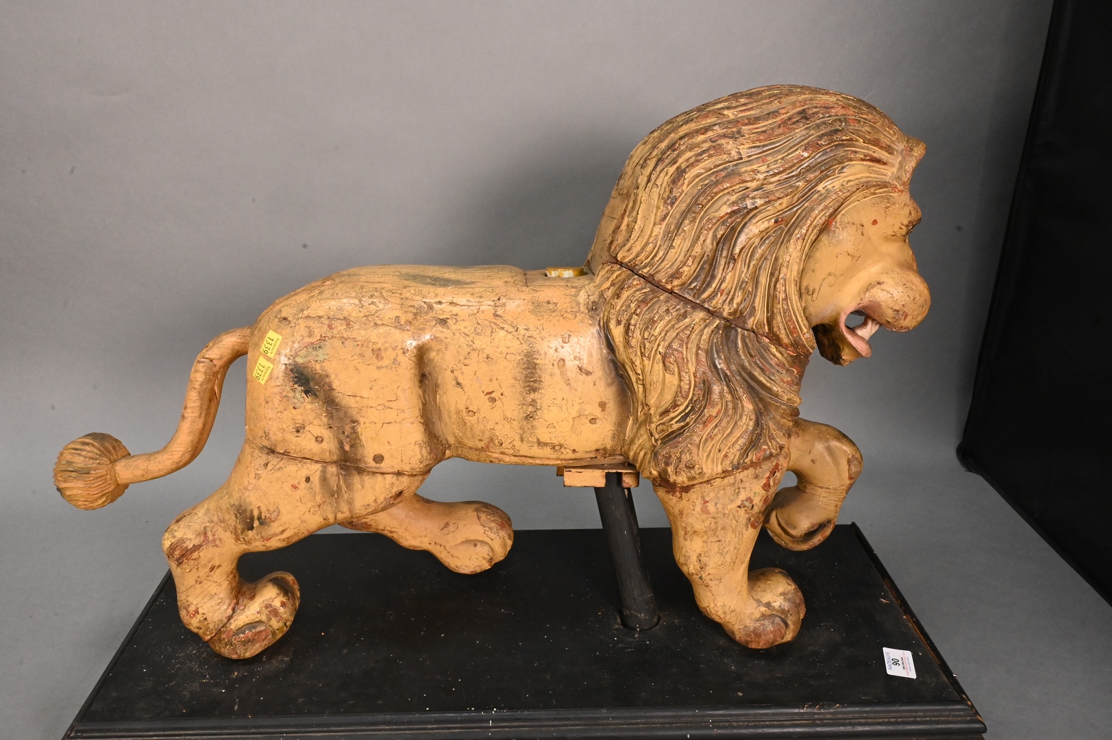 Lion Carousel Diminutive Figure, retaining some old paint, now on wooden base, height 20 inches, length 34 inches.