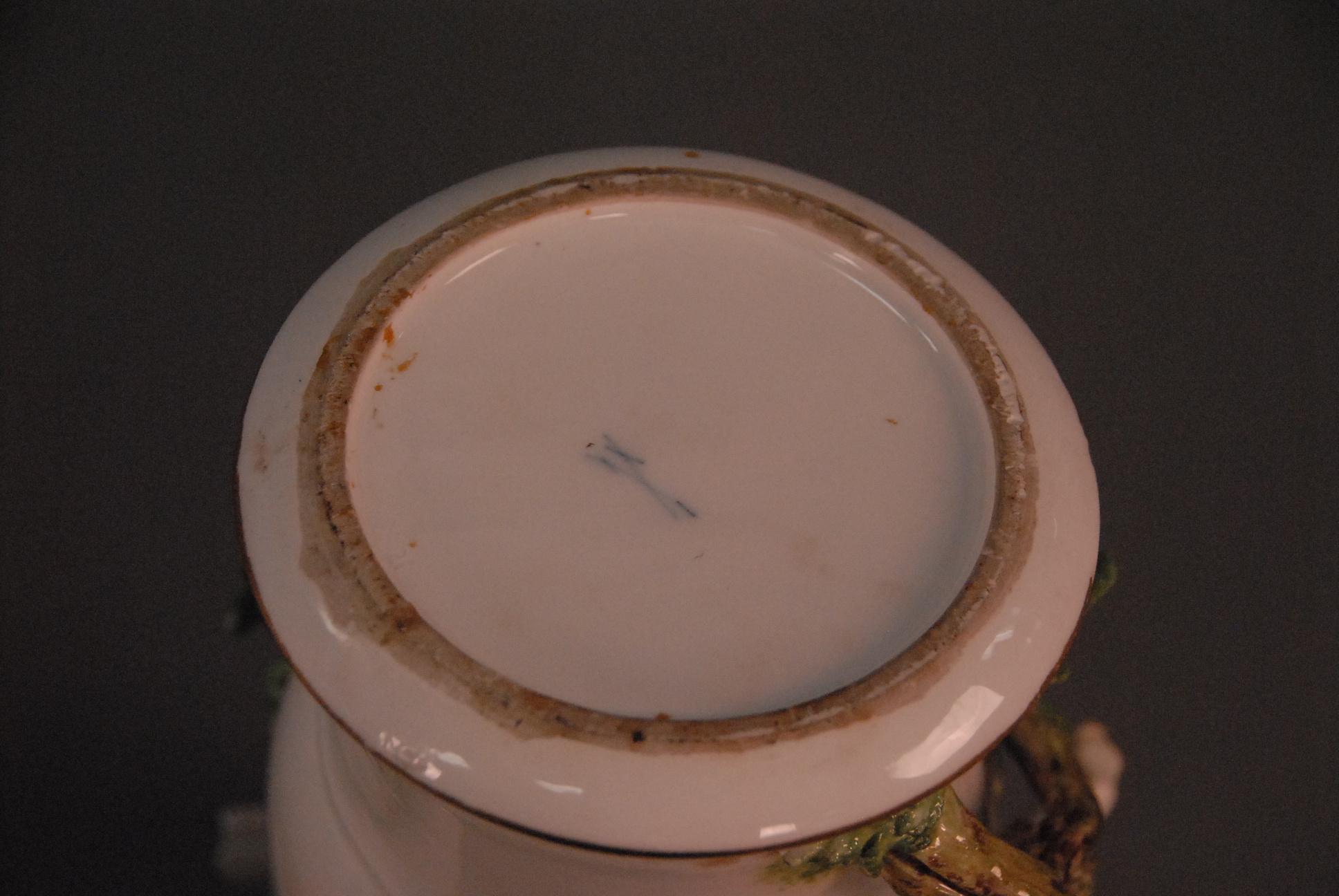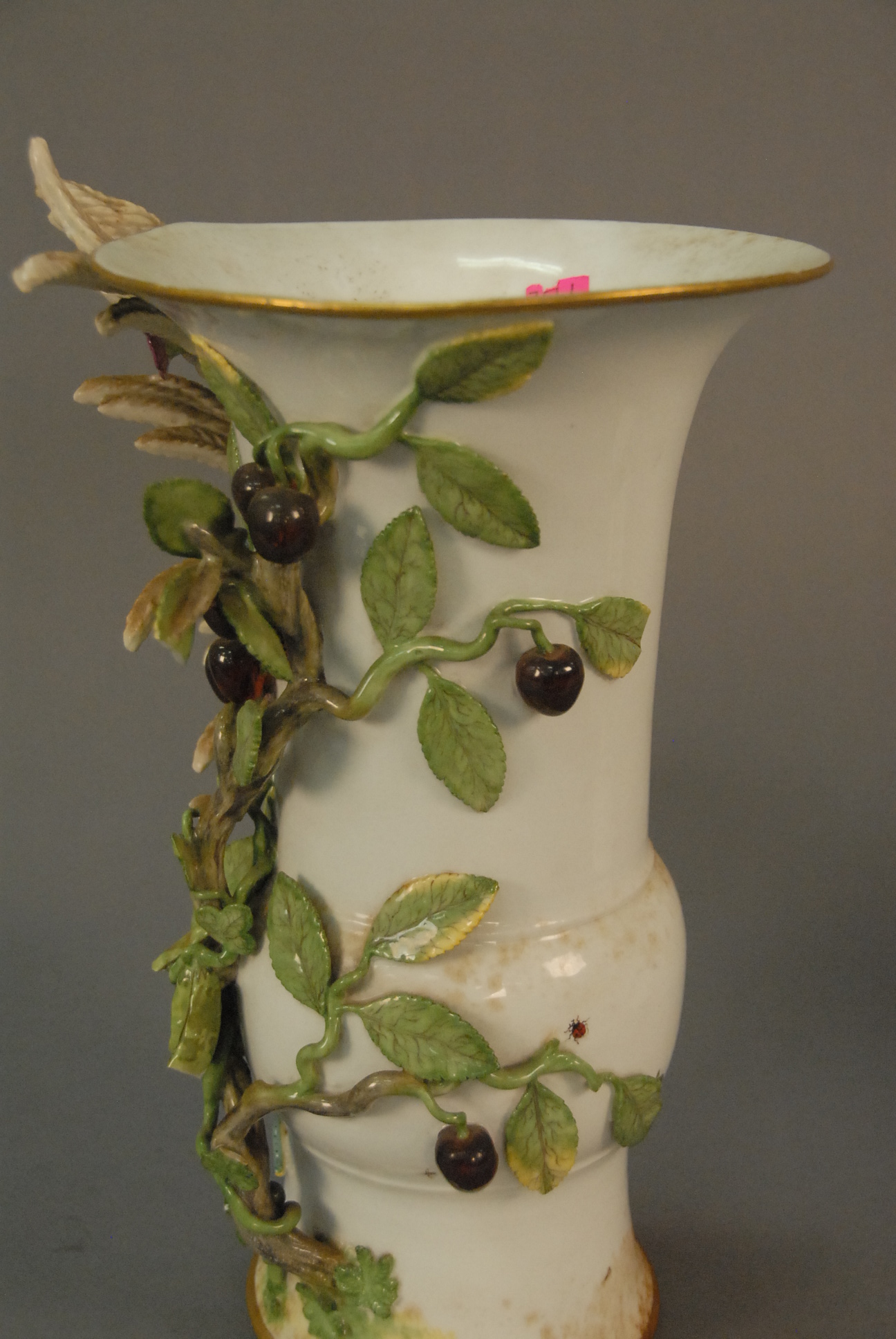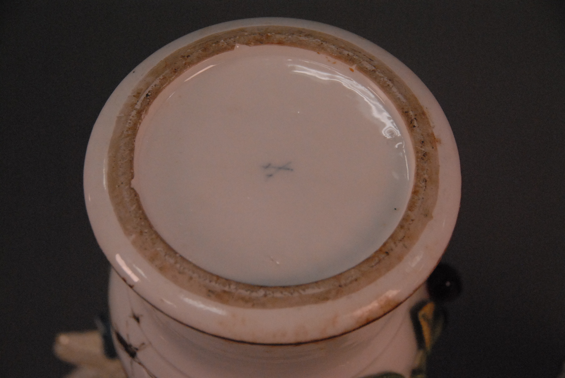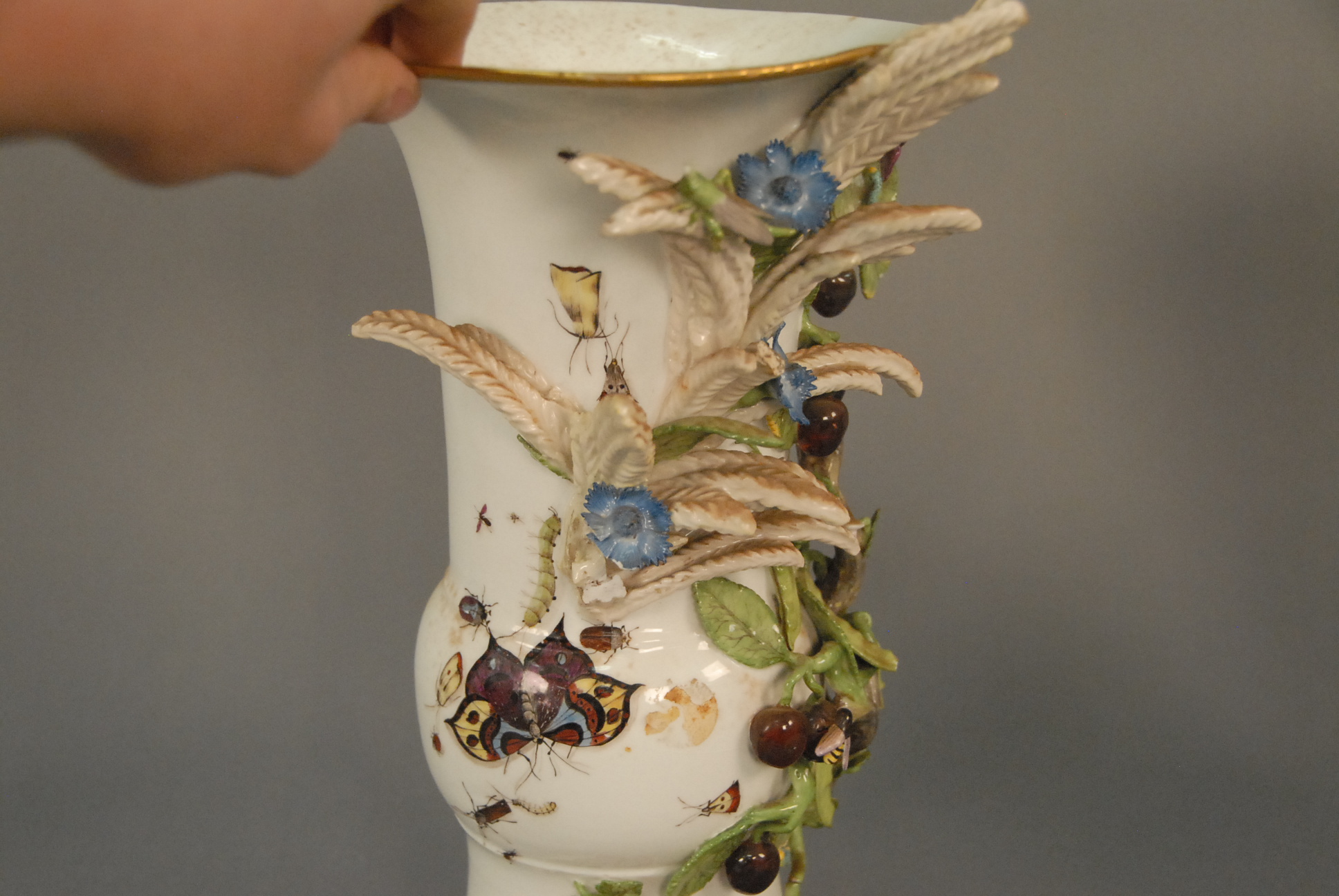 Lot 90: Meissen two piece vases lot to include porcelain vase mounted with three dimensional flowers and fruit and painted butterflies and bugs and vase mounted with three dimensional bird, cherub, vines and grapes with painted bugs, each marked with crossed