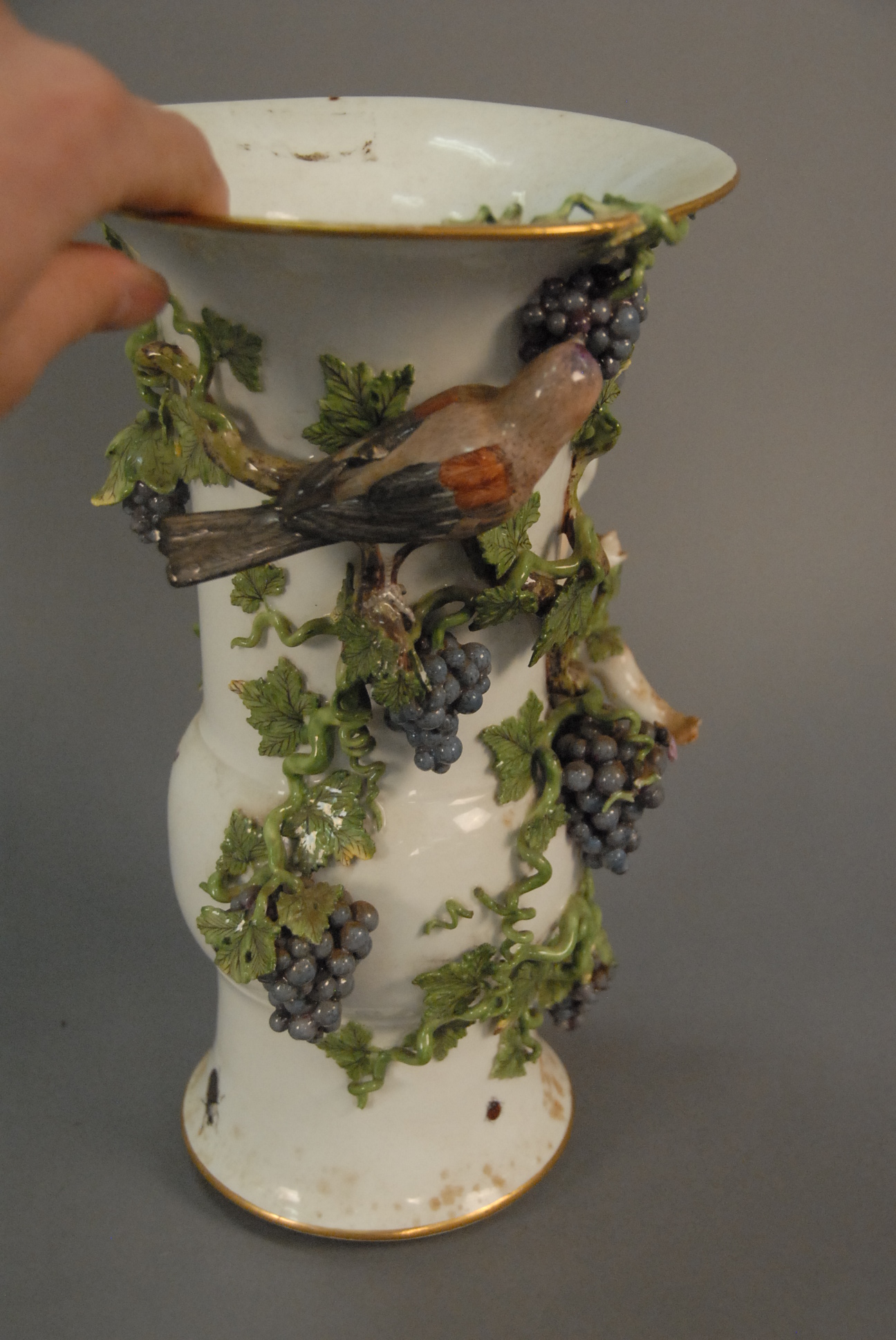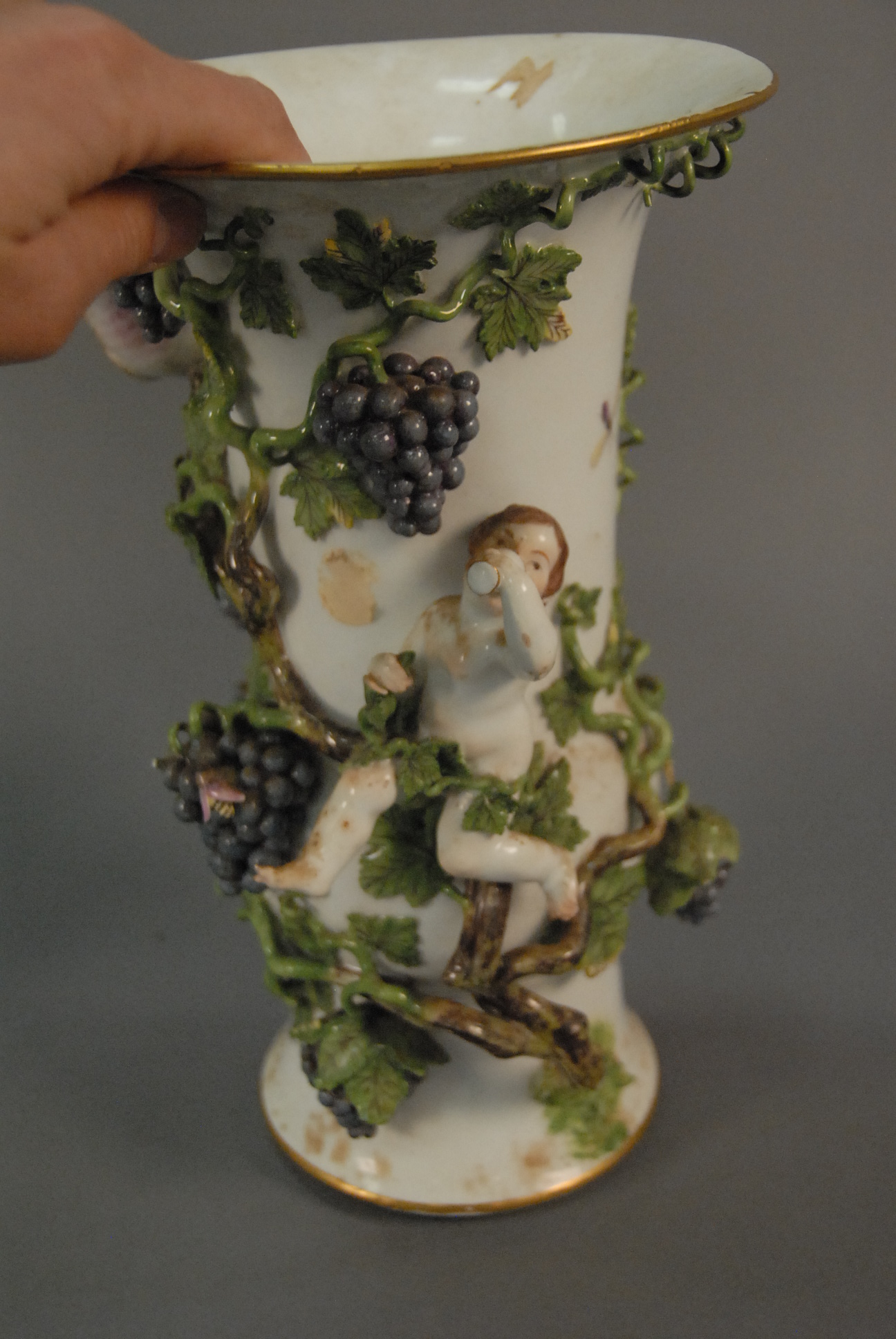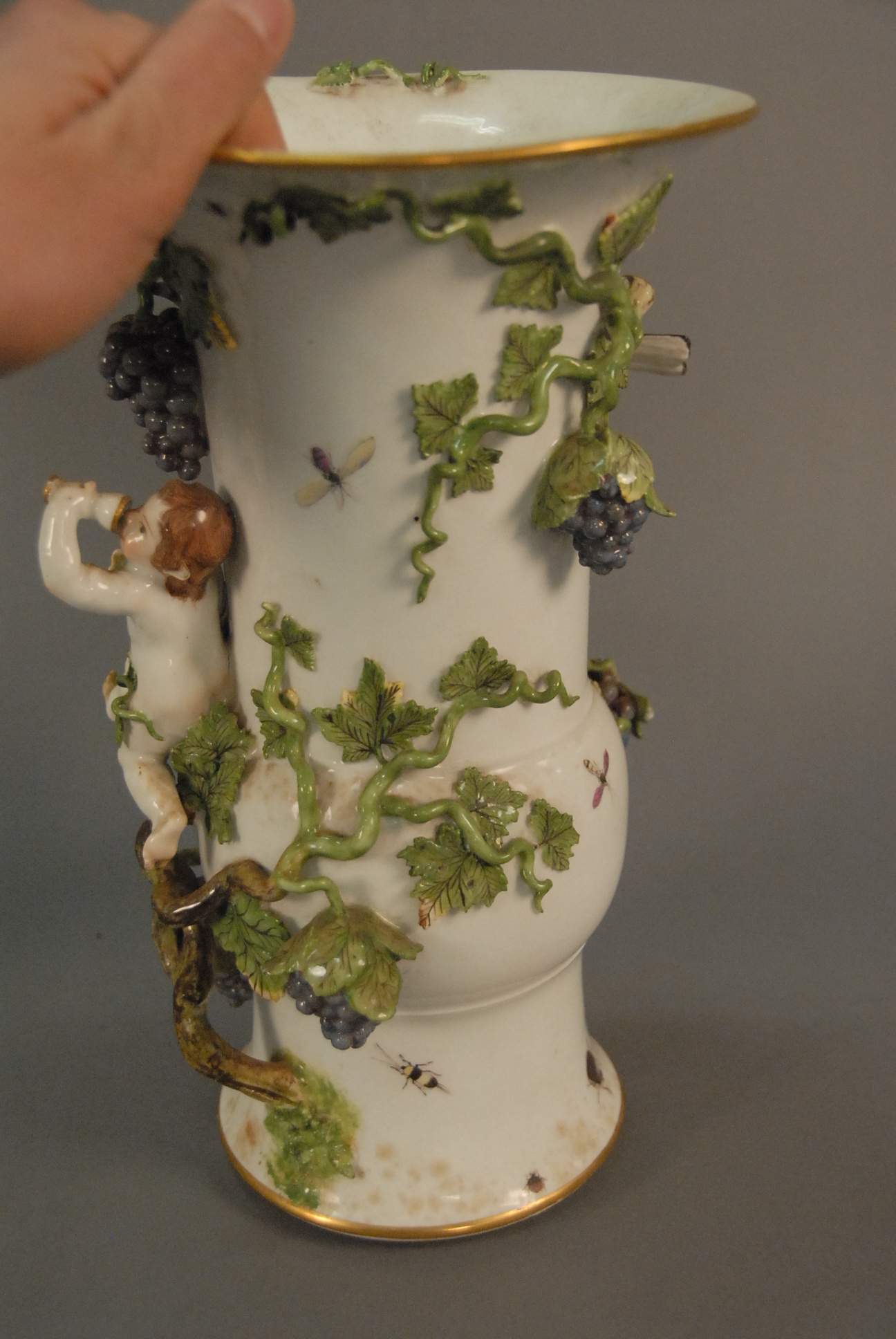 Meissen two piece vases lot to include porcelain vase mounted with three dimensional flowers and fruit and painted butterflies and bugs and vase mounted with three dimensional bird, cherub, vines and grapes with painted bugs, each marked with crossed swords, late 19th to early 20th century minor imperfections. hts. 13in.