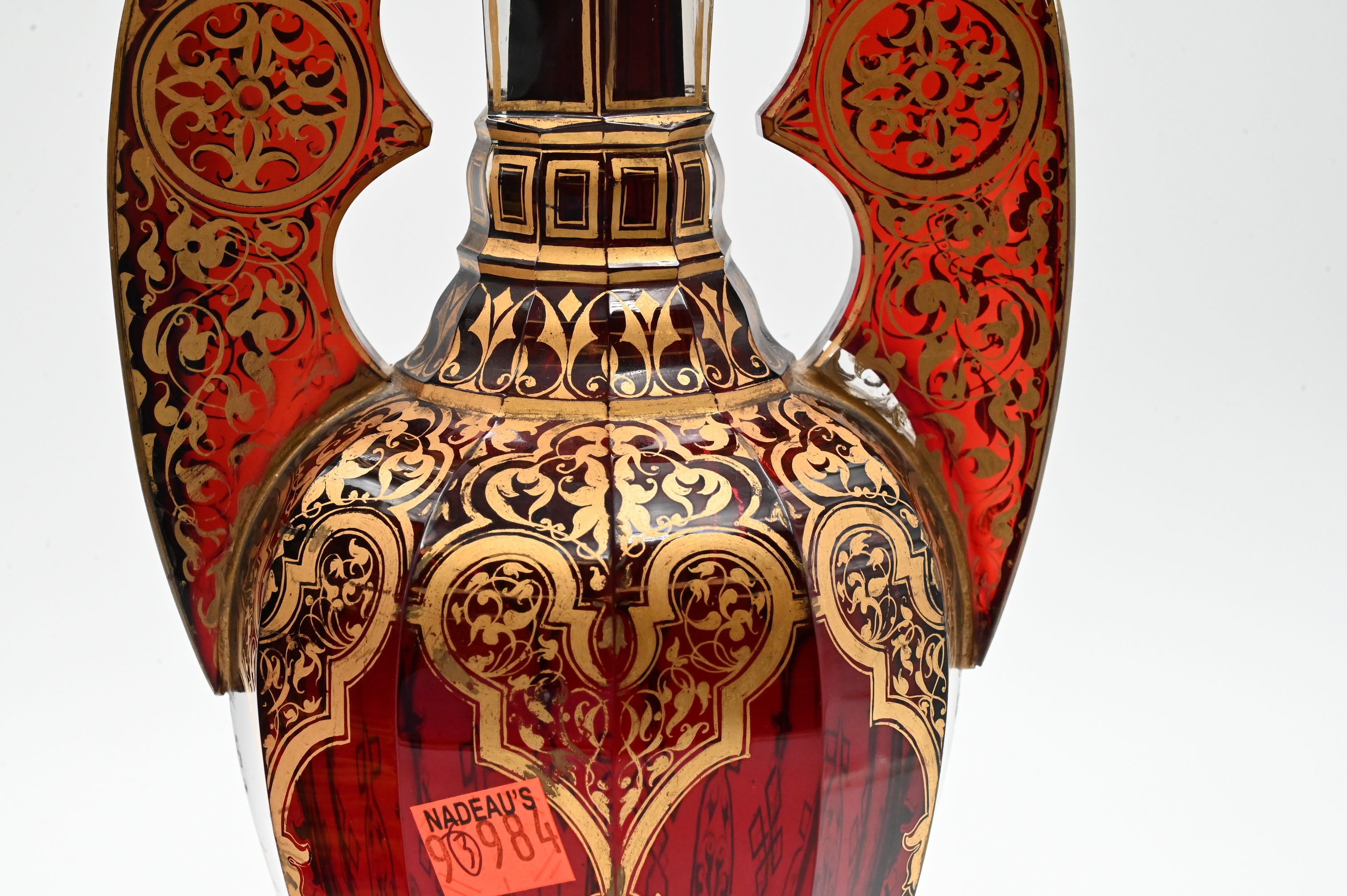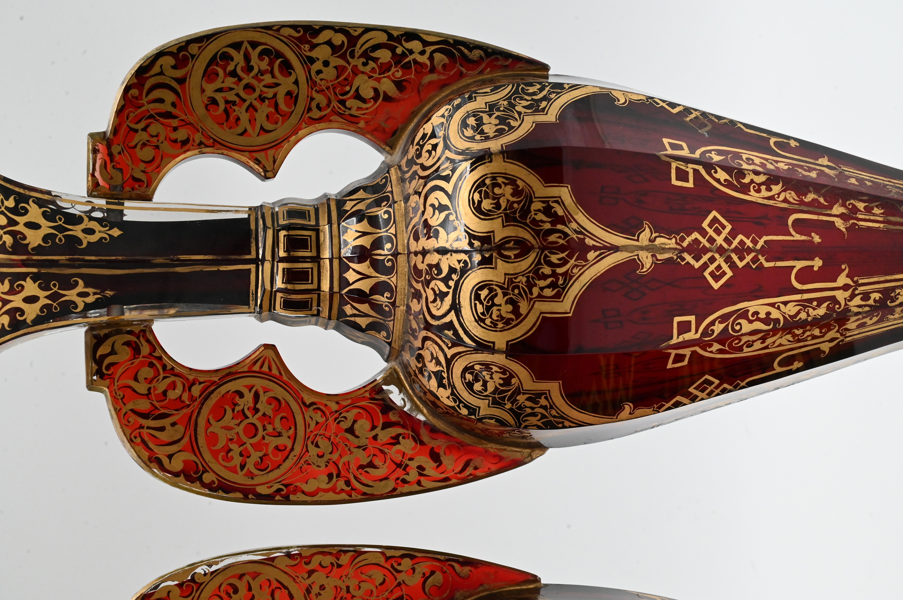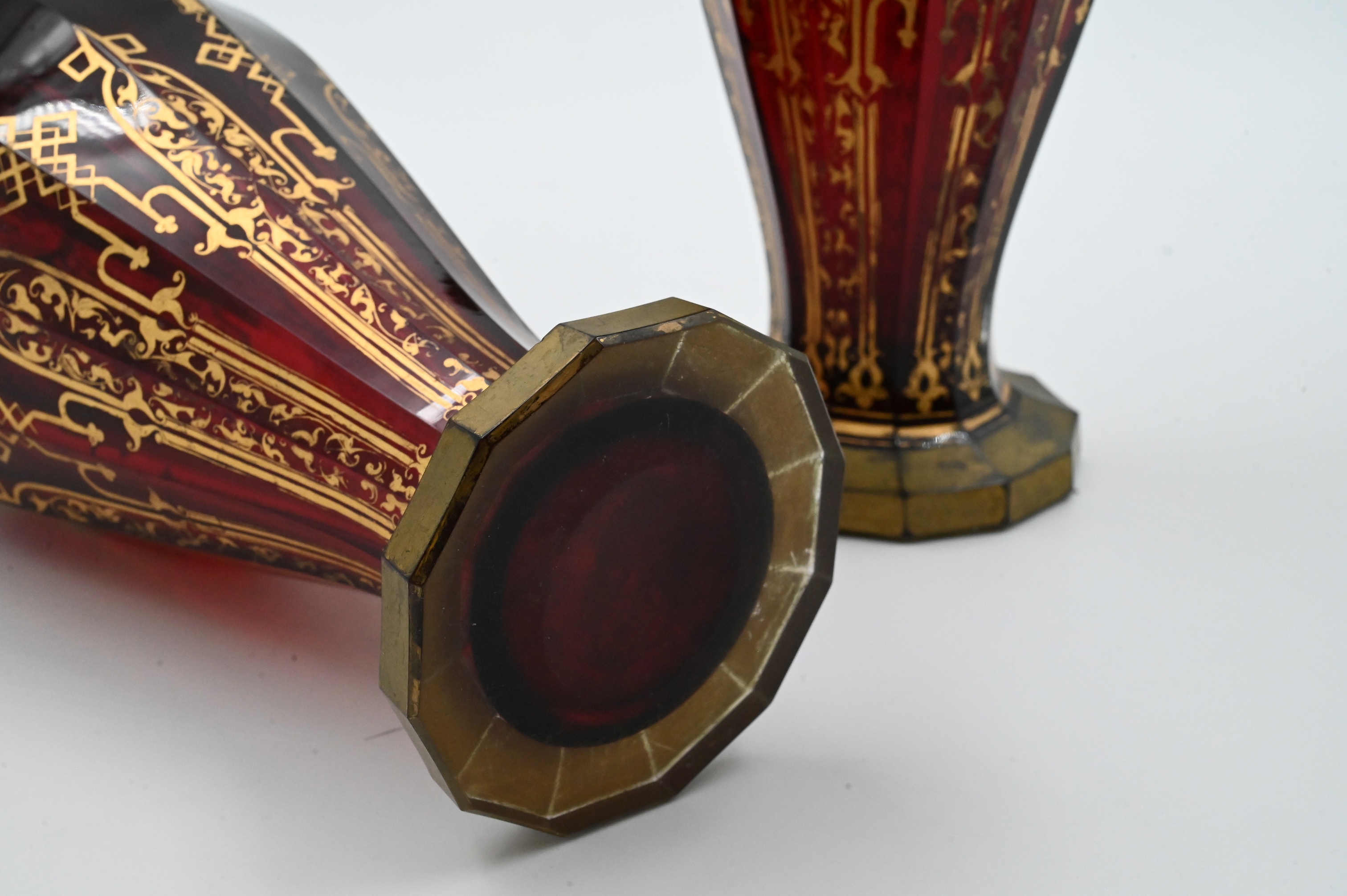Pair of Bohemian Moorish Style Gilt and Ruby Glass Vases
