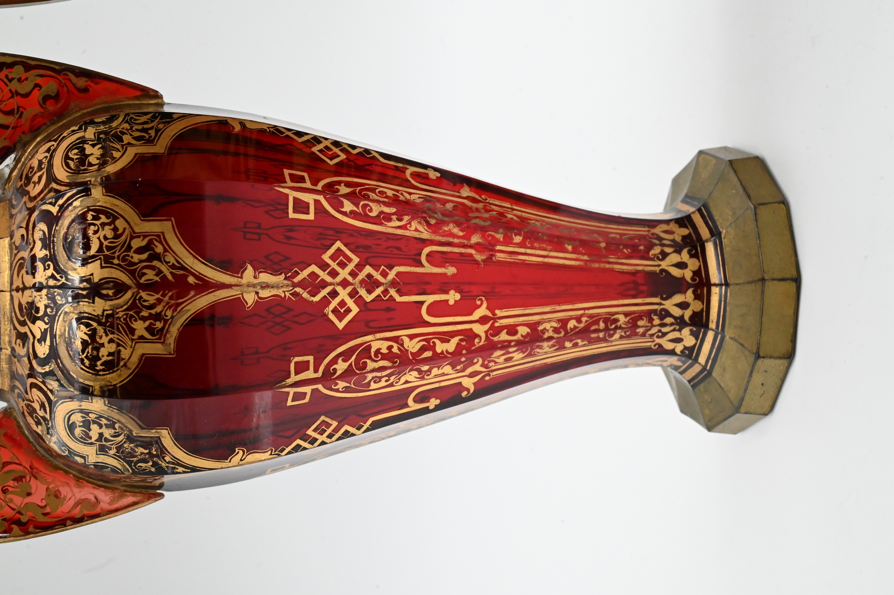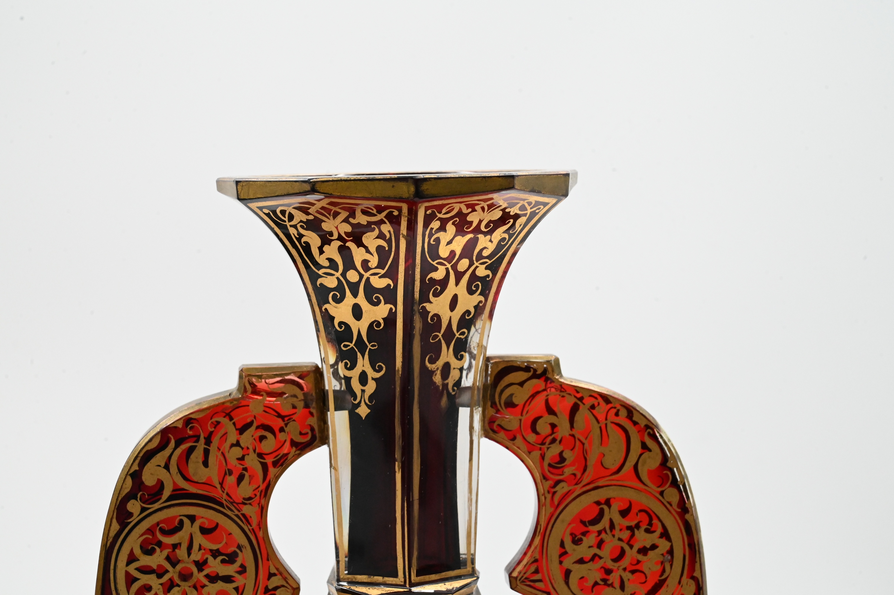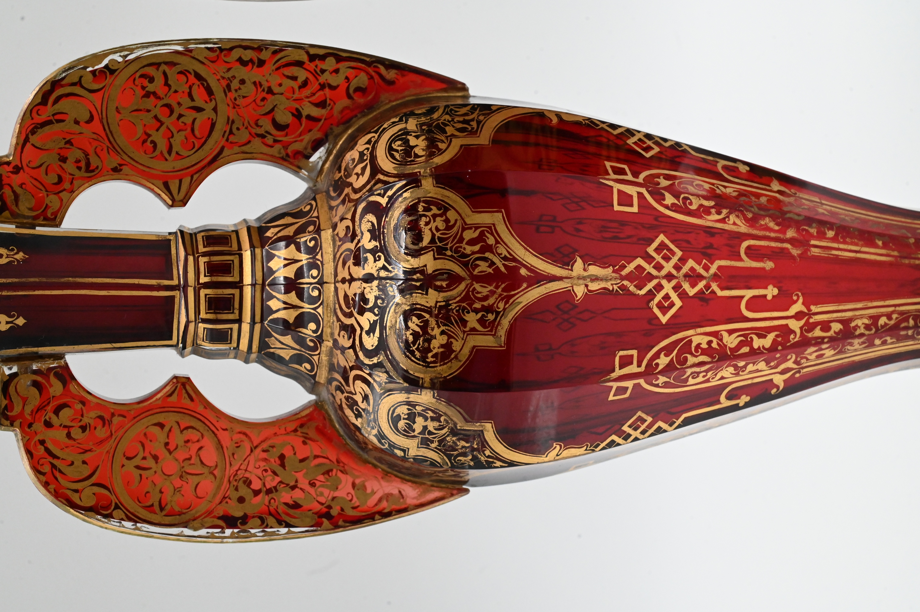 Pair of Bohemian Moorish Style Gilt and Ruby Glass Vases