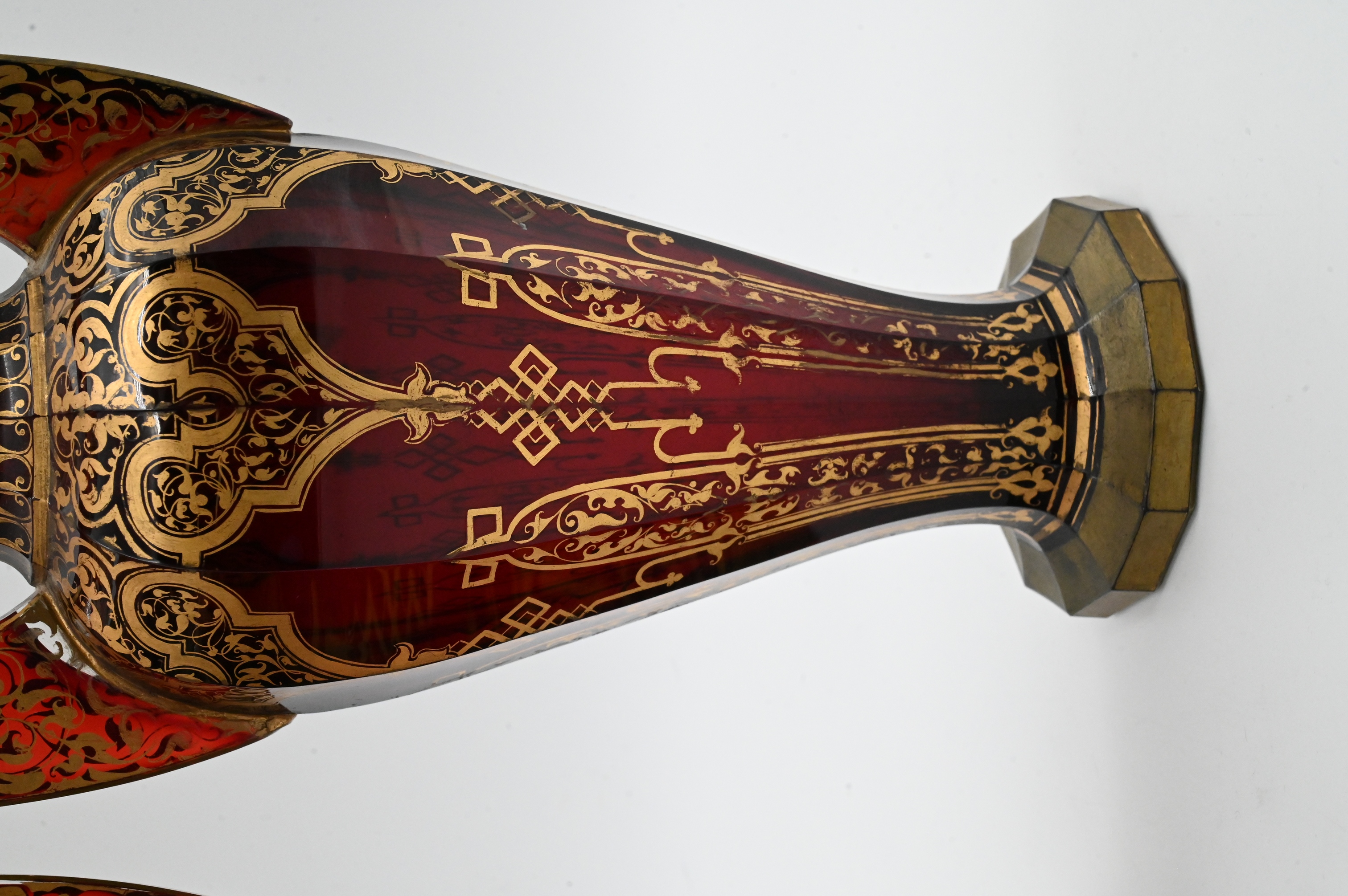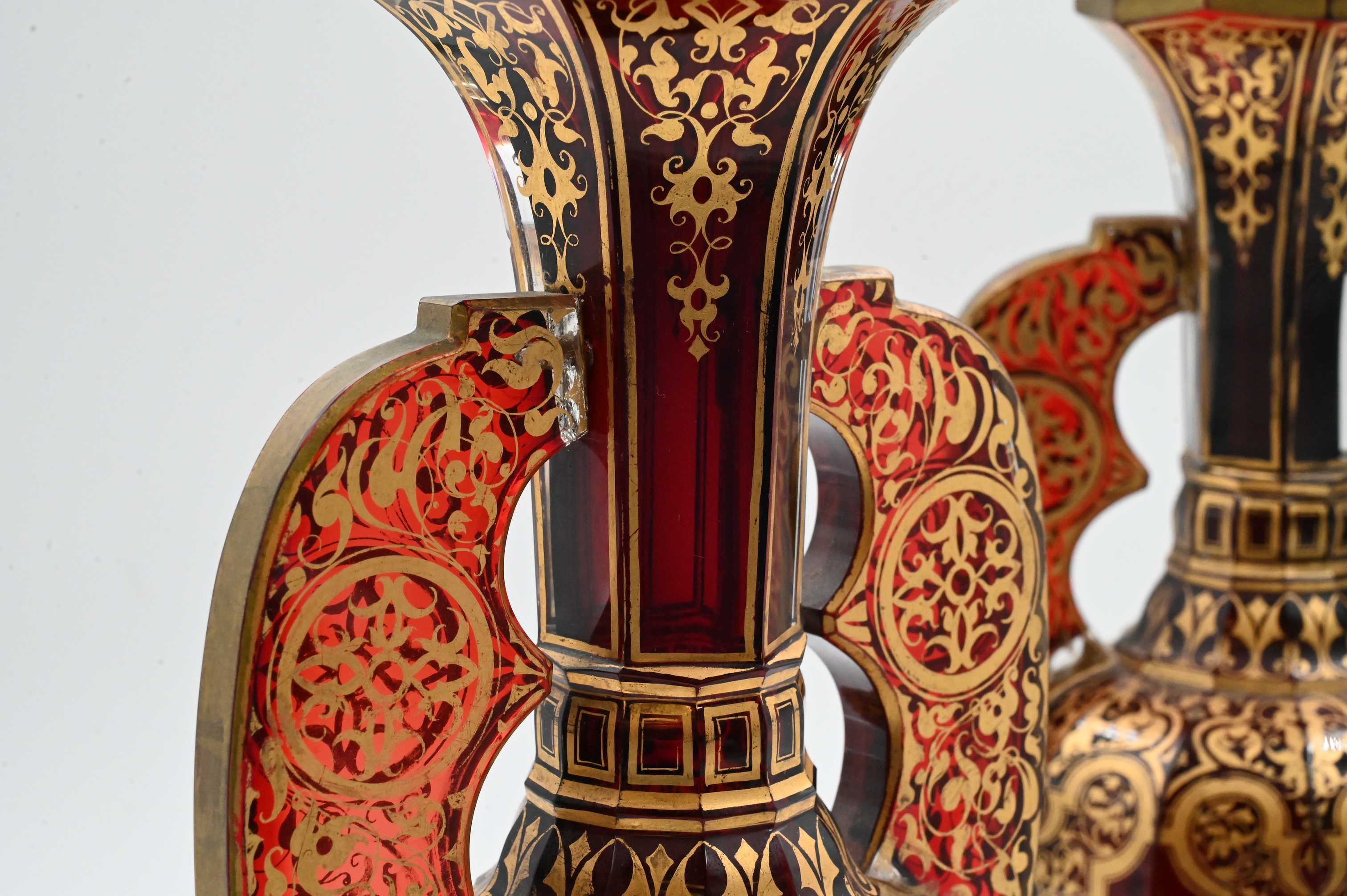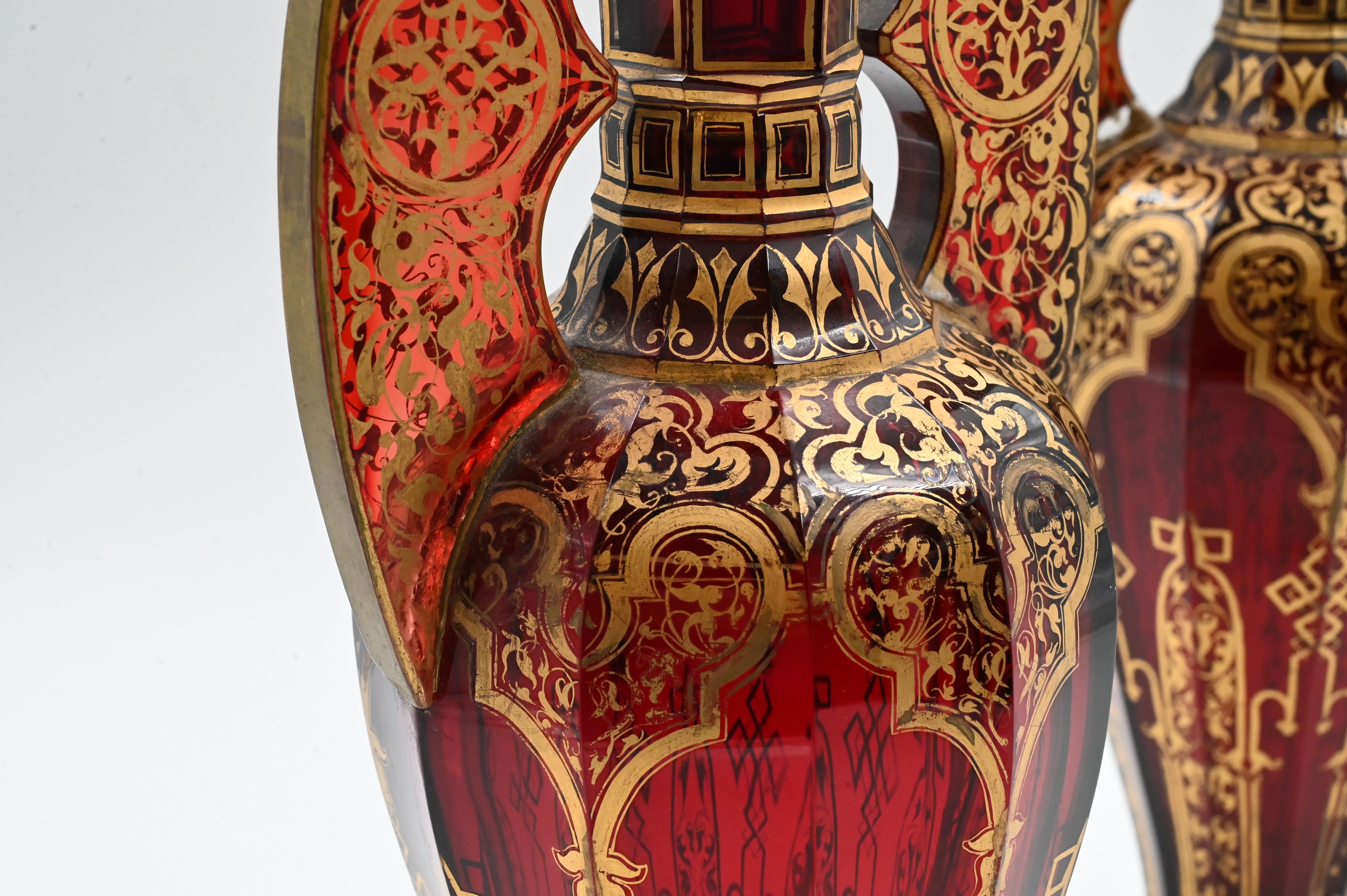 each tall faceted ruby glass vase finely decorated in raised and burnished gilt with elaborate Neo-Gothic and Moorish-inspired motifs, the shaped handles similarly adorned with scrolling and roundel patterns, octagonal gilt-metal mounted bases, rich color and intricate giltwork throughout