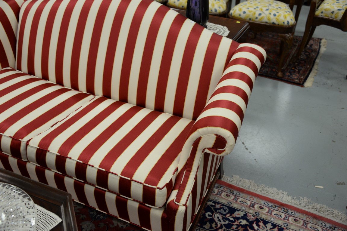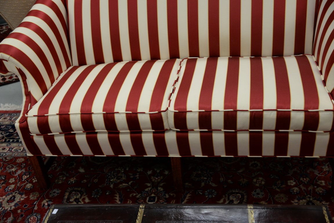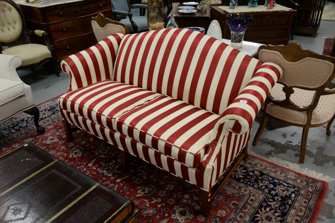 Lot 90: Pair of upholstered Chippendale style loveseats with camel backs, upholstery in excellent condition. lg. 60 in.