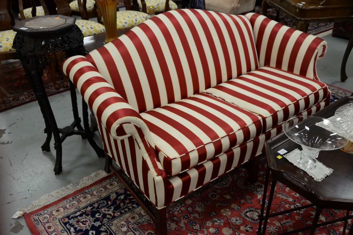 Pair of upholstered Chippendale style loveseats with camel backs, upholstery in excellent condition. lg. 60 in.