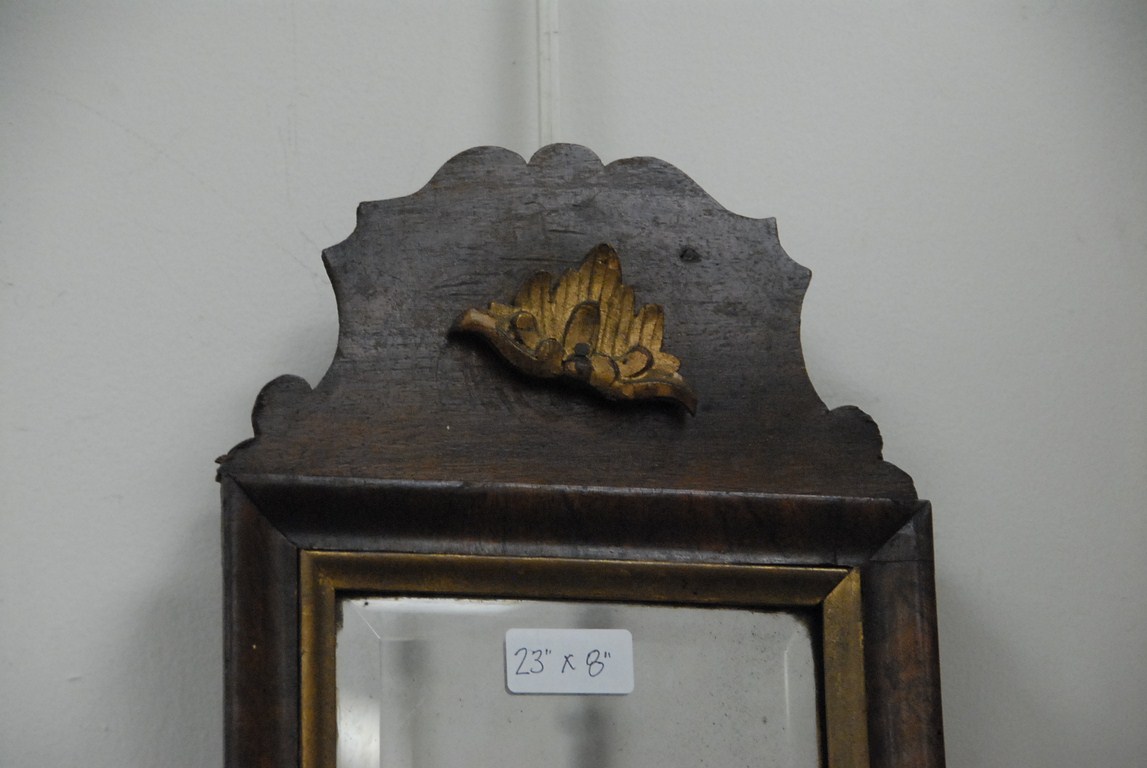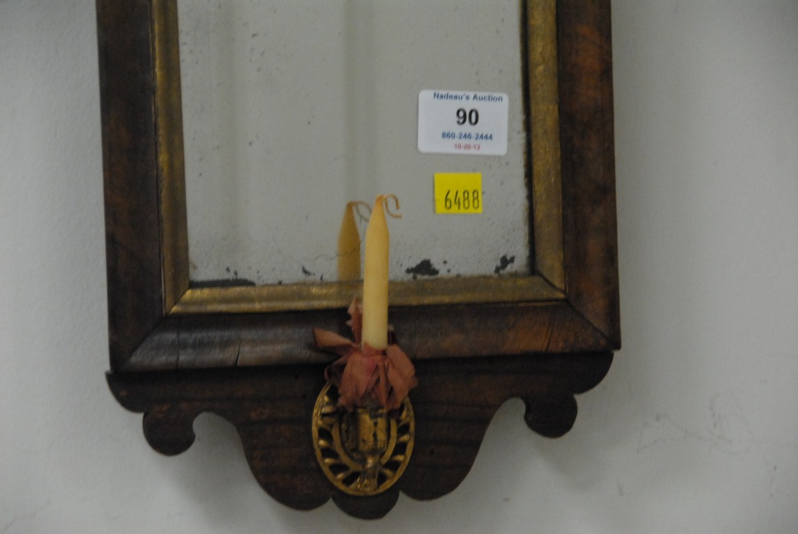 Lot 90: Queen Anne walnut mirror with bevel glass and candle holder with original back board. ht. 23in. wd. 8in. Provenance: Estate of Ju…..