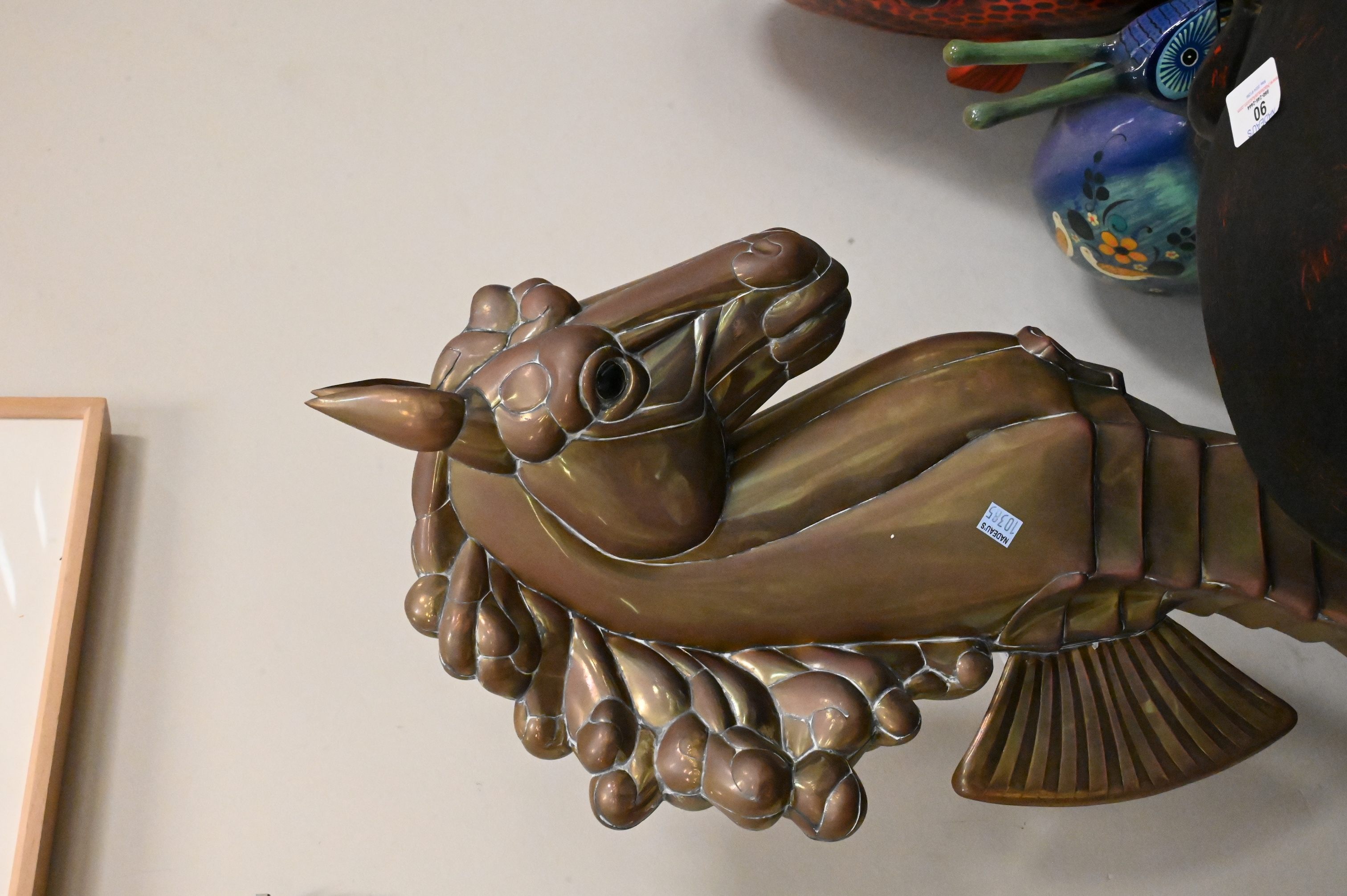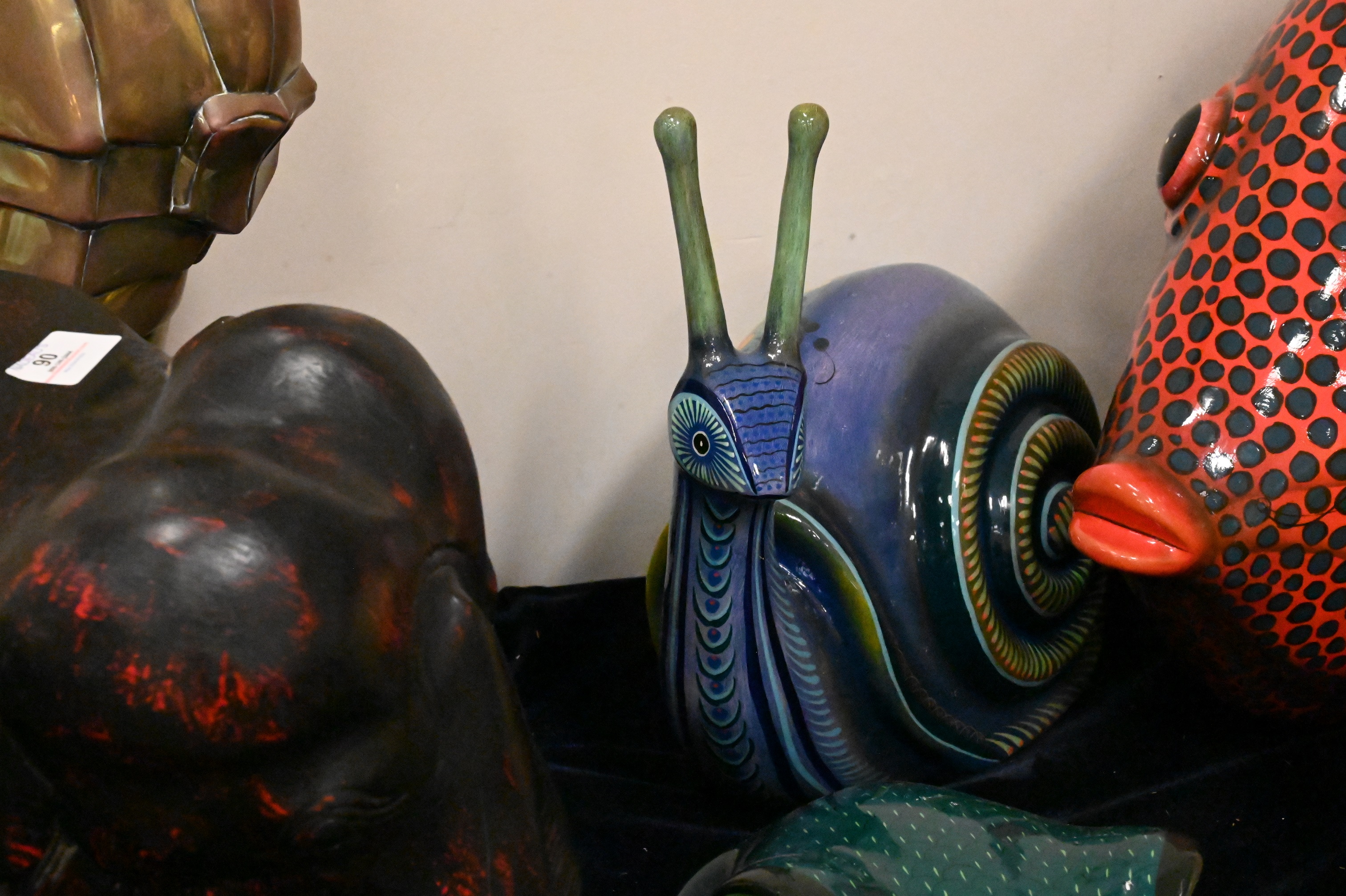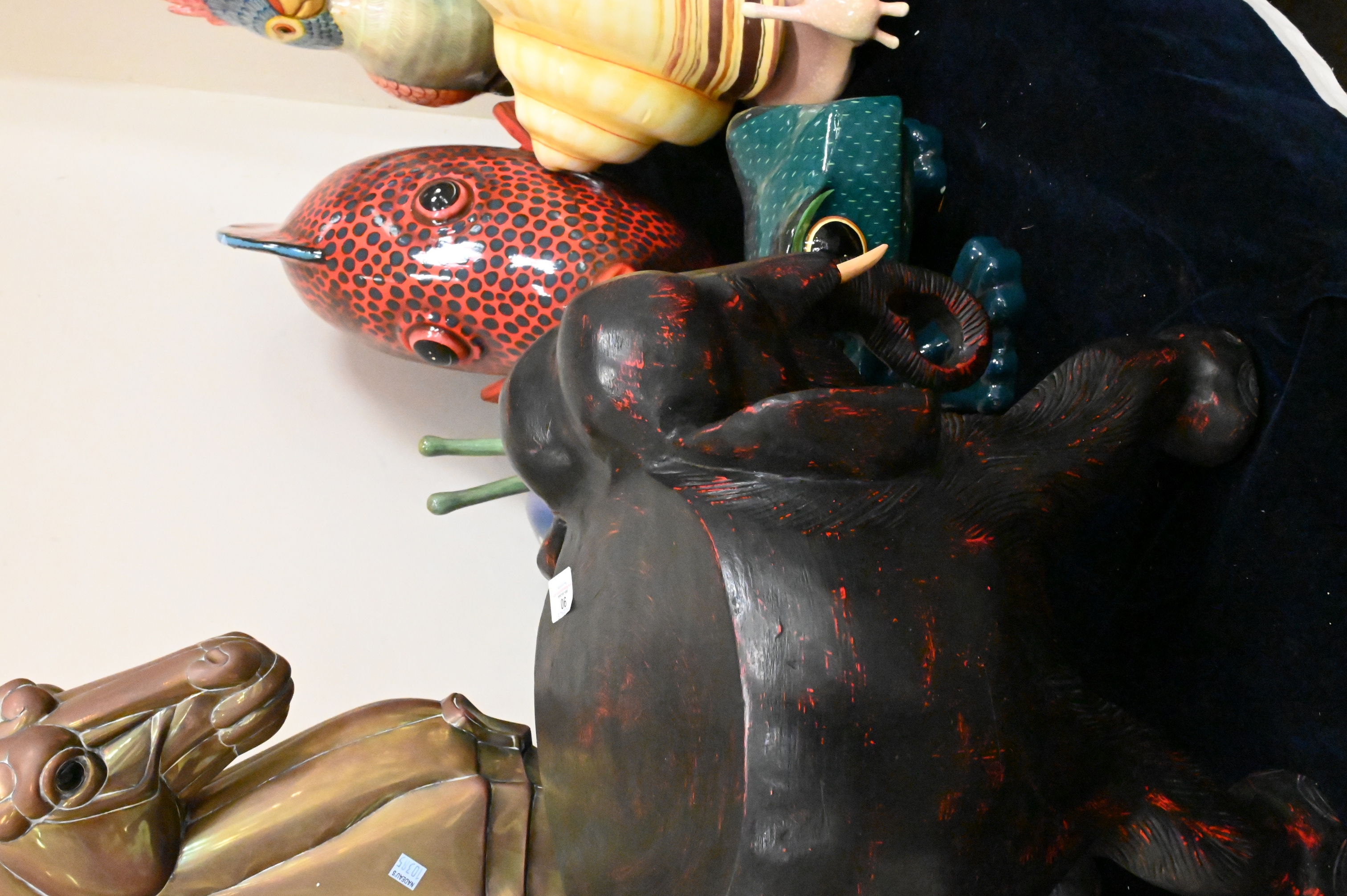 to include five paper mache animals signed illegibly, brass seahorse, Maitland Smith elephant stool
